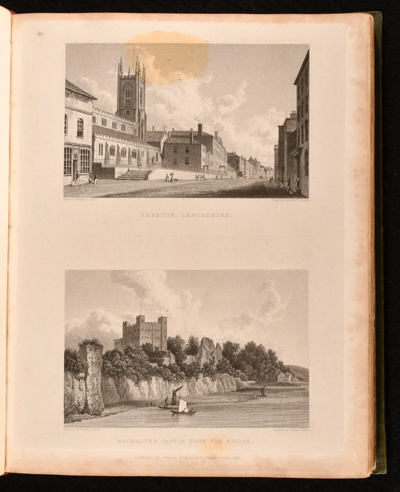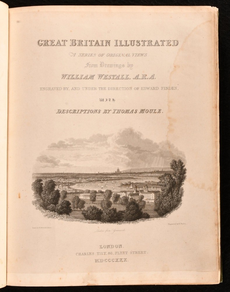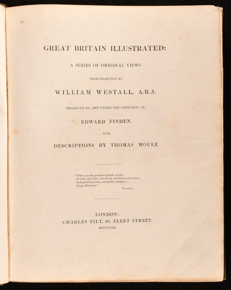 Click here to see our other books! Great Britain Illustrated Thomas Moule 1830 Charles Tilt : London 11" by 8.5" [3], vi, 118, [1], vi SUMMARY The first edition of this illustrated topographical work on the beautiful picturesque scenes of Britain, lavishly illustrated throughout. First Edition,Illustrated,Leather Binding,Rebound Overall Condition: Good This book weighs 1.5 KG when packed UK Postage: £ 3.99 US Postage: £ 23.99 EU Postage : £ 18.99 European Postage: £ 19.99 Asia Postage: £ 31.99 Worldwide Postage: £ 32.99 DESCRIPTION A lavishly illustrated work on the topography of Great Britain, illustrated by William Westall based on engravings by Edward Finden. Including a series of interesting and noteworthy views throughout the British countryside and in cities throughout the country. Including topographical descriptions by the English antiquarian Thomas Moule, known for his decorative county maps of England. William Westall was a noted British landscape artist, one of the first artists to depict Australian scenes. The first edition of this work. Illustrated with a vignette title page and fifty-six plates. Each plate consists of two engravings. Collated and complete. Containing a previous owner's ink signature to the front pastedown: 'J. Bettridge'. CONDITION In quarter morocco binding with cloth covered boards. Externally, some light rubbing to the joints and spine. Some dampstaining to the front board, and light shelf wear. Containing a previous owner's ink signature to the front pastedown. Internally, firmly bound. A tidemark to the vignette title page, and to the plate following page 13. Some light handling marks to the pages, particularly to the extremities of the plates. Overall Condition: Good GLOSSARY OF TERMS Overall Condition (Dustwrapper condition rating is shown after that for the book itself, where a dustwrapper is present) Fine - Very well preserved copy showing very little wear Very Good Indeed - Only one or two minor faults, really a very attractive copy Very Good - Quite a wide term meaning no major faults but probably several smaller ones often expected given the age of the book, but still a respectable copy Good - Meaning not very good. Some more serious faults as will be described in the condition report under 'condition' Good Only - Meaning one or more faults that could really do with repair Fair - As with good only above but with other faults leaving a compromised copy even after repair Poor - Really bad and possibly seriously incomplete. We only sell books in this condition where their rarity or value makes them attractive none the less. Major defects will be described. GUARANTEE We offer a full money back guarantee on our descriptions. Please ask for details and conditions. We prefer PAYPAL. If you pay via PAYPAL we will post the item off the same or the next working day with the postage you have selected. Please note we cannot accept USD cheques