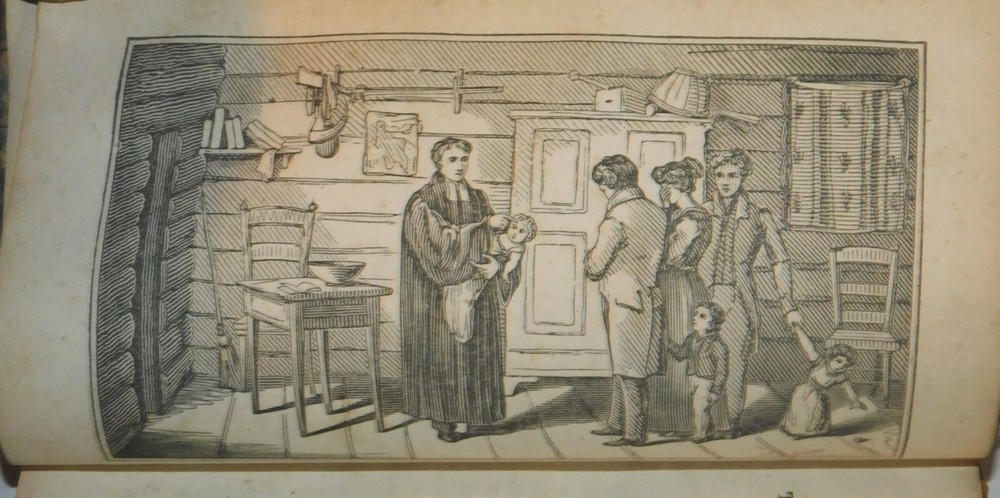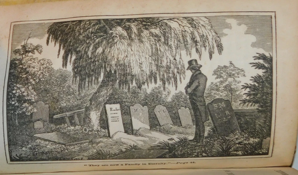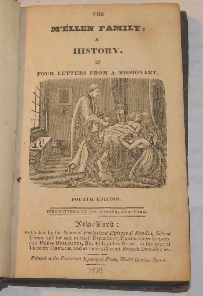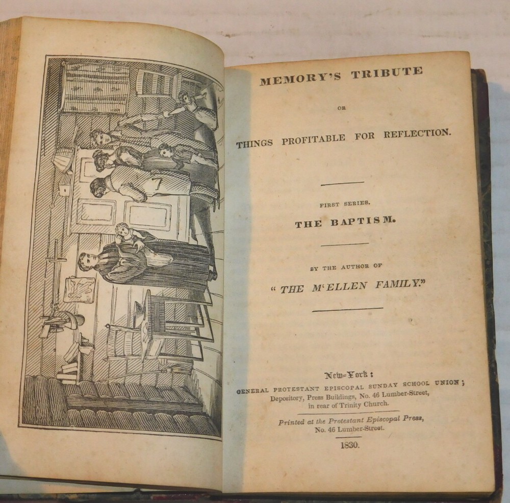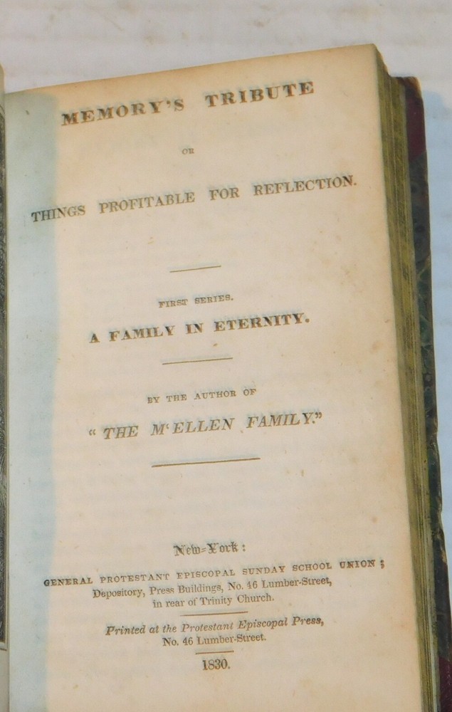 (The Author of "The M'Ellen Family"). THE M'ELLEN FAMILY: A HISTORY. In Four Letters From a Missionary. Fourth Edition. [Together with]: MEMORY'S TRIBUTE OR THINGS PROFITABLE FOR REFLECTION. FIRST SERIES. THE BAPTISM. [Also with]: MEMORY'S TRIBUTE OR THINGS PROFITABLE FOR REFLECTION. FIRST SERIES. A FAMILY IN ETERNITY. [And]: THE MEETING OF THE TRAVELLERS. By the Author of "The M'Ellen Family". (4 books bound in one volume). New York: General Protestant Episcopal Sunday School Union, 1830 / New York: New-York Protestant Episcopal Press, 1831. 1830 & 1831. 32mo, 5-3/4 inches high by 3-5/8 inches wide. Burgundy calf backed marbled boards with calf corners, titled and ruled in gilt on the spine. The covers are scuffed and stained with wear to the joints and head and tail of the spine. [224] pages in all, illustrated with a pictorial vignette title page and 3 full-page frontispiece engravings preceding the subsequent title pages. There is evidence of early worming along the front hinge. An early owner's inscription, dated 1833, is penned on the front endpaper. There is some minor foxing and soiling throughout with a tiny piece out from the bottom corner of one of the title pages. Good. The four books consist of: 1. "The M'Ellen Family: A History. In Four Letters From a Missionary. Fourth Edition. Stereotyped by Jas. Conner, New York". New York: General Protestant Episcopal Sunday School Union, 1830. 36 pages with a title vignette. 2. "Memory's Tribute or Things Profitable For Reflection. First Series. The Baptism. By the author of 'The M'Ellen Family'." New York: General Protestant Episcopal Sunday School Union, 1830. Pages [1]-36, illustrated with a full-page frontispiece included in the pagination. 3. "Memory's Tribute or Things Profitable For Reflection. First Series. A Family in Eternity. By the author of 'The M'Ellen Family'." New York: General Protestant Episcopal Sunday School Union, 1830. Pages [37]-84, illustrated with a full-page frontispiece included in the pagination. 4. "The Meeting of the Travellers. By the author of 'The M'Ellen Family'." New York: New-York Protestant Episcopal Press, 1831. Pages [1]-104, illustrated with a full-page frontispiece included in the pagination. RARE. TERMS: Shipping charges are calculated based on the total packed weight of this item. New York State residents will be assessed and charged the relevant sales tax. All items are guaranteed authentic and as described. Be sure to add me to your favorites list ! Check out my other items !