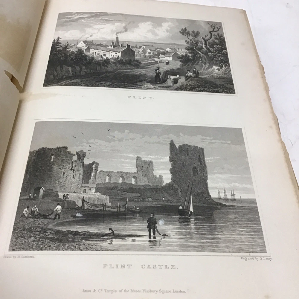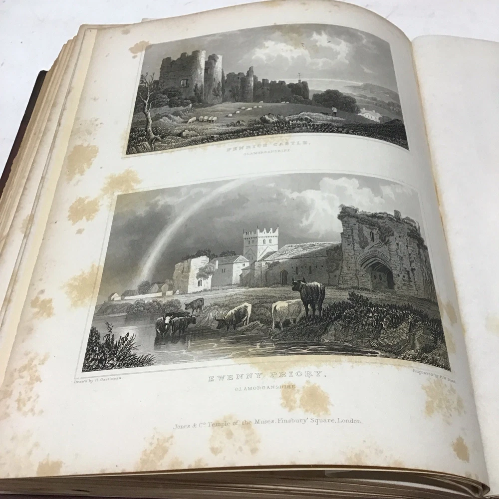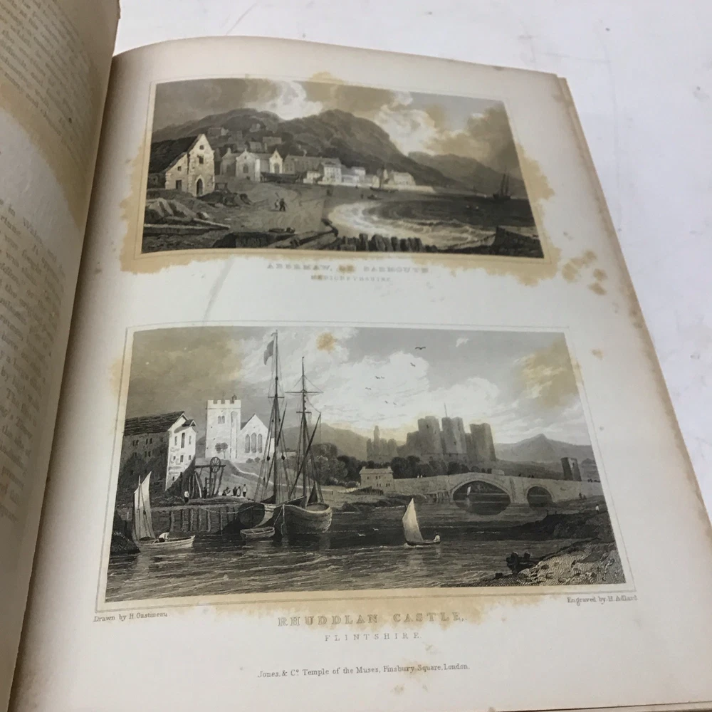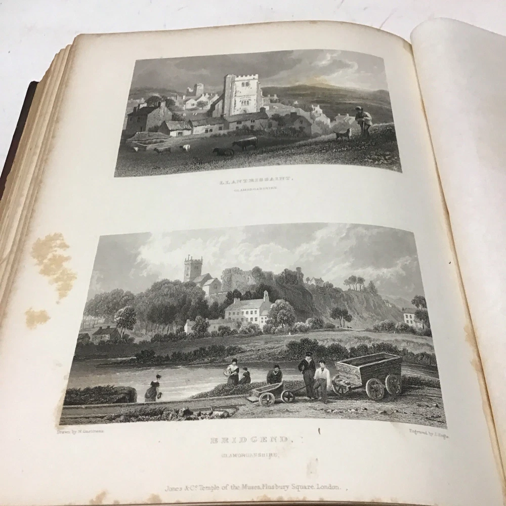 This is a rare and collectible book about Wales, published in 1830 by Jones & Co. Temple of the Muses in London. The author, Henry Gastineau, presents a series of views and illustrations of the country, making it an ideal read for those interested in the history and culture of Wales. The binding of this first edition book is made of leather and hardcover, ensuring its durability and longevity. The book is written in English and is perfect for collectors of antiquarian and collectible books. Its special attributes, including being illustrated and a first edition, make it a valuable addition to any collection. If you're interested in the topic of Wales, this book is a must-have for you. Wales illustrated: in a series of views, comprising the picturesque scenery, towns, castles, seats of the nobility & gentry, antiquities, & c. engraved on steel from original drawings by Henry Gastineau accompanied by historical and topographical descriptions. GASTINEAU, Henry Published by Jones & Co. Temple of the Muses, Finsbury Square, 1830 Size 9.1/8” x 11” Covers have wear as seen in pictures being 195 years old. Has marbleized endpapers and there is foxing in this book as seen in pictures and tissue guards have creases and imperfections. See complete list of engravings in table of contents which is pictured. See our other beautiful books. Keep in mind the shipping price also covers handling fees, packaging materials & time, not just postage. See our eBay store for thousands of our other items. B12F