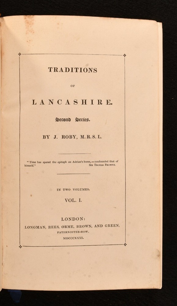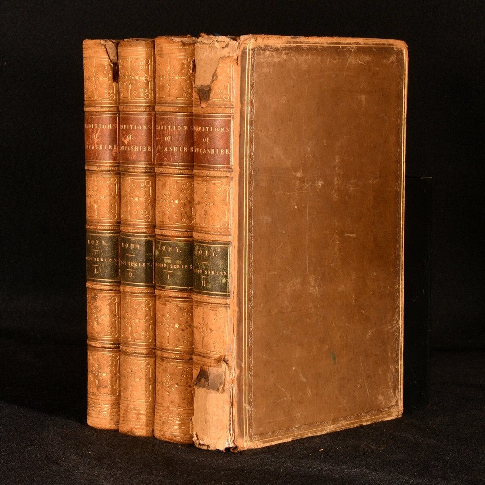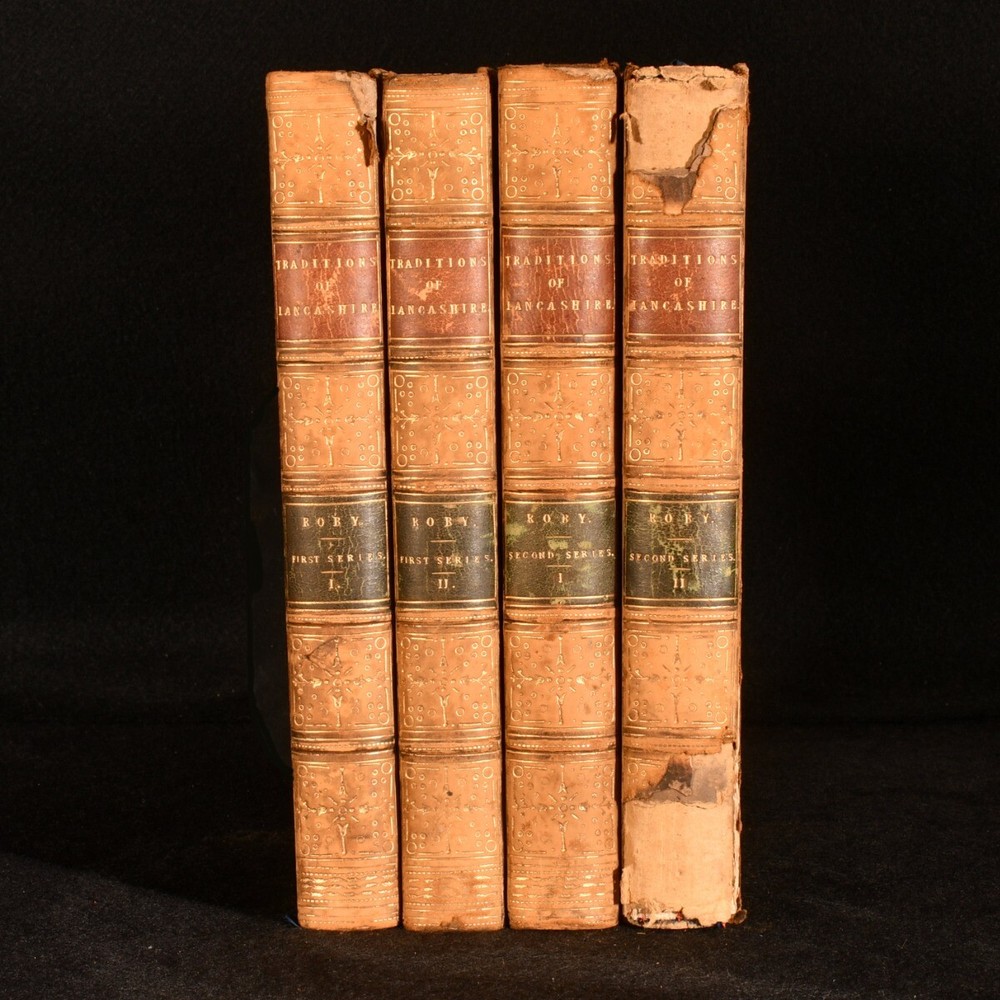 Click here to see our other books! Traditions of Lancashire: First and Second Series John Roby 1830-1831 Longman, Rees, Orme, Brown & Green : London 8.5" by 5.5" x, [4], 331, [1]; [8], 330, [1]; xxvii, [3], 330; [8], 340pp. SUMMARY A complete set of the first and second series of John Roby's exploration of Lancashire's historic traditions. Early Edition,First Edition,Leather Binding,Uncommon Overall Condition: Good This book weighs 5 KG when packed UK Postage: £ 4.49 US Postage: £ 42.99 EU Postage : £ 27.99 European Postage: £ 45.99 Asia Postage: £ 74.99 Worldwide Postage: £ 129.99 DESCRIPTION Bound in a uniform full calf. Written by English banker, poet and writer, John Roby. This collection is comprised of the first and second series of 'The Traditions of Lancashire'; with the first series being the second edition of the work, first published in 1829. The second series is the first edition of the work. This important work explores the history of English folklore, focusing on the traditions and folklore within Lancashire. This study was so well-received that it was reprinted within the year, with the second series soon following. Illustrated with full page engravings and vignettes. CONDITION In a full calf binding. Externally, sound with rubbing to the joints, spine and extremities. Loss to the head and tail of the backstrip to volume II of the second series. Slight bumping to the extremities and head and tail of the spine. Small tear to the head of the front joint of volume I of the first series. The occasional mark to the boards, with a patch of damp staining to the rear board of volume I of the first series. Hinges are slightly strained but holding firm. With a bookseller label of Henry Sotheran to the front paste down. Internally, firmly bound. Pages bright and clean with the odd spot. Overall Condition: Good GLOSSARY OF TERMS Overall Condition (Dustwrapper condition rating is shown after that for the book itself, where a dustwrapper is present) Fine - Very well preserved copy showing very little wear Very Good Indeed - Only one or two minor faults, really a very attractive copy Very Good - Quite a wide term meaning no major faults but probably several smaller ones often expected given the age of the book, but still a respectable copy Good - Meaning not very good. Some more serious faults as will be described in the condition report under 'condition' Good Only - Meaning one or more faults that could really do with repair Fair - As with good only above but with other faults leaving a compromised copy even after repair Poor - Really bad and possibly seriously incomplete. We only sell books in this condition where their rarity or value makes them attractive none the less. Major defects will be described. GUARANTEE We offer a full money back guarantee on our descriptions. Please ask for details and conditions. We prefer PAYPAL. If you pay via PAYPAL we will post the item off the same or the next working day with the postage you have selected. Please note we cannot accept USD cheques