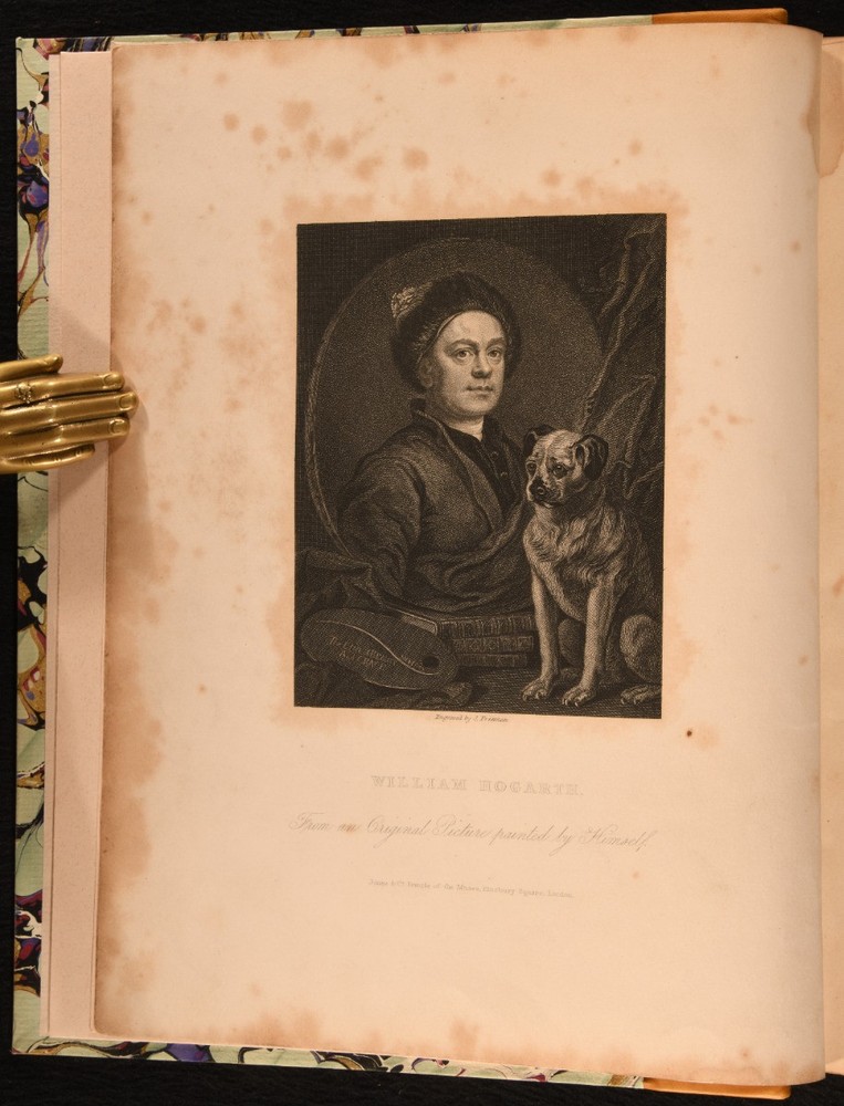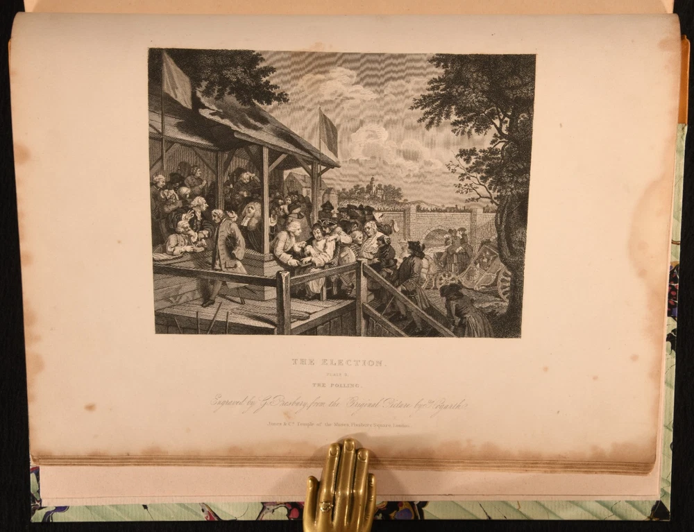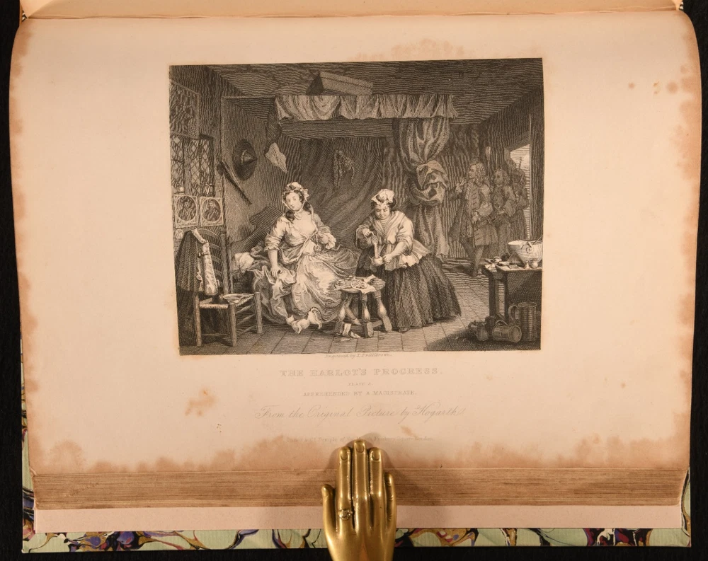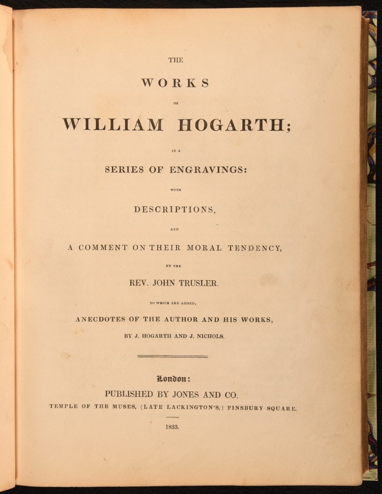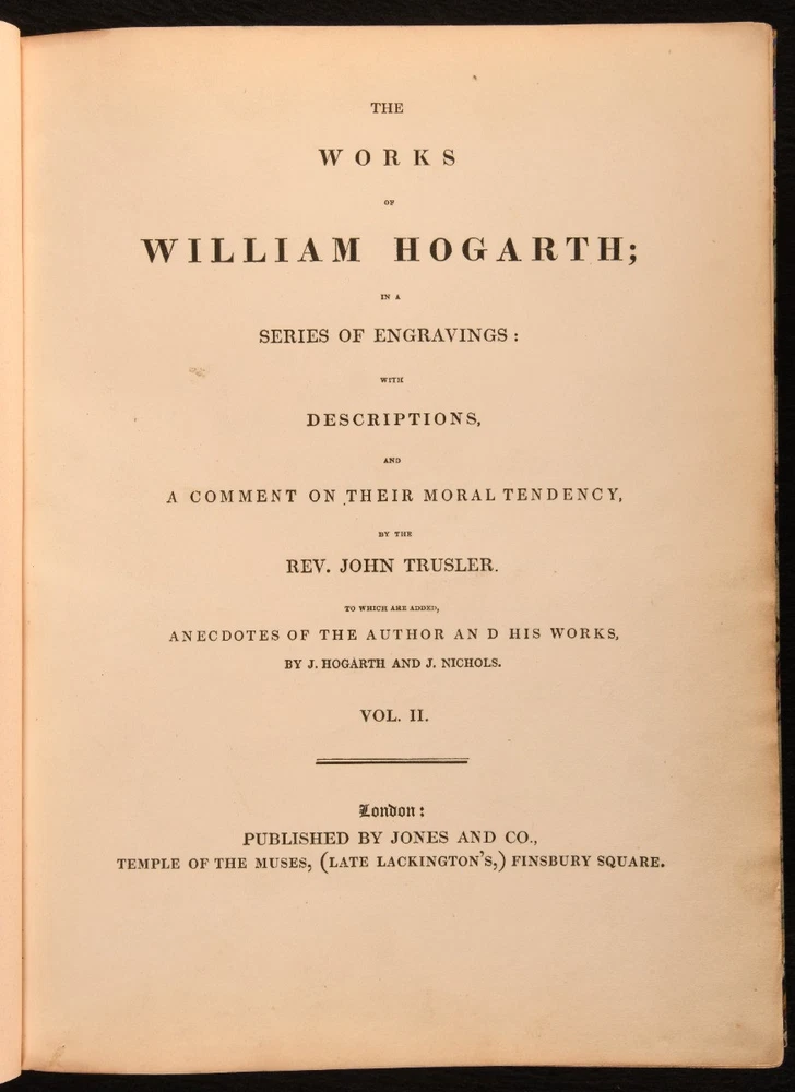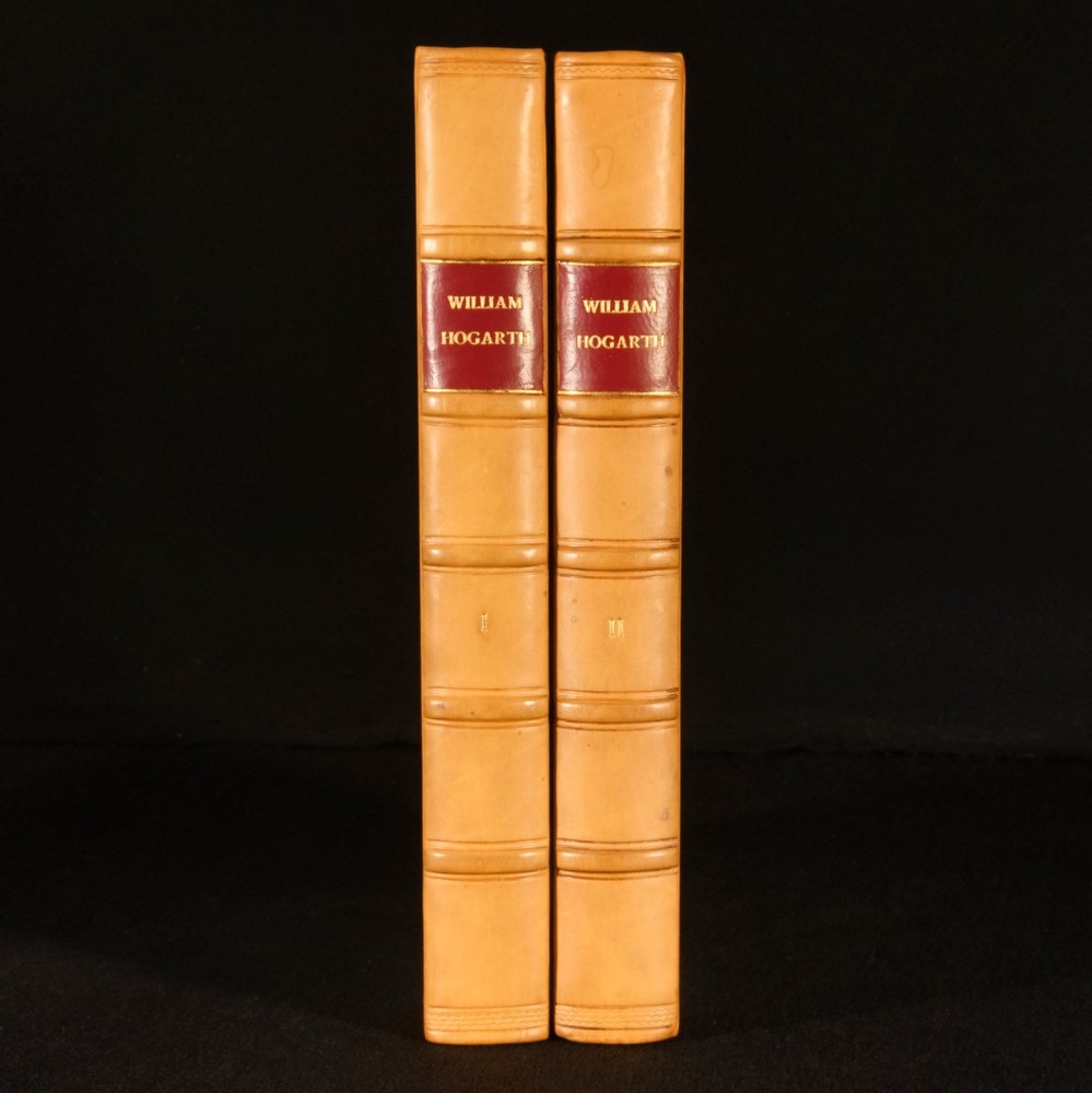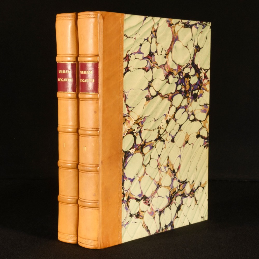 Click here to see our other books! The Works of William Hogarth; In a Series of Engravings Rev. John Trusler; J. Hogarth; J. Nichols 1833 Jones and Co : London 11.5" by 9" 116; 224 [1]pp SUMMARY A beautiful two volume work exploring the influential art of the noted engraver William Hogarth, lavishly illustrated with over one-hundred plates. Illustrated,Leather Binding,Rebound Overall Condition: Very Good Indeed This book weighs 2 KG when packed UK Postage: £ 3.99 US Postage: £ 29.99 EU Postage : £ 21.99 European Postage: £ 23.99 Asia Postage: £ 37.99 Worldwide Postage: £ 38.99 DESCRIPTION Two volumes, rebound in calf backed marbled paper covered boards. Endpapers renewed. A beautiful study of the works of William Hogarth, with an introductory essay by James Hannay. Including a biography and anecdotes on the life and works of Hogarth. Hogarth was an English painter and printmaker, known for his social satire cartoons. He is best known for his series 'A Harlot's Progress', 'A Rake's Progress', and 'Marriage A-la-Mode', which are included in full in this volume. Illustrated with a frontispiece, and fifty-three plates to volume I, and fifty-six plates to volume II. Collated, complete. With descriptive letterpress by John Trusler, and anecdotes on the author and his works by J. Hogarth and J. Nichols. CONDITION Rebound in calf backed marbled paper covered boards. Externally, fine. Endpapers renewed. Internally, firmly bound. Pages age toned due to paper type, with handling marks and light spotting throughout. Plates significantly age toned to perimeters, with significant handling marks to plates, and spotting and instances of foxing to plate perimeters. Instances of small, light tide marks to page fore edges. Overall Condition: Very Good Indeed GLOSSARY OF TERMS Overall Condition (Dustwrapper condition rating is shown after that for the book itself, where a dustwrapper is present) Fine - Very well preserved copy showing very little wear Very Good Indeed - Only one or two minor faults, really a very attractive copy Very Good - Quite a wide term meaning no major faults but probably several smaller ones often expected given the age of the book, but still a respectable copy Good - Meaning not very good. Some more serious faults as will be described in the condition report under 'condition' Good Only - Meaning one or more faults that could really do with repair Fair - As with good only above but with other faults leaving a compromised copy even after repair Poor - Really bad and possibly seriously incomplete. We only sell books in this condition where their rarity or value makes them attractive none the less. Major defects will be described. GUARANTEE We offer a full money back guarantee on our descriptions. Please ask for details and conditions. We prefer PAYPAL. If you pay via PAYPAL we will post the item off the same or the next working day with the postage you have selected. Please note we cannot accept USD cheques