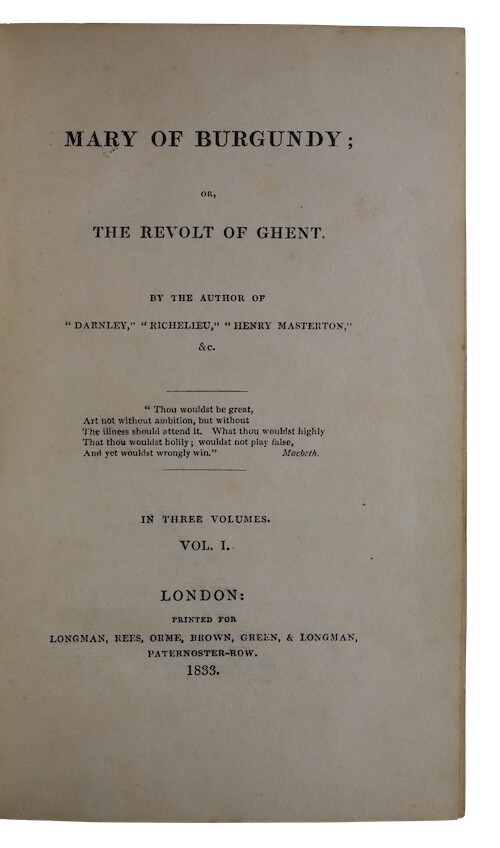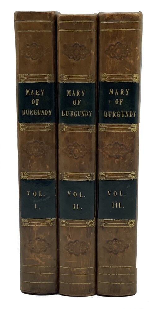 [Literature] ~ ENNISKILLIN BOUND [JAMES, George Payne Rainsford] Mary of Burgundy; or, the revolt of Ghent London. Printed for Longman, Rees Orme, Brown, Green, & Longman, 1833. 8vo. In three volumes. vii, [1], 318; [2], 336; [2], 333pp, [1]. Bound by T. Kilkenny of Enniskillen in contemporary half-calf, marbled boards, tooled in gilt and blind, contrasting black morocco lettering-pieces, marbled edges. Lightly rubbed. Binders tickets to FEPs ov Vol. I and III, recent bookplate of Robert J. Hayhurst to FEP of Vol. I, free-endpapers of Vol. I removed. The first edition of a triple-decker novel by George Payne Rainsford James (1801-1860), presenting a fictionalised account of the turbulent history of the burghers of Flanders. We could find no record of T. Kilkenny's bindery. ~ About Antiquates We’re based in the heart of the Dorset countryside, with an antiquarian bookshop in Wareham, housed within a beautiful Grade II Listed Georgian Building, we also travel far and wide to buy, sell and advise on rare books. We offer a wealth of antiquarian books, specialising in early and hand-press printing - but not excluding all others! Our bias is towards the unusual, the interesting and the important - and we try to offer our customers a varied and frequently changing selection, along with advice on library development and special purchases. We are proud and active members of the ABA (Antiquarian Booksellers Association), ILAB (International League of Antiquarian Booksellers) and the PBFA (Provincial Book Fairs Association) - professional bodies for the antiquarian book trade, abiding by their codes of practice and exhibiting at several large national and regional book fairs each year. Viewings of all books in our stock are possible by appointment at our Wareham bookshop, the details for which are displayed in the 'Business seller Information' section below. Purchase and Payment We aim to make your purchase as straightforward and pleasurable as possible. Payment can be made by various methods: From customers in the UK we accept: Paypal Bank Transfers (in GBP £ Sterling) Cheques (in GBP £ Sterling) For customers from the rest of the world we accept: Paypal Bank Transfers (in GBP £ Sterling) Postage and Packing As experienced and professional booksellers we have shipped books to many countries, and will be happy to quote costs for destinations and/or services other than those currently specified for this heavy book. All books are expertly wrapped, dispatched via national and international postal or courier services, and fully insured from our door to yours. Please be aware that antiquarian books can be imported to many destinations without restriction or extra duties (for example, the entire European Union), but that some destinations do charge import duties and/or sales tax on imported items. As per eBay terms, buyers are liable to pay these costs on receipt. Please see Postage and Payments section