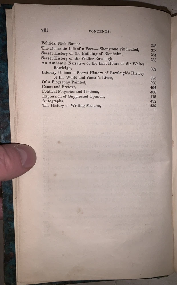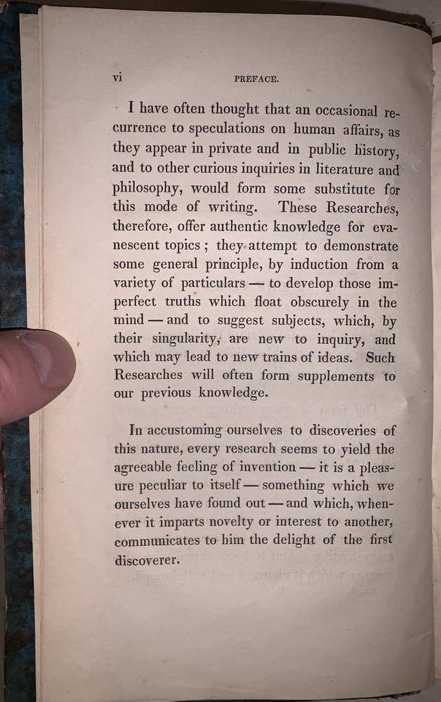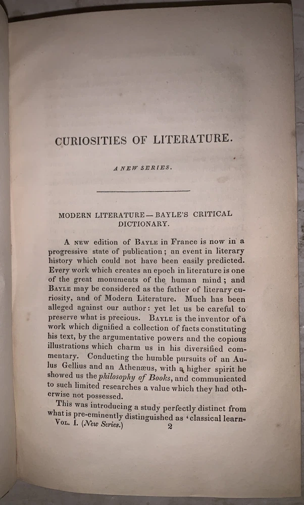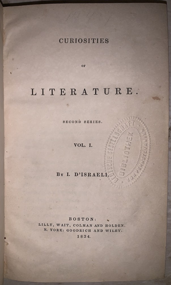 Curiosities of Literature Second Series Vol. I by I. D'Isreali Boston: Lilly, Wait, Colman and Holden 1834 Octavo, 450 pages, period green leather over paper covered boards. Spine lettered in gilt. Old library markings, hinges cracked, boards nearly detached, rubbing and wear, discoloration, else in good condition. If you have any questions, feel free to ask and don't forget to check out my other listings.