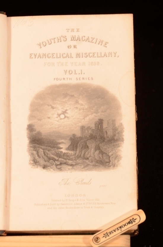 Click here to see our other books! The Youth's Magazine or Evangelical Miscellany Anonymous 1835-1839 Hamilton Adams and Co. : London 7" by 4.5" 432; 432; 432; 432pp SUMMARY A four volume set of this popular magazine for young people, 'The Youth's Magazine or Evangelical Miscellany', in leather binding. Illustrated Overall Condition: Good This book weighs 2 KG when packed UK Postage: £ 3.99 US Postage: £ 29.99 EU Postage : £ 21.99 European Postage: £ 23.99 Asia Postage: £ 37.99 Worldwide Postage: £ 38.99 DESCRIPTION Comprising volumes: Vol VIII Third Series (1835), Vol X Third Series (1837), Vol I Fourth Series (1838), Vol II Fourth Series (1839). A magazine designed for young people with short stories, bible passages, poems, songs and informational pieces Most articles with a Christian spiritual or moral message, others educational and covering a variety of subjects including architecture, geography, history and other cultures. . Illustrated throughout with plates, maps and wood-cuts. CONDITION In half calf bindings. Externally, sound with some rubbing and bumping. Joints starting but still reasonably firm. Ink inscription to front free-endpaper of 1837 with loss to rear endpaper. Internally, generally firmly bound. Pages generally bright with patches of spotting. Pages slightly cockled to all volumes with tidemarks to 1838. Loss to frontispiece of 1837. Overall Condition: Good GLOSSARY OF TERMS Overall Condition (Dustwrapper condition rating is shown after that for the book itself, where a dustwrapper is present) Fine - Very well preserved copy showing very little wear Very Good Indeed - Only one or two minor faults, really a very attractive copy Very Good - Quite a wide term meaning no major faults but probably several smaller ones often expected given the age of the book, but still a respectable copy Good - Meaning not very good. Some more serious faults as will be described in the condition report under 'condition' Good Only - Meaning one or more faults that could really do with repair Fair - As with good only above but with other faults leaving a compromised copy even after repair Poor - Really bad and possibly seriously incomplete. We only sell books in this condition where their rarity or value makes them attractive none the less. Major defects will be described. GUARANTEE We offer a full money back guarantee on our descriptions. Please ask for details and conditions. We prefer PAYPAL. If you pay via PAYPAL we will post the item off the same or the next working day with the postage you have selected. Please note we cannot accept USD cheques