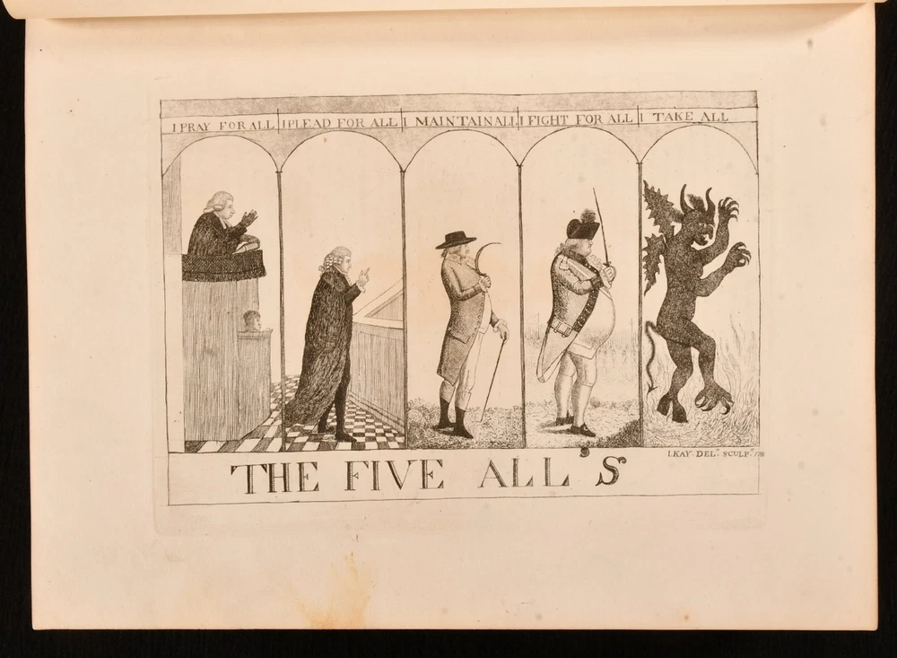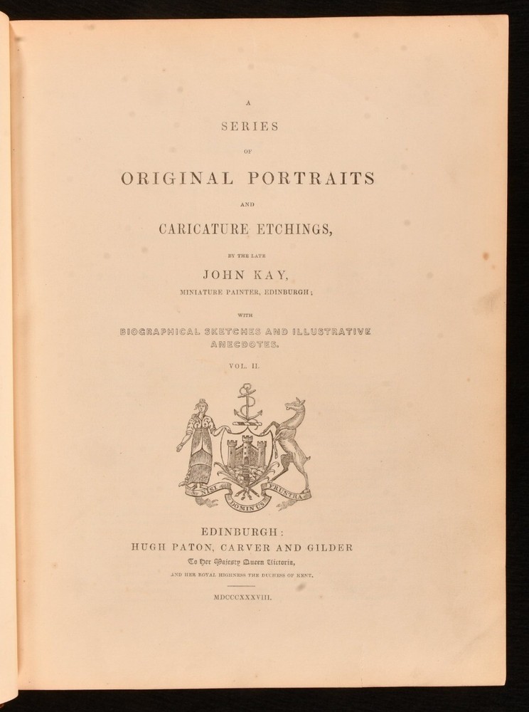 Click here to see our other books! A Series of Original Portraits and Caricature Etchings John Kay; Hugh Paton 1837-38 Hugh Paton, Carver, and Gilder : Edinburgh 10.5" by 8" iv, iv, ix, [1], 430, v-xix; [2], iv, xi, [1], 472pp, iv SUMMARY A lavishly illustrated series of caricatures by the Scottish artist John Kay, illustrated with a total of three hundred and fifty eight plates. First Edition,Illustrated,Leather Binding Overall Condition: Good Only This book weighs 6 KG when packed UK Postage: £ 4.49 US Postage: £ 47.99 EU Postage : £ 28.99 European Postage: £ 49.99 Asia Postage: £ 79.99 Worldwide Postage: £ 159.99 DESCRIPTION The first edition. Complete in two volumes. A lovely work exploring the caricatures of John Kay, a noted Scottish artist who published his first caricature in 1784, depicting James Robertson of Kincraigie, "the daft highland laird". This lavishly illustrated work provides a unique look at the social life of Edinburgh during the late eighteenth and early nineteenth century. Volume I is illustrated with one-hundred and seventy-two plates. Volume II is illustrated with one-hundred and eighty-six plates. Collated, complete. John Kay had a shop on the Royal Mile, selling miniatures and caricatures, however the shop was destroyed during the November 1834 Great Edinburgh Fire. This work was collected and edited by the publisher, Hugh Paton. Bookplate of Robert Roy Paterson to the front paste downs. CONDITION In a half calf binding with cloth to the boards. Externally, the front board of Volume I is detached but present, rear joint is starting a little with cracks to the the leather. Smaller cracks to the head and tail of the rear joint of Volume II. Spines are faded. Lacking the second spine label to each volume. Leather is rubbed, with lighter rubbing to the boards. Light marks to the boards. Minor bumping to the extremities. A small amount of loss of leather to the head and tail of the spines. Rear hinge of Volume I is weak. Front hinge of Volume II is starting, rear hinge is strained but remains firm. Bookplate to the front paste downs. Internally, firmly bound. Pages are bright and clean with the occasional spot. Pages 277/278 in Volume I and 47/48 in Volume II are torn with no loss. Overall Condition: Good Only GLOSSARY OF TERMS Overall Condition (Dustwrapper condition rating is shown after that for the book itself, where a dustwrapper is present) Fine - Very well preserved copy showing very little wear Very Good Indeed - Only one or two minor faults, really a very attractive copy Very Good - Quite a wide term meaning no major faults but probably several smaller ones often expected given the age of the book, but still a respectable copy Good - Meaning not very good. Some more serious faults as will be described in the condition report under 'condition' Good Only - Meaning one or more faults that could really do with repair Fair - As with good only above but with other faults leaving a compromised copy even after repair Poor - Really bad and possibly seriously incomplete. We only sell books in this condition where their rarity or value makes them attractive none the less. Major defects will be described. GUARANTEE We offer a full money back guarantee on our descriptions. Please ask for details and conditions. We prefer PAYPAL. If you pay via PAYPAL we will post the item off the same or the next working day with the postage you have selected. Please note we cannot accept USD cheques