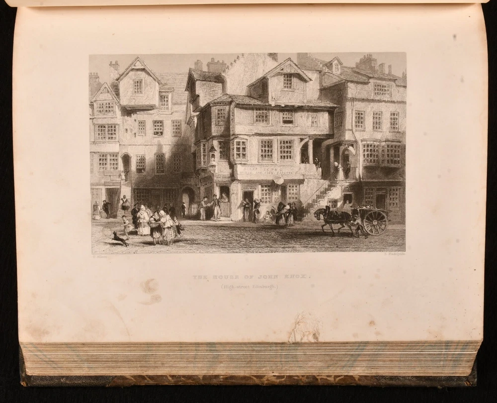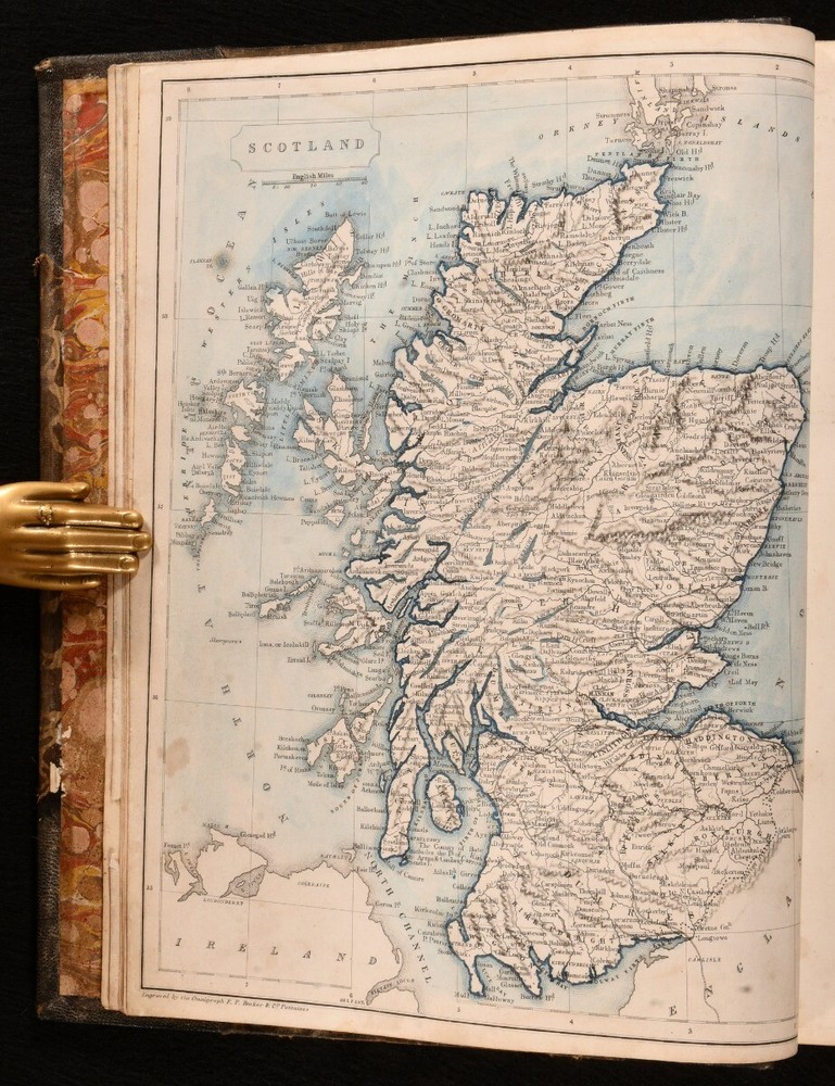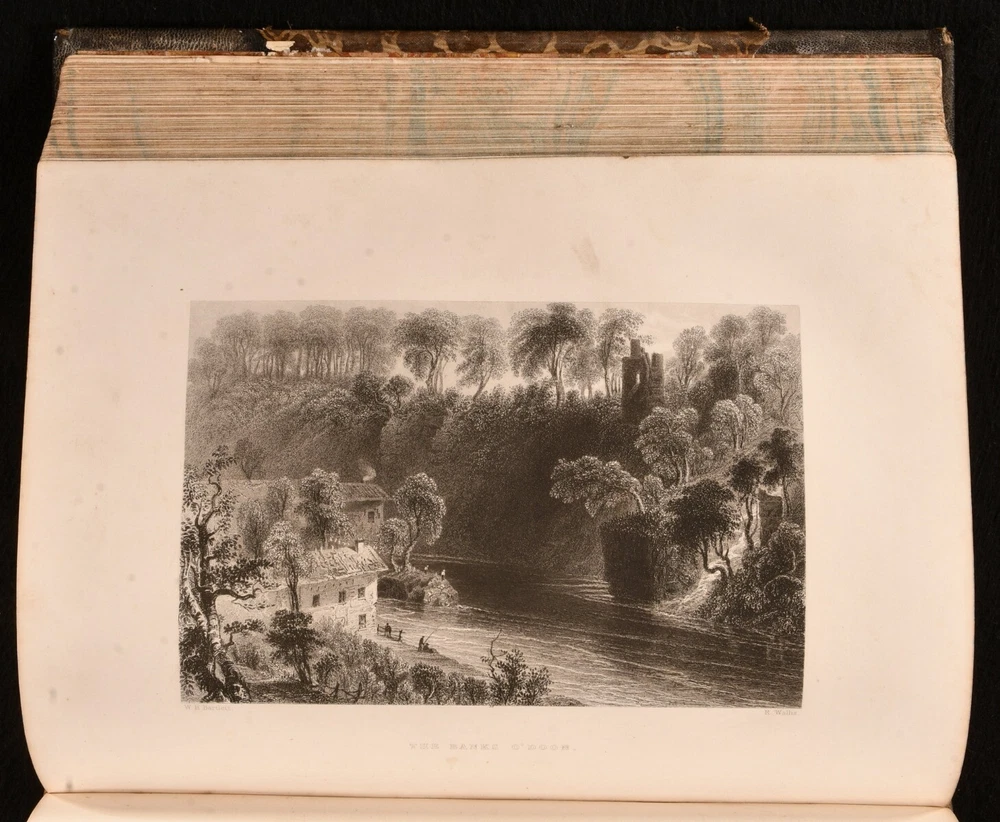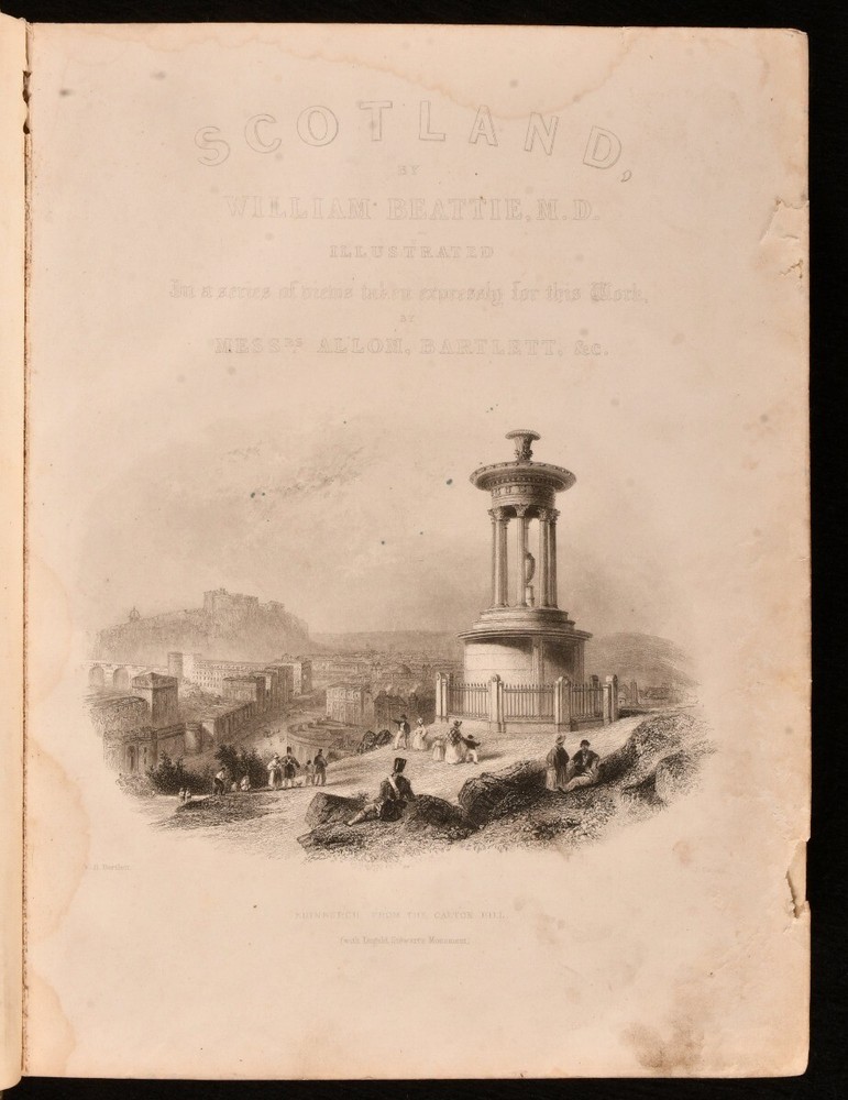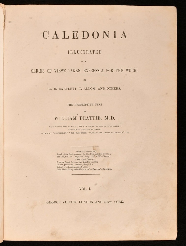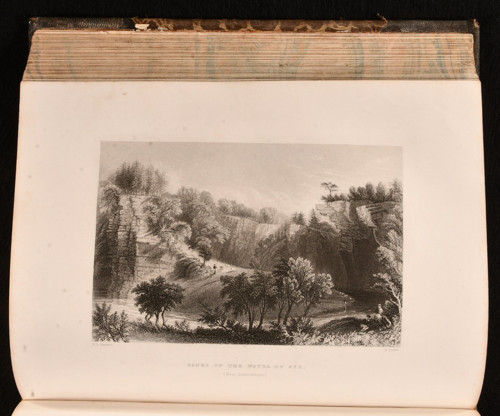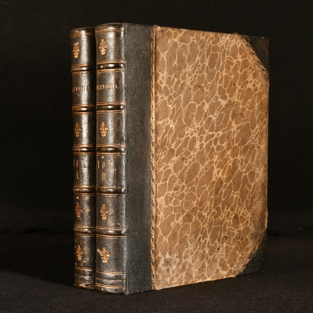 Click here to see our other books! Caledonia Illustrated in a Series of Views Taken Expressly For the Work William Beattie [1838] George Virtue : London 11" by 8.5" viii, 200; [4], 172pp SUMMARY One of William Beattie's lavishly illustrated topographical studies, this volume focusing on the beauty of Caledonia, with plates showing the beautiful views of Scotland. Illustrated,Leather Binding Overall Condition: Good This book weighs 4 KG when packed UK Postage: £ 4.49 US Postage: £ 39.99 EU Postage : £ 26.99 European Postage: £ 36.99 Asia Postage: £ 65.99 Worldwide Postage: £ 99.99 DESCRIPTION Complete in two volumes. Volume I illustrated with an engraved title, one colour map, and seventy-three plates. Collated, bound without one plate. Volume II illustrated with an engraved title, and ninety-five plates. Collated, complete. A beautiful topographical work by William Beattie, looking in particular at Caledonia, the Roman name for the area of britain that lies north of the River Forth in Scotland. This volume takes a romantic view of the picturesque scenes in Scotland, detailing the striking landscapes of the country and notable sites such as castles. Beattie also looks at the history of the country and its people. Beattie was an influential physician and poet. Undated, dated from Jisc from a copy held at the British Library. Plates by W. H. Bartlett, T. Allom, and others. CONDITION In a half morocco binding with cloth to the boards. Externally, generally smart. Wear to the extremities of the boards, with loss and lifting of cloth. Ring mark to the front board of Volume II. Light bumping to the extremities. Some minor marks to the boards and spines. A small amount of cockling to the tail of the rear board of Volume I. A little light rubbing to the joints. Small chip to the head of the rear joint of Volume I. Prior owner's ink inscription to the verso of the front free endpapers. Front endpaper and front free of Volume I are adhered to one another. Prior owner's ink inscription to the recto of the rear endpaper of Volume I. Internally, firmly bound. Pages are lightly age-toned with some scattered spots. Engraved titles are spotted with tidemarks, Volume I engraved title is edge worn. A small patch of worming to the first few pages of Volume II. A small amount of wear to a few plates to the margin, with no loss to the image, wear to plates facing pages 102 and 104 of Volume I, and 18 of Volume II. Plates are spotted. Overall Condition: Good GLOSSARY OF TERMS Overall Condition (Dustwrapper condition rating is shown after that for the book itself, where a dustwrapper is present) Fine - Very well preserved copy showing very little wear Very Good Indeed - Only one or two minor faults, really a very attractive copy Very Good - Quite a wide term meaning no major faults but probably several smaller ones often expected given the age of the book, but still a respectable copy Good - Meaning not very good. Some more serious faults as will be described in the condition report under 'condition' Good Only - Meaning one or more faults that could really do with repair Fair - As with good only above but with other faults leaving a compromised copy even after repair Poor - Really bad and possibly seriously incomplete. We only sell books in this condition where their rarity or value makes them attractive none the less. Major defects will be described. GUARANTEE We offer a full money back guarantee on our descriptions. Please ask for details and conditions. We prefer PAYPAL. If you pay via PAYPAL we will post the item off the same or the next working day with the postage you have selected. Please note we cannot accept USD cheques
