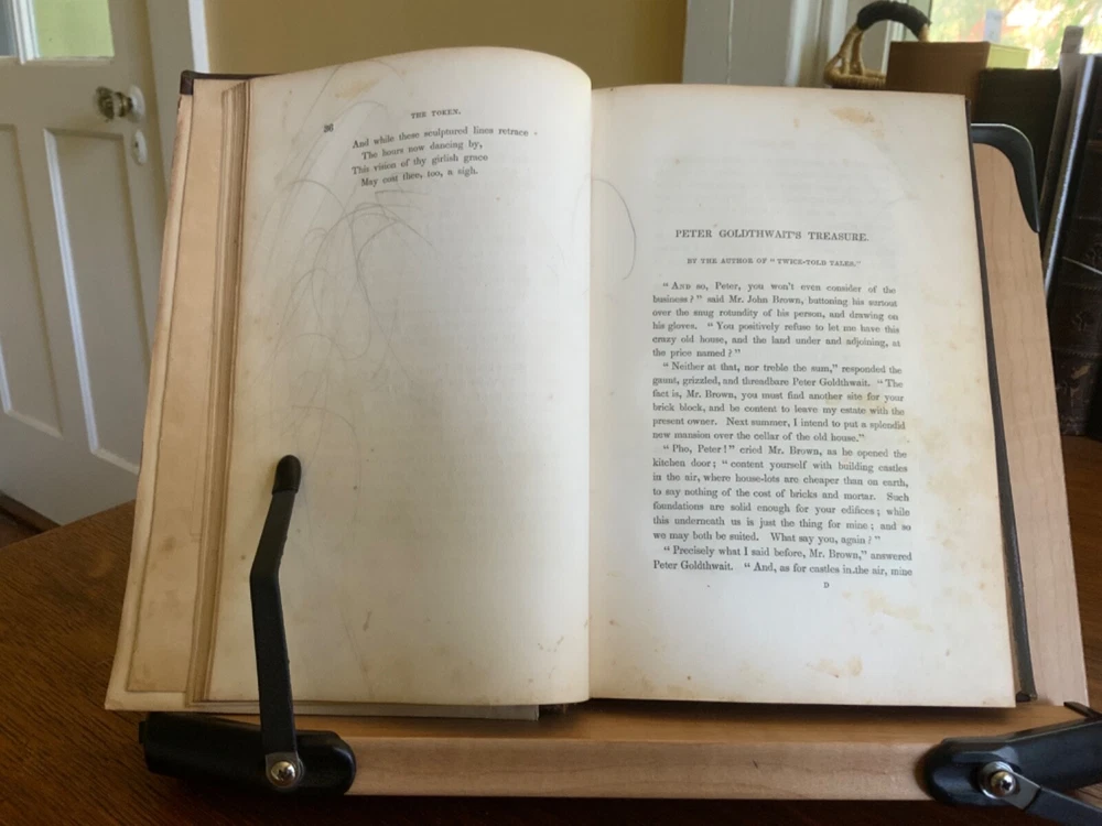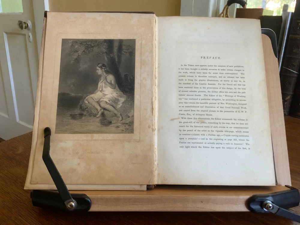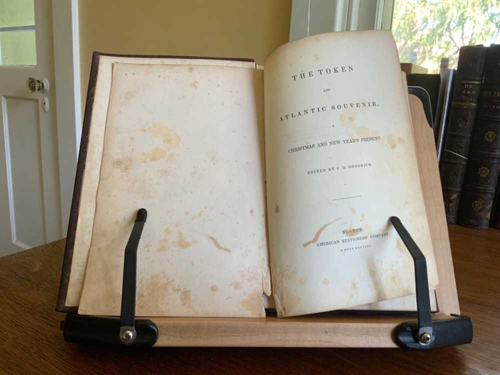 The Token and Atlantic Souvenir, A Christmas and New Year’s Present Edited by S.G. Goodrich, American Stationer’s Company, Boston, 1838, 312 pp, illustrated, full blind stamped leather, 8.5 x 5.5”, 8vo. In fair condition. Light wear to extremities with scuffing to edges and corners. Joints abraded with slight loss. Gilt stamp in center of vase with flowers slightly worn, but intact. All edges gilt. Marbled end papers free of ownership. Illustrated title and preliminaries loose. Light toning throughout with instances of soiling and age stain. Some tissue guards are torn, others missing. Scribbles from a child in graphite throughout, randomly. Light offsetting from plates. Typical age-related wear. Binding intact. Please see photos. Nathaniel Hawthorne (1804-1864) was an American novelist and short story writer. His works often focus on history, morality, and religion. Hawthorne usually centers his writing on New England, & many feature anti-Puritan inspiration. His fiction works are considered part of the Romantic movement, and, more specifically, dark romanticism. Literary contributions in this gift book are dominated by Hawthorne, including, Sylph Etherege , Peter Goldthwaite's Treasure , Endicott and the Red Cross , Night Sketches , Beneath an Umbrella , and The Shaker Bridal. Most of these stories were eventually featured in Twice Told Tales, Vol. II. Original Hawthorne stories - first appearances. Plates present. Gift quality. COLI1838AFJB 12/23 - HKVAR