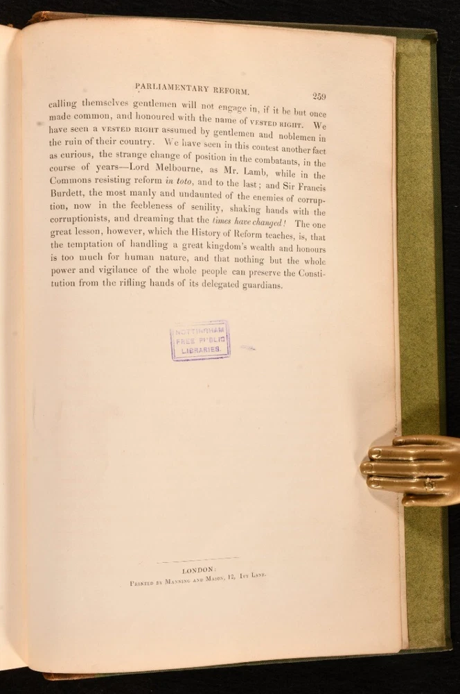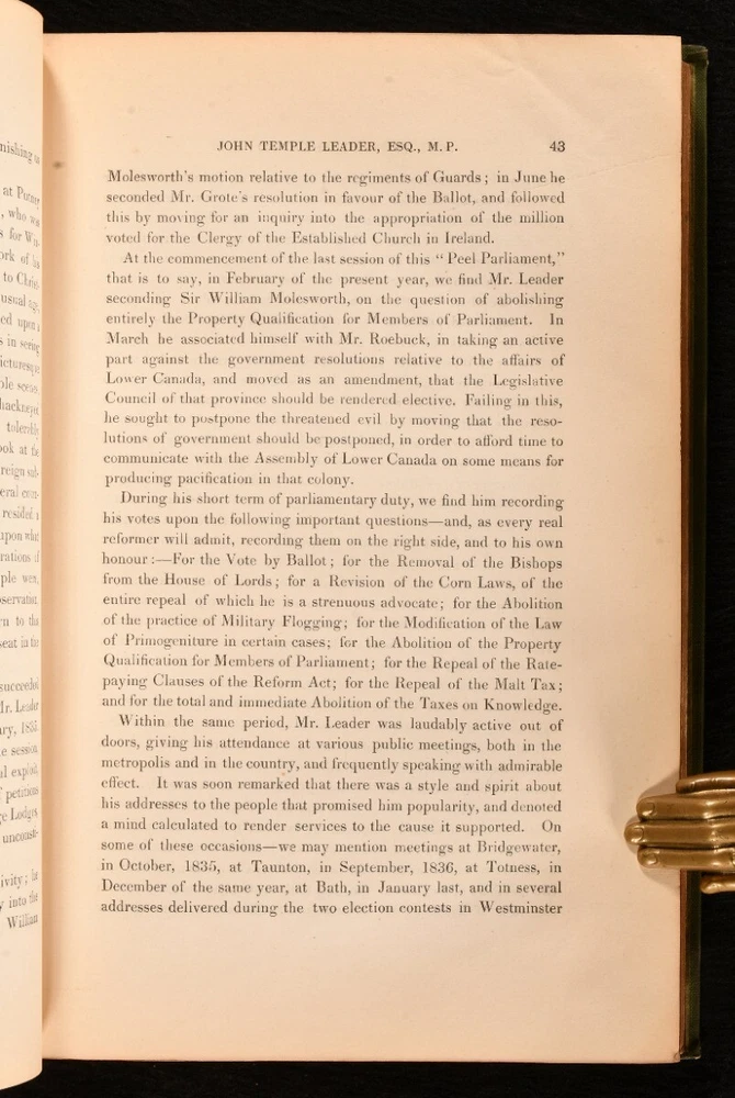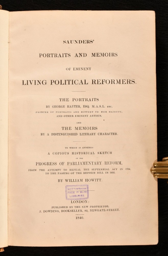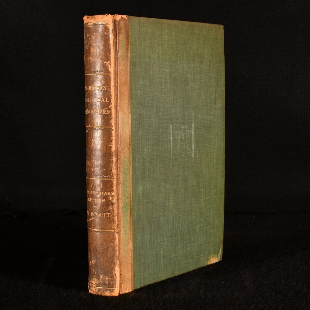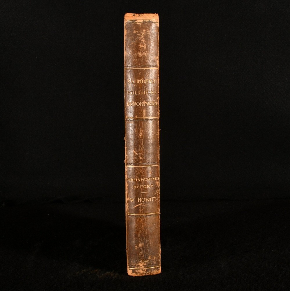 Click here to see our other books! Saunders' Portraits and Memoirs of Eminent Living Political Reformers Not Stated; William Howitt 1840 J. Dowding : London 11" by 7" [6], 259pp. SUMMARY First edition of this illustrated collection of biographies of prominent political reformers of the day. First Edition,Illustrated,Leather Binding,Rebound Overall Condition: Good This book weighs 1.5 KG when packed UK Postage: £ 3.99 US Postage: £ 23.99 EU Postage : £ 18.99 European Postage: £ 19.99 Asia Postage: £ 31.99 Worldwide Postage: £ 32.99 DESCRIPTION The first edition of this work. Containing a series of biographical sketches of important political reformers of the day, including Earl Grey, Lord Melbourne, Earl Spencer, Joseph Hume, Charles Buller, and others. Portraits provided by George Hayter and other eminent artists. Featuring twenty-seven full page plates. Collated, complete. Also included is a historical sketch of the progress of parliamentary reform by William Howitt. CONDITION Rebound in quarter calf binding over cloth covered boards, renewed endpapers. Externally sound with some shelf wear, spine rubbed to extremities, back strip sunned. Usual library stamps to title page and occasional leaf throughout. Minor tide mark affecting occasional margin, particularly leaves of plates, not affecting the illustration. Internally, firmly bound. Pages bright and clean. Complete with twenty-seven portaits. Overall Condition: Good GLOSSARY OF TERMS Overall Condition (Dustwrapper condition rating is shown after that for the book itself, where a dustwrapper is present) Fine - Very well preserved copy showing very little wear Very Good Indeed - Only one or two minor faults, really a very attractive copy Very Good - Quite a wide term meaning no major faults but probably several smaller ones often expected given the age of the book, but still a respectable copy Good - Meaning not very good. Some more serious faults as will be described in the condition report under 'condition' Good Only - Meaning one or more faults that could really do with repair Fair - As with good only above but with other faults leaving a compromised copy even after repair Poor - Really bad and possibly seriously incomplete. We only sell books in this condition where their rarity or value makes them attractive none the less. Major defects will be described. GUARANTEE We offer a full money back guarantee on our descriptions. Please ask for details and conditions. We prefer PAYPAL. If you pay via PAYPAL we will post the item off the same or the next working day with the postage you have selected. Please note we cannot accept USD cheques