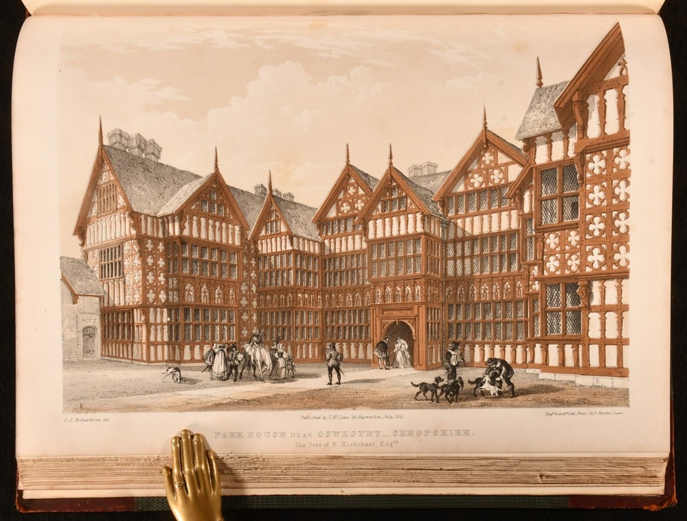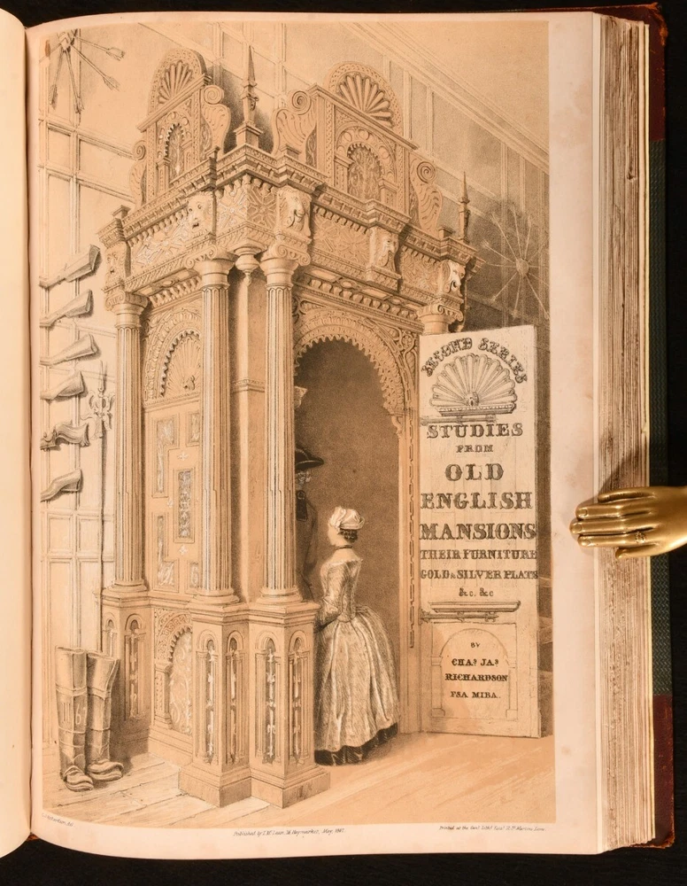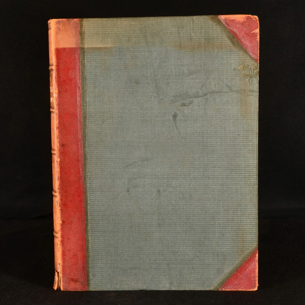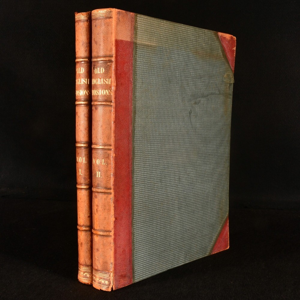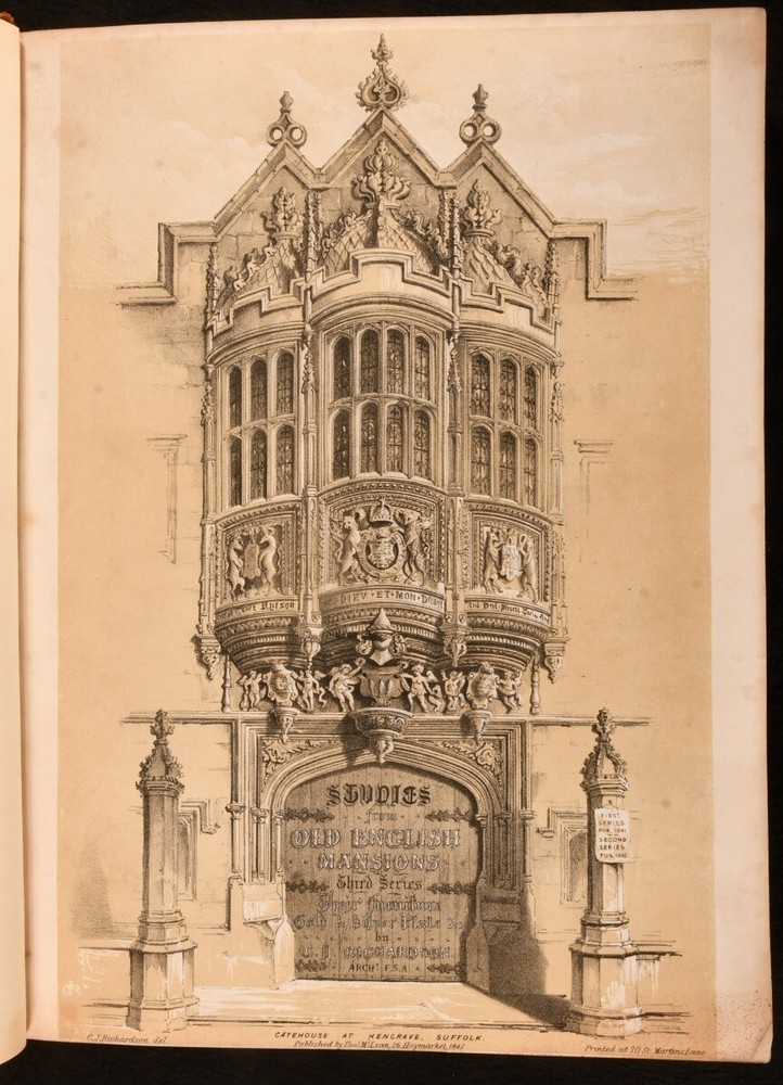 Click here to see our other books! Studies from Old English Mansions: Their Furniture, Gold and Silver Plate &c. C. J. Richardson [Charles James Richardson] 1841-1848 Tho. McLean : London 15.5" by 12" Unpaginated SUMMARY The complete four volume set of C. J. Richardson's beautifully illustrated study of Old English houses, and their contents. First Edition,Illustrated,Leather Binding Overall Condition: Very Good This book weighs 6 KG when packed UK Postage: £ 4.49 US Postage: £ 47.99 EU Postage : £ 28.99 European Postage: £ 49.99 Asia Postage: £ 79.99 Worldwide Postage: £ 159.99 DESCRIPTION Illustrated with four tinted lithographed title-pages, and with twenty-four lithographs to first series; twelve decorative text plates followed by twenty-three lithographs to second series; thirty-seven plates to third series; thirty-seven to third series. These plates include eight chromolithographs, and a number of double page plates. Collated, complete. With all four volumes bound in two. With the 1841 first series and 1842 second series bound in one volume, and the 1845 third series and 1848 fourth series also bound together. The work of English architect, artist and writer Charles James Richardson, the author of further works on design and architecture, including 'Studies of Ornamental Design', and 'A Popular Treatise on the Warming and Ventilation of Buildings'. A wonderfully illustrated four volume work. From the library of Doctor Malcolm Higgs, an important architectural historian who worked as an assistant architect to Stirling & Gowan, working on their particularly renowned Leicester University Engineering Laboratory. During his long career he taught at the University of Edinburgh School of Architecture, Canterbury School of Architecture, and University of Nottingham. Later in his life he was the Vice-President and Honorary Librarian of the Royal Institute of British Architects, and contributed and edited the ‘Journal of Architecture’. CONDITION In half morocco bindings, with cloth covered boards. Significant rubbing to back strips and board perimeters, with tail of rear joint of volume I and front joint of volume II starting, but boards holding firm. Boards lightly cocked. Internally, firmly bound. Plates clean and bright, with light spotting to tissue guards, growing heavier to the tissue guards of the fourth series. Overall Condition: Very Good GLOSSARY OF TERMS Overall Condition (Dustwrapper condition rating is shown after that for the book itself, where a dustwrapper is present) Fine - Very well preserved copy showing very little wear Very Good Indeed - Only one or two minor faults, really a very attractive copy Very Good - Quite a wide term meaning no major faults but probably several smaller ones often expected given the age of the book, but still a respectable copy Good - Meaning not very good. Some more serious faults as will be described in the condition report under 'condition' Good Only - Meaning one or more faults that could really do with repair Fair - As with good only above but with other faults leaving a compromised copy even after repair Poor - Really bad and possibly seriously incomplete. We only sell books in this condition where their rarity or value makes them attractive none the less. Major defects will be described. GUARANTEE We offer a full money back guarantee on our descriptions. Please ask for details and conditions. We prefer PAYPAL. If you pay via PAYPAL we will post the item off the same or the next working day with the postage you have selected. Please note we cannot accept USD cheques