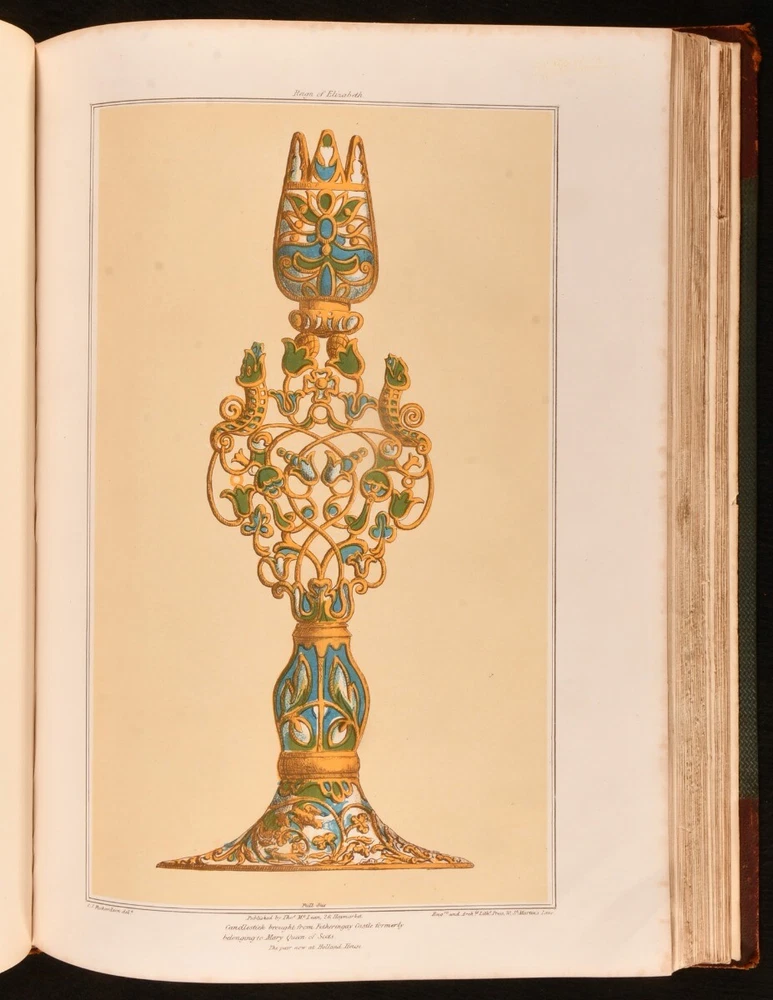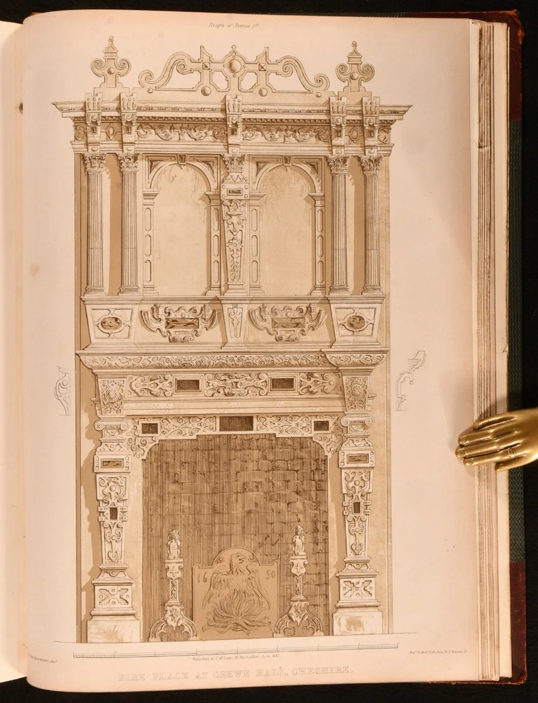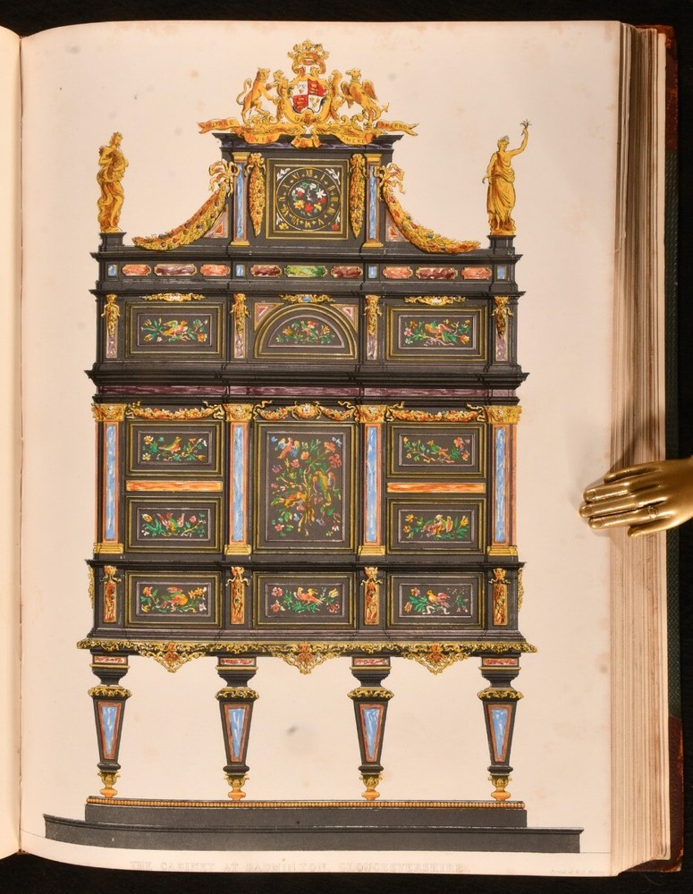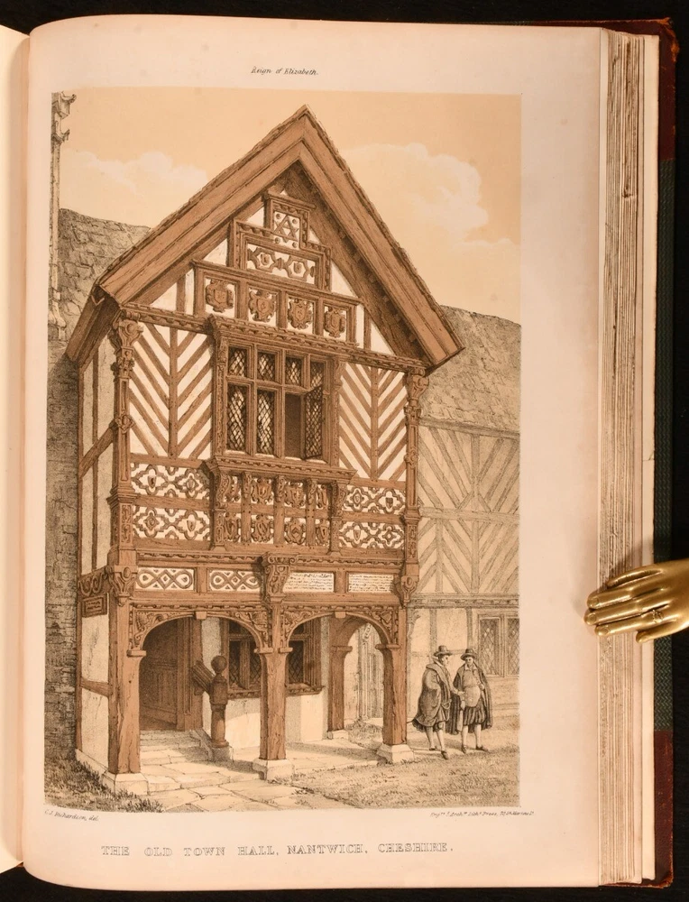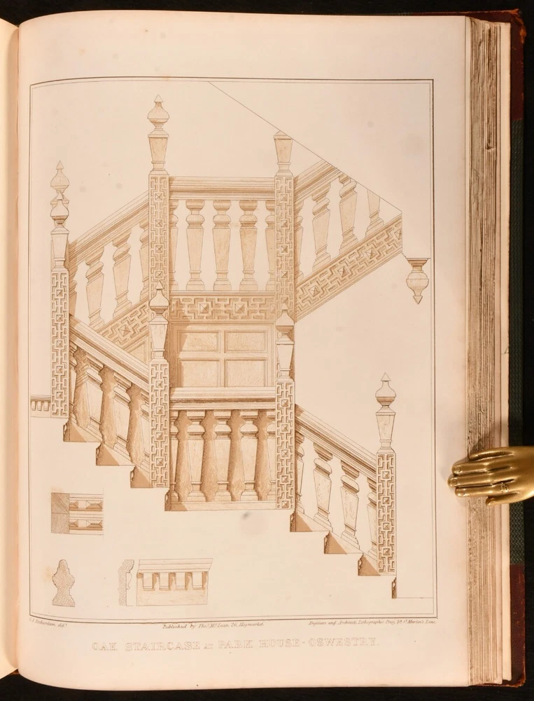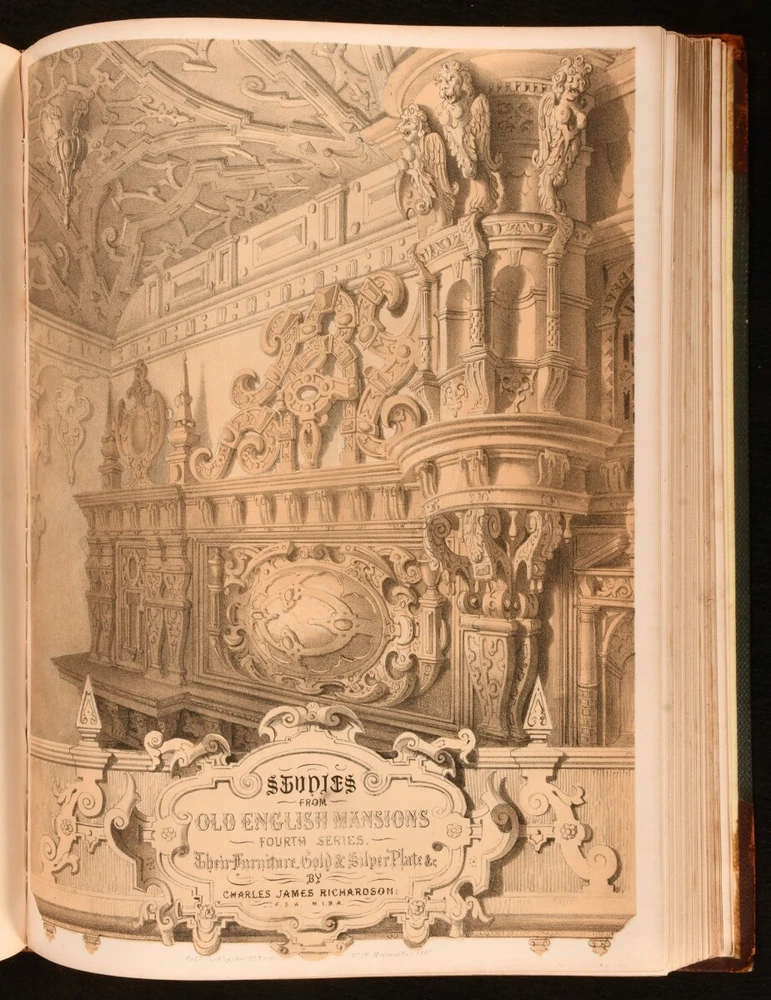 Click here to see our other books! Studies from Old English Mansions: Their Furniture, Gold and Silver Plate &c. C. J. Richardson [Charles James Richardson] 1841-1848 Tho. McLean : London 15.5" by 12" Unpaginated SUMMARY The complete four volume set of C. J. Richardson's beautifully illustrated study of Old English houses, and their contents. First Edition,Illustrated,Leather Binding Overall Condition: Very Good This book weighs 6 KG when packed UK Postage: £ 4.49 US Postage: £ 47.99 EU Postage : £ 28.99 European Postage: £ 49.99 Asia Postage: £ 79.99 Worldwide Postage: £ 159.99 DESCRIPTION Illustrated with four tinted lithographed title-pages, and with twenty-four lithographs to first series; twelve decorative text plates followed by twenty-three lithographs to second series; thirty-seven plates to third series; thirty-seven to third series. These plates include eight chromolithographs, and a number of double page plates. Collated, complete. With all four volumes bound in two. With the 1841 first series and 1842 second series bound in one volume, and the 1845 third series and 1848 fourth series also bound together. The work of English architect, artist and writer Charles James Richardson, the author of further works on design and architecture, including 'Studies of Ornamental Design', and 'A Popular Treatise on the Warming and Ventilation of Buildings'. A wonderfully illustrated four volume work. From the library of Doctor Malcolm Higgs, an important architectural historian who worked as an assistant architect to Stirling & Gowan, working on their particularly renowned Leicester University Engineering Laboratory. During his long career he taught at the University of Edinburgh School of Architecture, Canterbury School of Architecture, and University of Nottingham. Later in his life he was the Vice-President and Honorary Librarian of the Royal Institute of British Architects, and contributed and edited the ‘Journal of Architecture’. CONDITION In half morocco bindings, with cloth covered boards. Significant rubbing to back strips and board perimeters, with tail of rear joint of volume I and front joint of volume II starting, but boards holding firm. Boards lightly cocked. Internally, firmly bound. Plates clean and bright, with light spotting to tissue guards, growing heavier to the tissue guards of the fourth series. Overall Condition: Very Good GLOSSARY OF TERMS Overall Condition (Dustwrapper condition rating is shown after that for the book itself, where a dustwrapper is present) Fine - Very well preserved copy showing very little wear Very Good Indeed - Only one or two minor faults, really a very attractive copy Very Good - Quite a wide term meaning no major faults but probably several smaller ones often expected given the age of the book, but still a respectable copy Good - Meaning not very good. Some more serious faults as will be described in the condition report under 'condition' Good Only - Meaning one or more faults that could really do with repair Fair - As with good only above but with other faults leaving a compromised copy even after repair Poor - Really bad and possibly seriously incomplete. We only sell books in this condition where their rarity or value makes them attractive none the less. Major defects will be described. GUARANTEE We offer a full money back guarantee on our descriptions. Please ask for details and conditions. We prefer PAYPAL. If you pay via PAYPAL we will post the item off the same or the next working day with the postage you have selected. Please note we cannot accept USD cheques