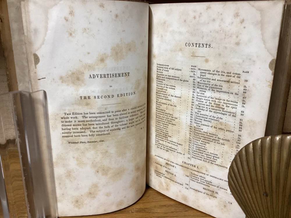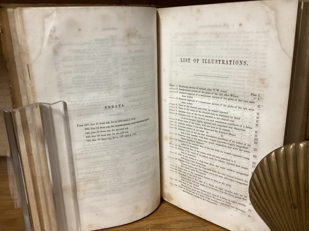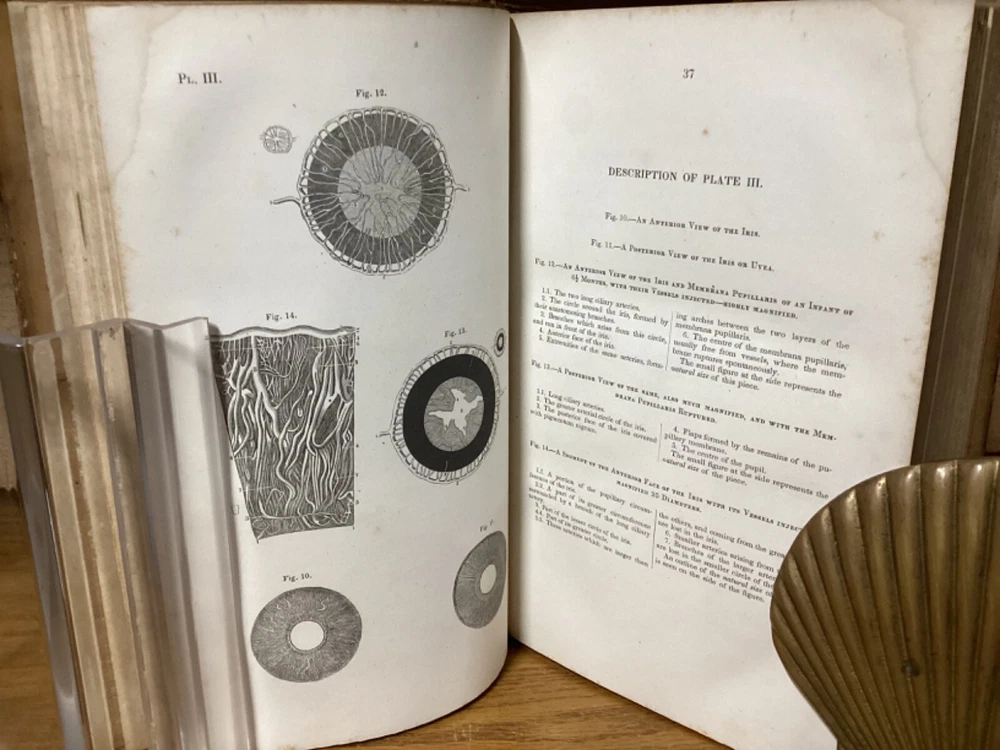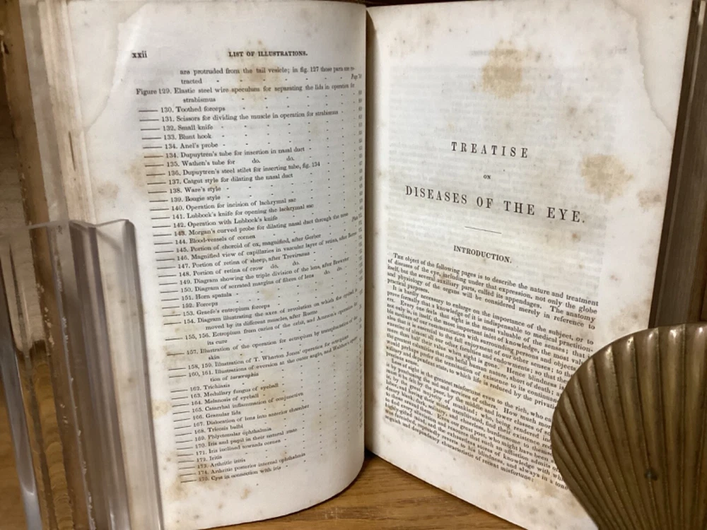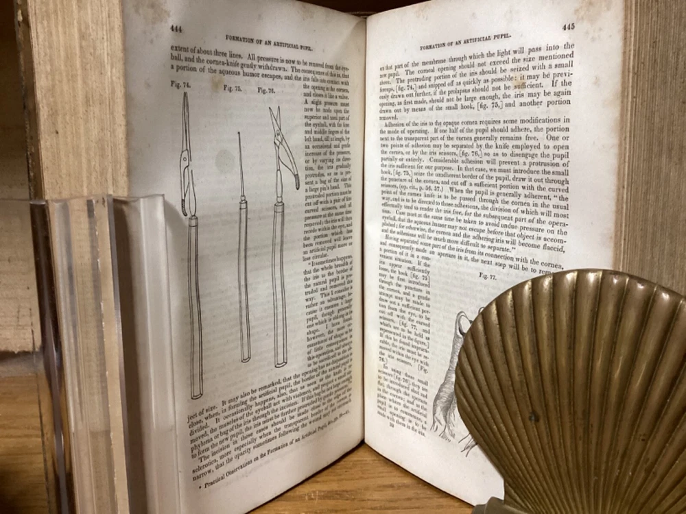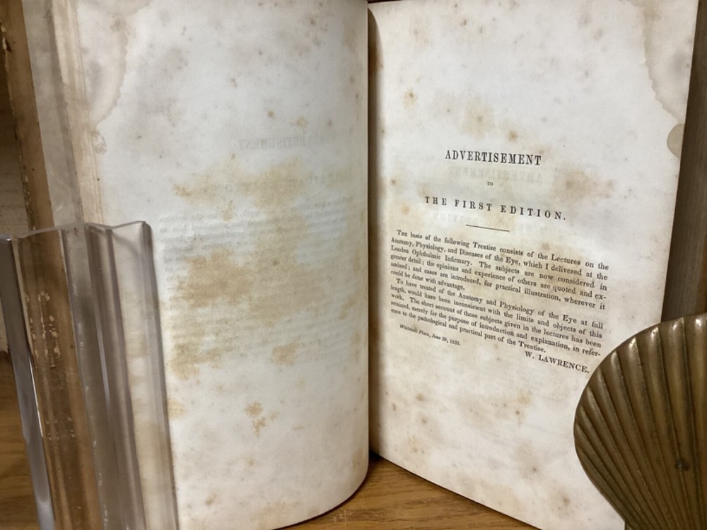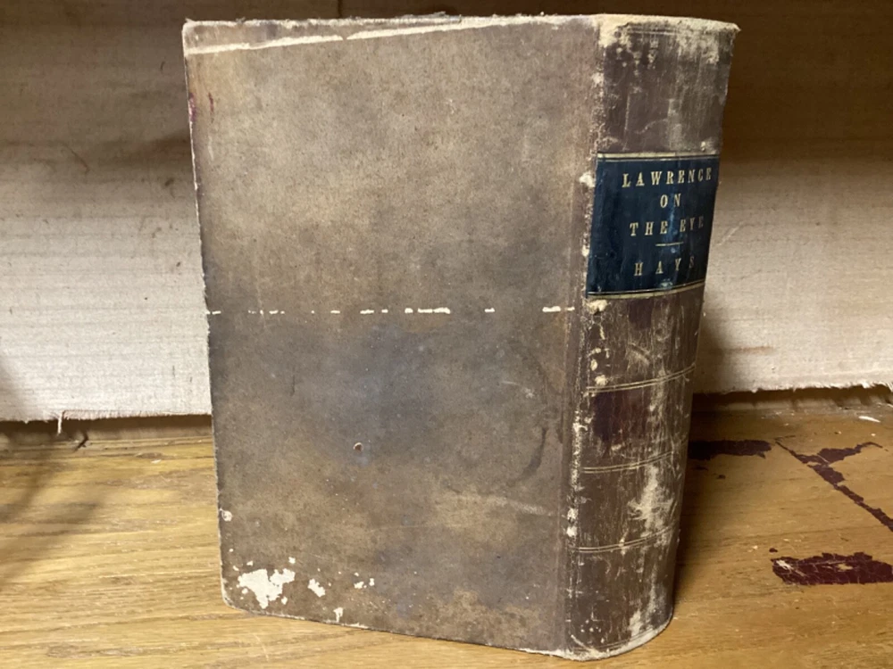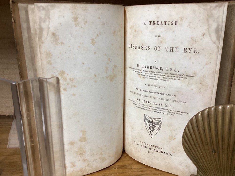 A Treatise on the Diseases of the Eye. By W. Lawrence and edited by Isaac Hays. Printed in Philadelphia by Lea and Blanchard. 1847, [32] + 836 + 32 pp. 8vo. Full leather hardcover. In good condition, with superficial rubbing and wear to exterior. Hinges remain in good condition and text block remains bound well. Light markings and marginalia, along with staining to corners towards front of text block. Nicely illustrated throughout with over one hundred black-and-white sketches. General age-related toning to pages, along with periodic foxing and wear. Please see photographs and ask any questions prior to purchasing. A scarce piece and first American edition, taken from the 1833 first British edition. Isaac Hays (1796-1879) was an American ophthalmologist, naturalist, and writer. He served as one of the founding members of the American Medical Association, and was prominent regarding early American research on color blindness and astigmatism.