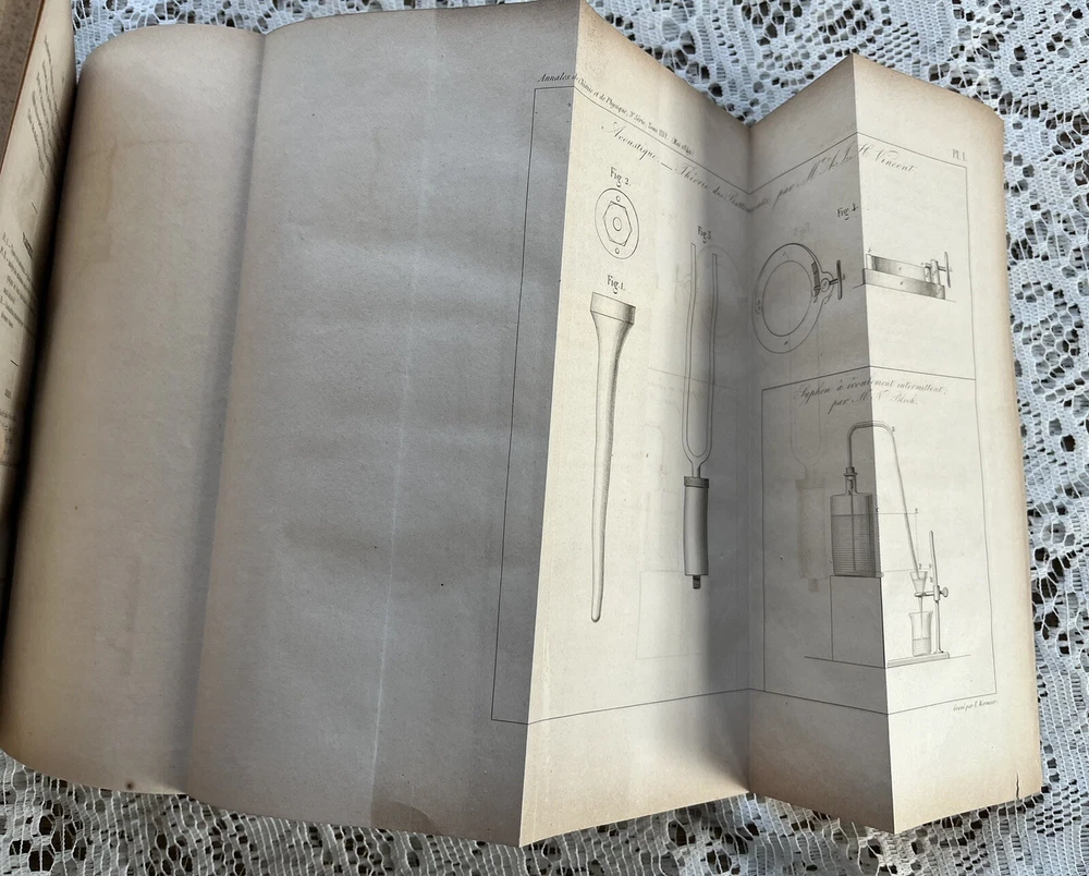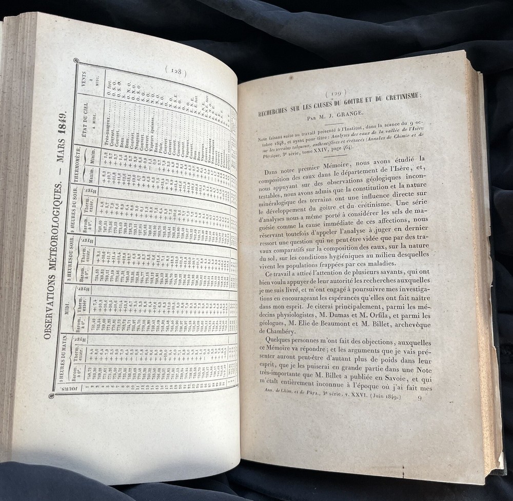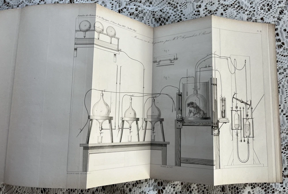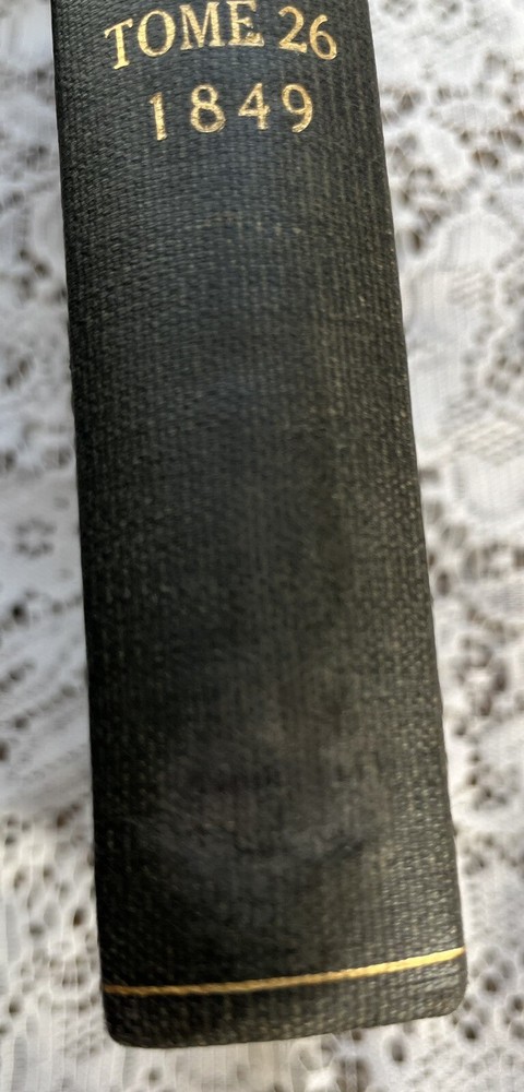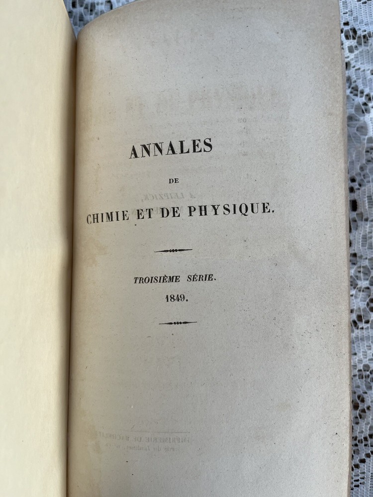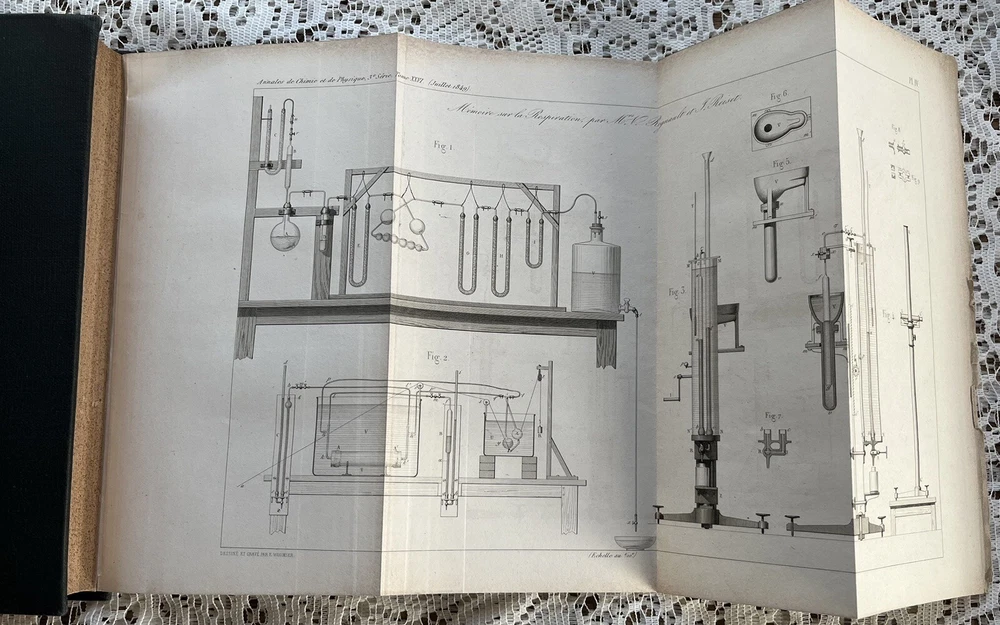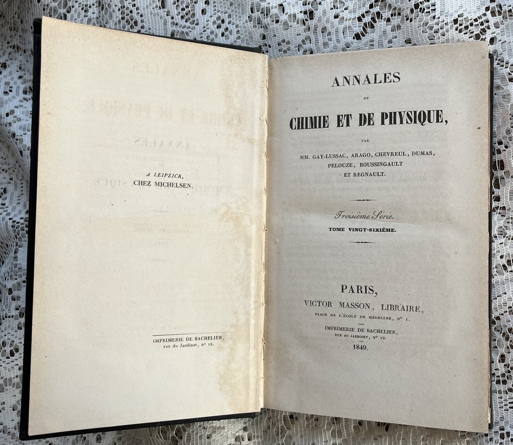 1849 Annales De Chimie et de Physique series 3, Tome 26. Respiratory Quotient V. Regnault and J Reiset Garrison Morton 932: the “first determination of the respiratory quotient .”. The article is on pages 299 through 519, with two fold-out plates. 8-3/4” x 5-1/2” Offered here is the entire volume 26, 528 pages plus a total of four fold-out plates. Errata slip tipped in rear. Black buckram cloth, gilt titles on spine. Later binding by Haynes and Pehr. No other markings although a faint impression hints at a possible sticker having once been at the base of the spine. Minor chipping on last plate. Paper moderately toned with age. Clean, tight and solid. Please examine all photos as they are an integral part of this listing description.