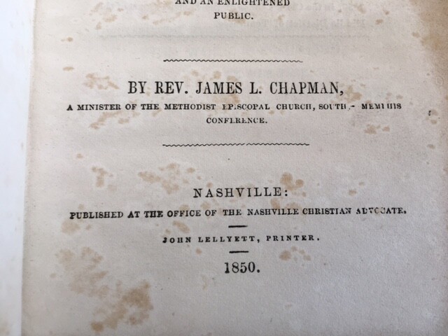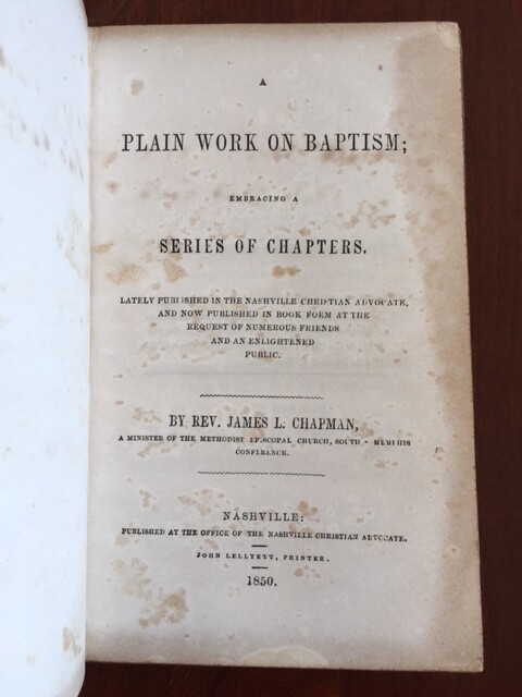A Plain Work on Baptism; Embracing a Series of Chapters By James L. Chapman Published: The Nashville Christian Advocate, Nashville, TN, 1850. 215 pp. Full leather binding with gilt leather label. Tanning, faint scattered foxing. A scarce series of essays on the subject of baptism and against Baptist beliefs. Chapman was a Methodist minister from Memphis. ALLEN 2784. AII (TENNESSEE) 435. A really nice copy of this work. Not Ex-Lib. I've done my best to describe the book, but if you have additional questions, please don't hesitate to send me an e-mail.