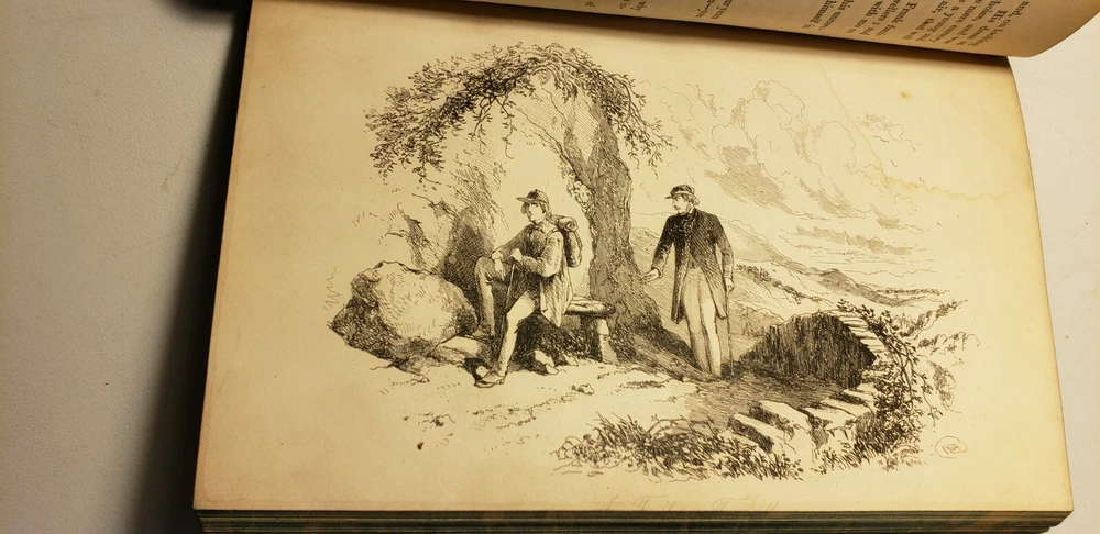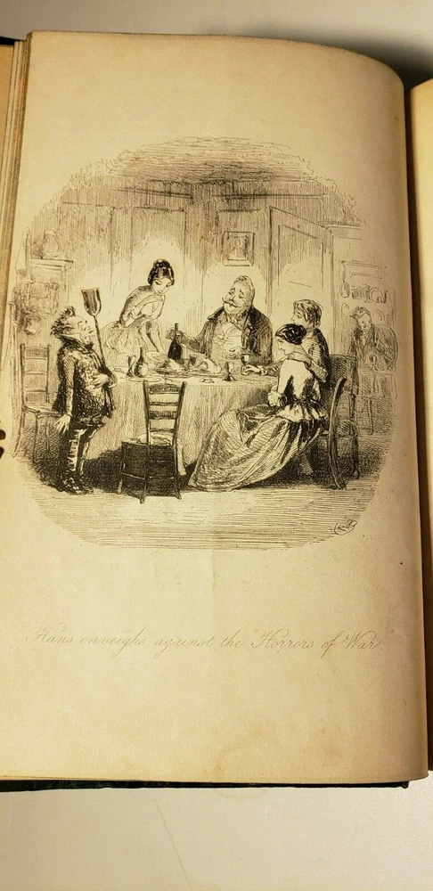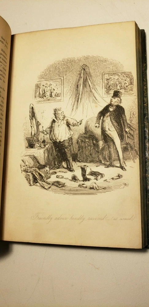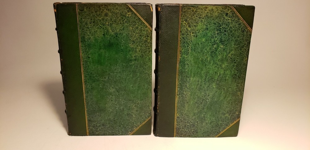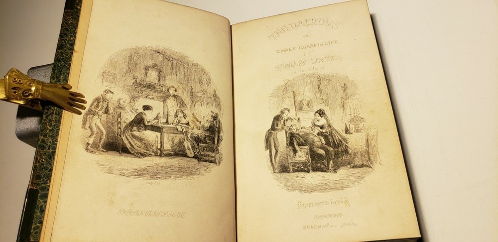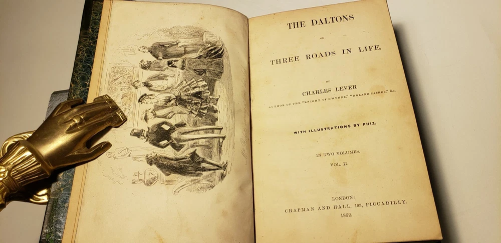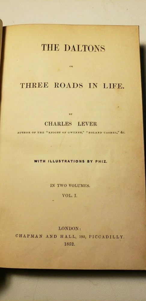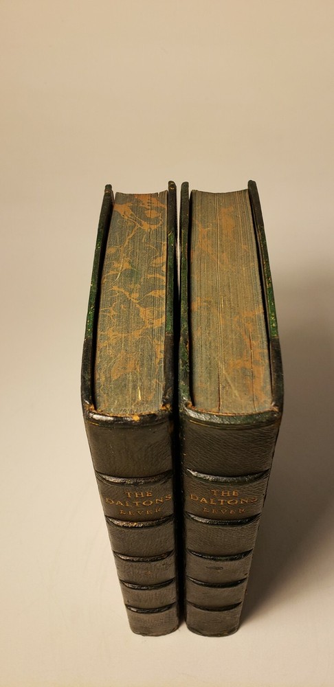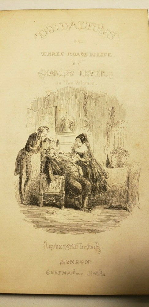 [SETS,CHARLES LEVER, DICKENS CIRCLE, H.K. BROWNE ILLUSTRATIONS, FINE BINDINGS] LEVER, Charles (Author) "THE DALTONS - Or Three Roads in Life" London. Chapman and Hall. 1852. First Edition. (in book form after serial magazine appearance) 2 volumes octavo (5.5 in x 8.25 in) Bound in 3/4 dark green crushed morocco with gilt spine title. 1 text page w/ 2 in. old cello tape repair Marbled endpapers. Hinges sound. Better than very good. A quite nice set on the shelf. A standard Victorian tale featuring the always humorous and delightful illustrations of Hablot K. Browne (aka 'Phiz') who is better known for his collaborations with Charles Dickens. Please email any questions -