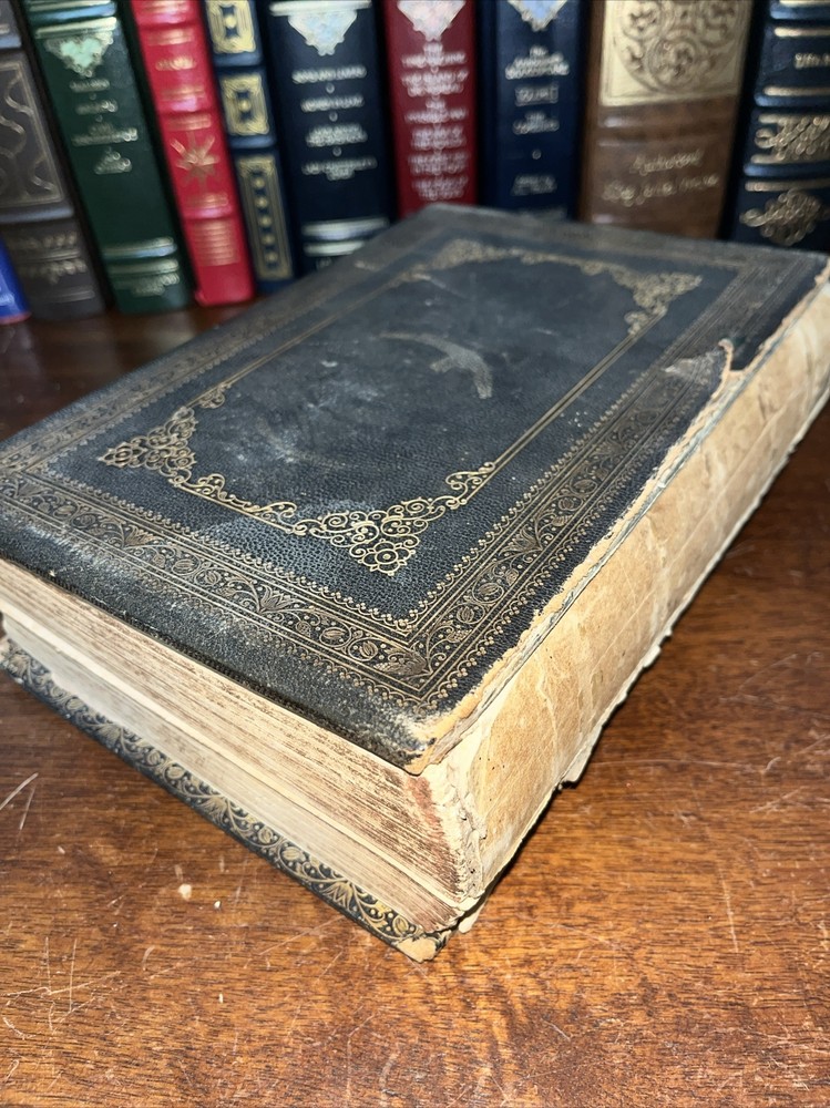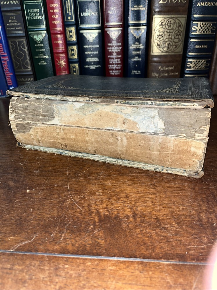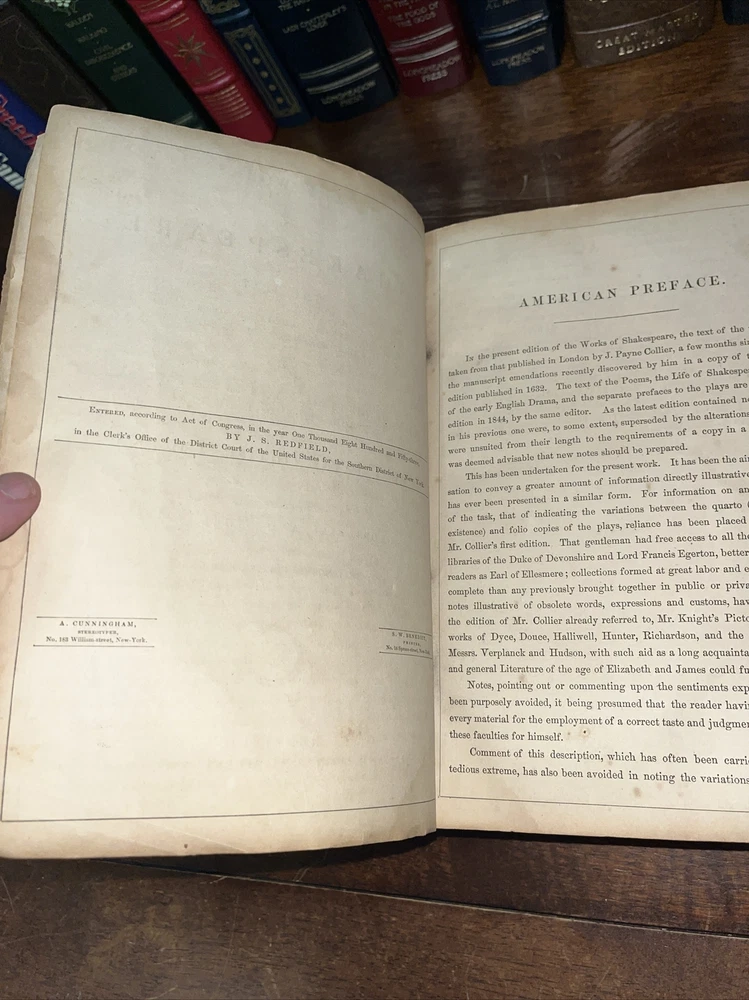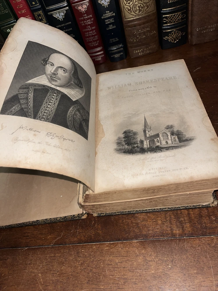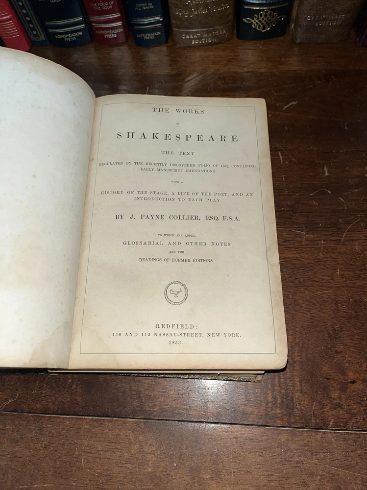 This rare find from 1853 is a true gem for any Shakespeare enthusiast. The leather-bound book features the complete works of the famous playwright, by Payne Collier ESQ F.S.A. The first edition is an original unique addition to any collection. The book was published by Redfield in New York and is in its original state. The language of the book is English. The book condition can be seen in photos, it is in rough condition but that is not surprising based on its age. . This 1853 edition is a must-have for any collector of antique literature. See photos for condition, parts of binding missing, and lets of wear and page stains, though some pages just show discoloration from age. (914)