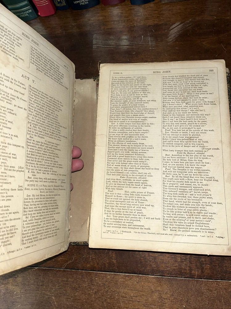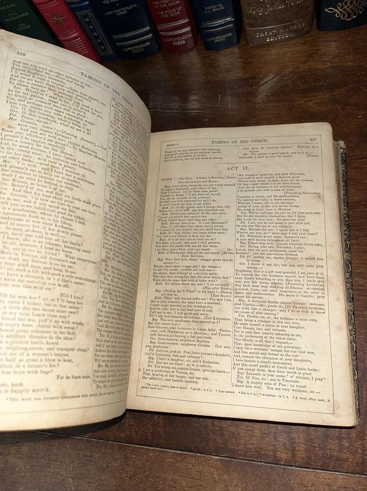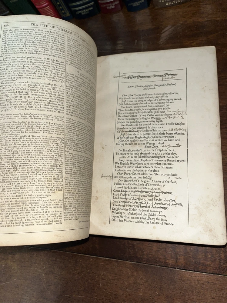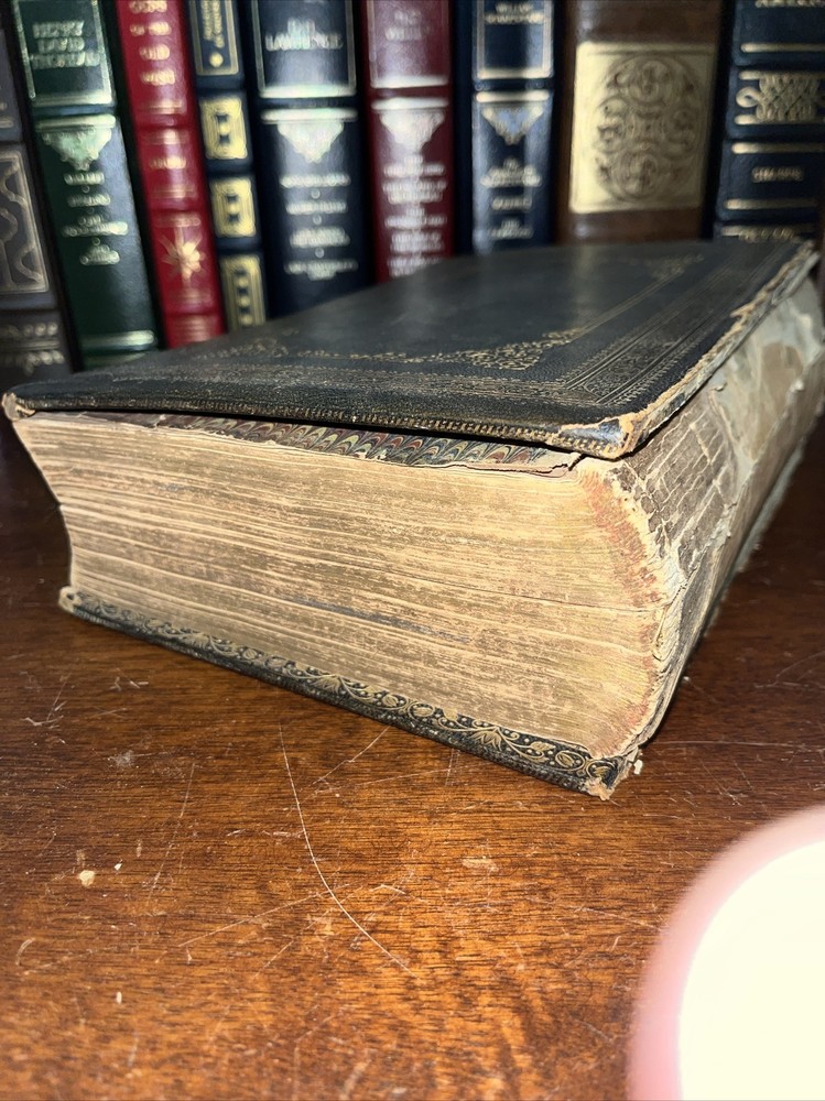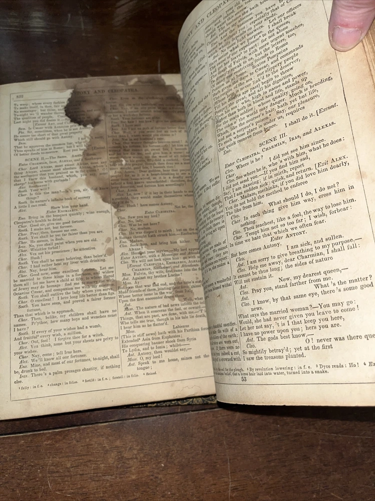 This rare find from 1853 is a true gem for any Shakespeare enthusiast. The leather-bound book features the complete works of the famous playwright, by Payne Collier ESQ F.S.A. The first edition is an original unique addition to any collection. The book was published by Redfield in New York and is in its original state. The language of the book is English. The book condition can be seen in photos, it is in rough condition but that is not surprising based on its age. . This 1853 edition is a must-have for any collector of antique literature. See photos for condition, parts of binding missing, and lets of wear and page stains, though some pages just show discoloration from age. (914)