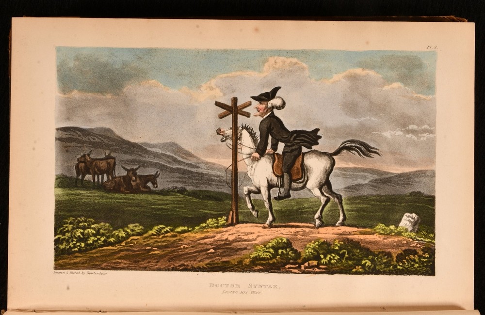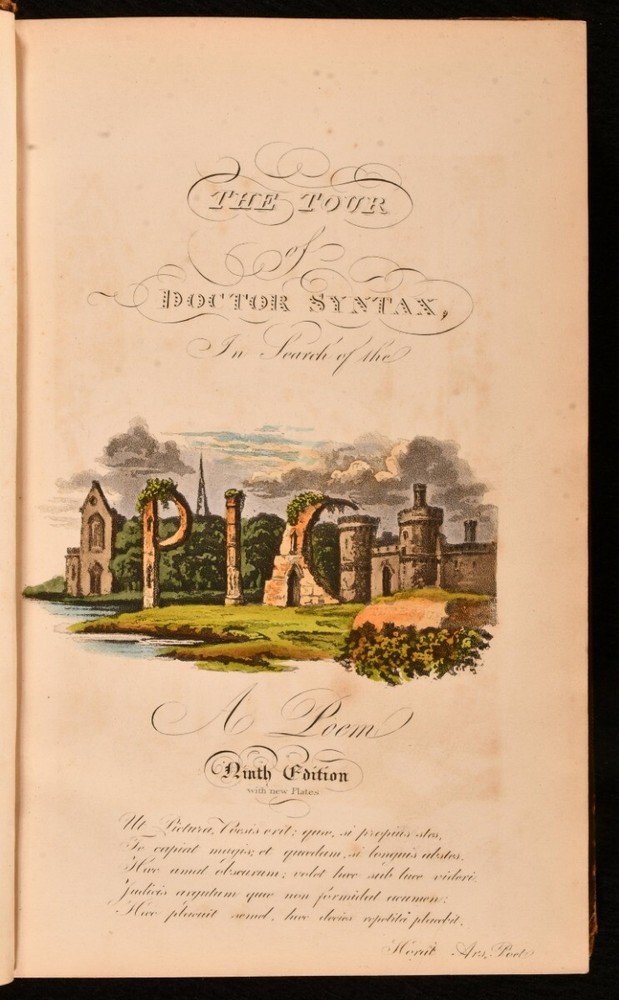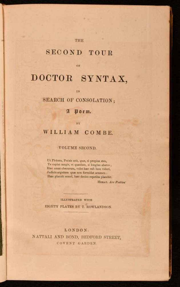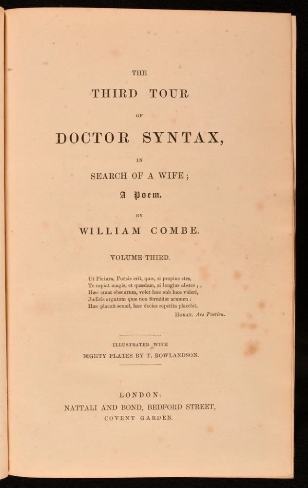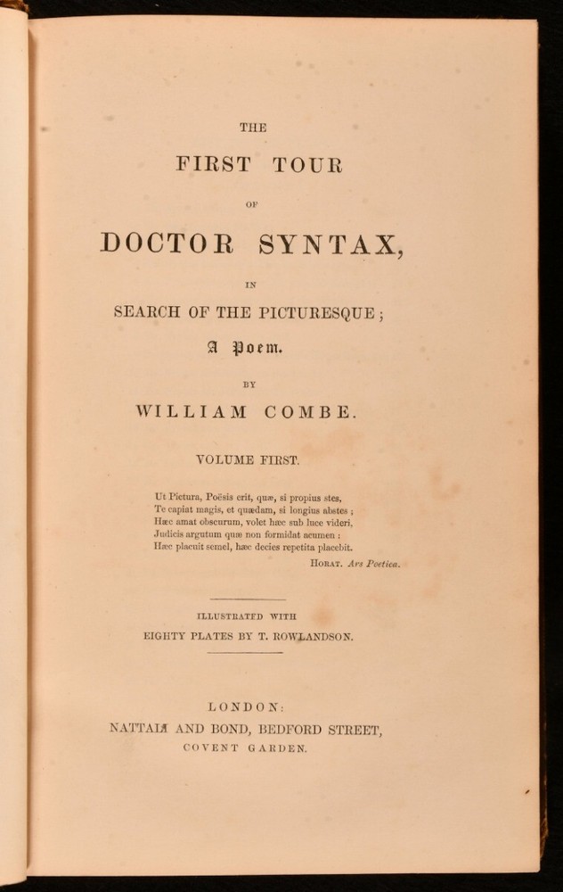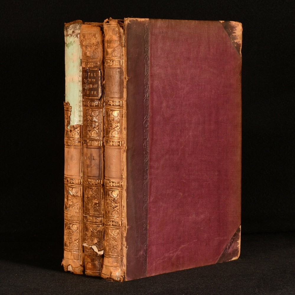 Click here to see our other books! The First, Second, and Third Tours of Doctor Syntax William Combe 1855 Nattali and Bond : London 9.5" by 6.5" [4], 272; [4], 277; [6], 279pp SUMMARY William Combe's satirical Doctor Syntax poetical series, complete with the striking hand-coloured plates by Thomas Rowlandson. Colour Plates,Illustrated,Leather Binding Overall Condition: Good Only This book weighs 3 KG when packed UK Postage: £ 3.99 US Postage: £ 36.99 EU Postage : £ 25.99 European Postage: £ 27.99 Asia Postage: £ 47.99 Worldwide Postage: £ 69.99 DESCRIPTION The complete three 'Doctor Syntax' poems by William Combe. 'The First Tour of Doctor Syntax' is the ninth edition. Illustrated with a hand-coloured frontispiece, a hand-coloured title page, and twenty-nine hand-coloured plates. Collated, complete. 'The Second Tour of Doctor Syntax, in Search of Consolation'. Illustrated with a hand-coloured frontispiece, and twenty-three hand-coloured plates. Collated, complete. 'The Third Tour of Doctor Syntax, in Search of a Wife'. Illustrated with a hand-coloured frontispiece, a hand-coloured title page, and twenty-three hand-coloured plates. Collated, complete. Nineteen plates are provided in loosely-inserted duplicates, which are less vibrantly hand-coloured. 'Doctor Syntax' is a comic character, a satire of William Gilpin. These three satirical poems show Syntax touring Britain, in order to describe his theory of the Picturesque. Written by William Combe, a British author, who is best remembered today for these three works. Illustrated by Thomas Rowlandson, a celebrated English artist and caricaturist. Each volume is undated, dated 1855 from Jisc from copies held at the University of Liverpool Library. CONDITION In a half calf binding with cloth to the boards. Externally, worn. Volume I is lacking part of the backstrip to the head, with a smaller amount of loss to the tail of Volume III. Lacking all but one spine label, the label to the head of the spine of Volume III is present but chipped and cracked. Tape to the tail of the spine of Volume III, holding the front board to the spine, otherwise front board is detached. Rubbing to the leather. Spines are faded. Light bumping to the extremities. Boards of Volume I are a little discoloured, with fading to the head of the rear board. Front board of Volume I is held by one cord only, rear joint and hinge are strained. Hinges of Volume II are strained. Rear hinge of Volume III is strained. Bookseller's label to the front paste downs. Internally, firmly bound. Pages are lightly age-toned and generally clean with some scattered spots. Preface to Volume III appears to be excised from another edition and bound in here after the title, with a tape repair to the margin. Overall Condition: Good Only GLOSSARY OF TERMS Overall Condition (Dustwrapper condition rating is shown after that for the book itself, where a dustwrapper is present) Fine - Very well preserved copy showing very little wear Very Good Indeed - Only one or two minor faults, really a very attractive copy Very Good - Quite a wide term meaning no major faults but probably several smaller ones often expected given the age of the book, but still a respectable copy Good - Meaning not very good. Some more serious faults as will be described in the condition report under 'condition' Good Only - Meaning one or more faults that could really do with repair Fair - As with good only above but with other faults leaving a compromised copy even after repair Poor - Really bad and possibly seriously incomplete. We only sell books in this condition where their rarity or value makes them attractive none the less. Major defects will be described. GUARANTEE We offer a full money back guarantee on our descriptions. Please ask for details and conditions. We prefer PAYPAL. If you pay via PAYPAL we will post the item off the same or the next working day with the postage you have selected. Please note we cannot accept USD cheques