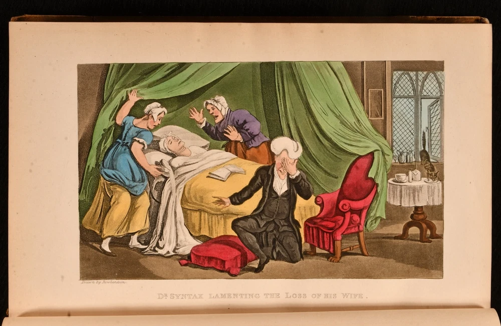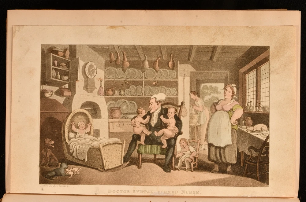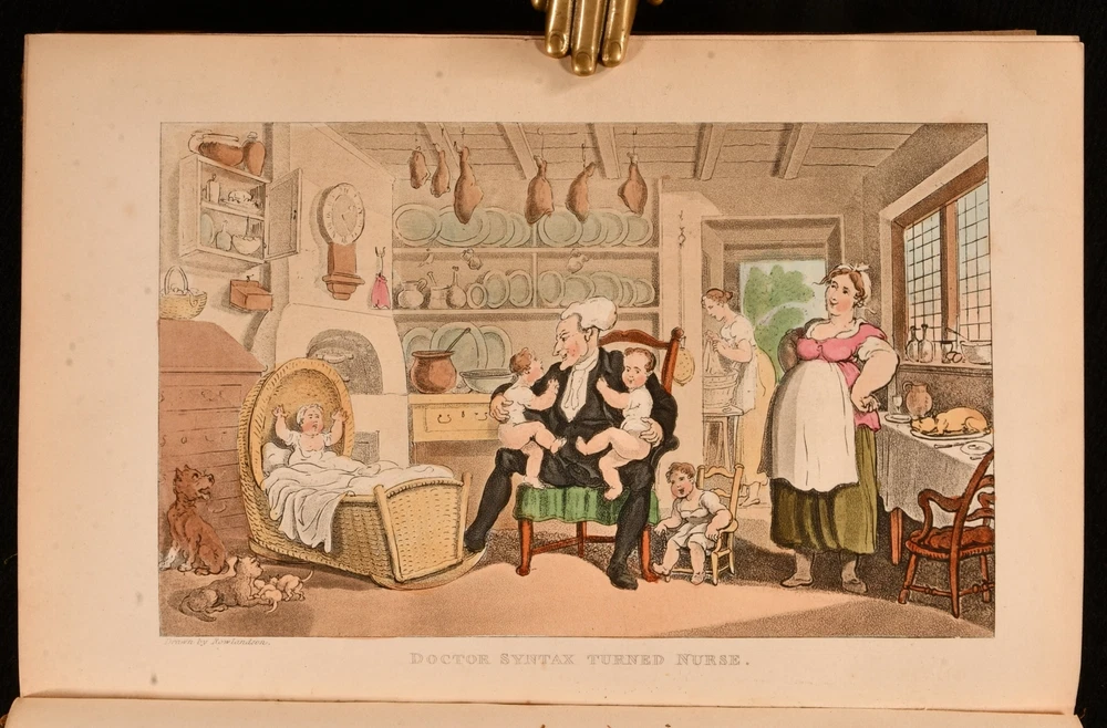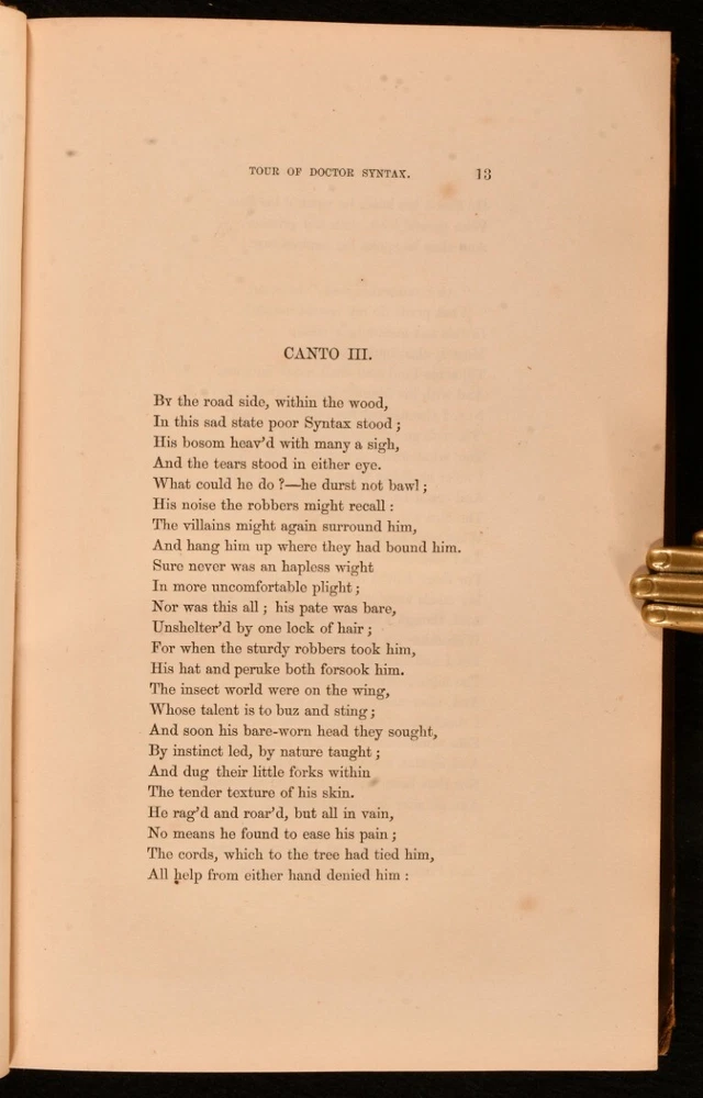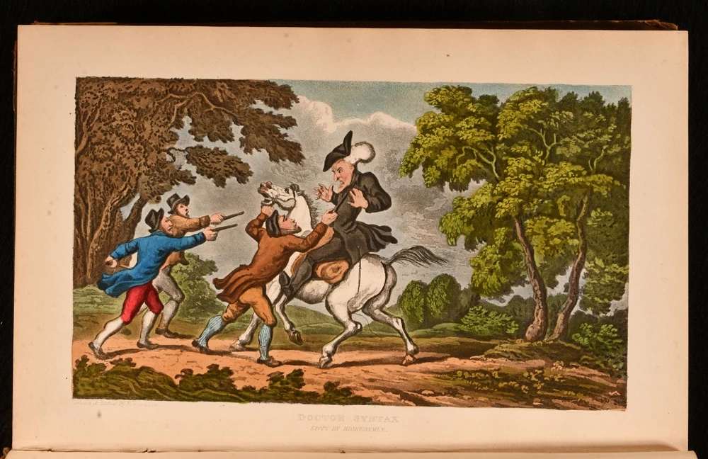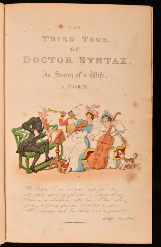 Click here to see our other books! The First, Second, and Third Tours of Doctor Syntax William Combe 1855 Nattali and Bond : London 9.5" by 6.5" [4], 272; [4], 277; [6], 279pp SUMMARY William Combe's satirical Doctor Syntax poetical series, complete with the striking hand-coloured plates by Thomas Rowlandson. Colour Plates,Illustrated,Leather Binding Overall Condition: Good Only This book weighs 3 KG when packed UK Postage: £ 3.99 US Postage: £ 36.99 EU Postage : £ 25.99 European Postage: £ 27.99 Asia Postage: £ 47.99 Worldwide Postage: £ 69.99 DESCRIPTION The complete three 'Doctor Syntax' poems by William Combe. 'The First Tour of Doctor Syntax' is the ninth edition. Illustrated with a hand-coloured frontispiece, a hand-coloured title page, and twenty-nine hand-coloured plates. Collated, complete. 'The Second Tour of Doctor Syntax, in Search of Consolation'. Illustrated with a hand-coloured frontispiece, and twenty-three hand-coloured plates. Collated, complete. 'The Third Tour of Doctor Syntax, in Search of a Wife'. Illustrated with a hand-coloured frontispiece, a hand-coloured title page, and twenty-three hand-coloured plates. Collated, complete. Nineteen plates are provided in loosely-inserted duplicates, which are less vibrantly hand-coloured. 'Doctor Syntax' is a comic character, a satire of William Gilpin. These three satirical poems show Syntax touring Britain, in order to describe his theory of the Picturesque. Written by William Combe, a British author, who is best remembered today for these three works. Illustrated by Thomas Rowlandson, a celebrated English artist and caricaturist. Each volume is undated, dated 1855 from Jisc from copies held at the University of Liverpool Library. CONDITION In a half calf binding with cloth to the boards. Externally, worn. Volume I is lacking part of the backstrip to the head, with a smaller amount of loss to the tail of Volume III. Lacking all but one spine label, the label to the head of the spine of Volume III is present but chipped and cracked. Tape to the tail of the spine of Volume III, holding the front board to the spine, otherwise front board is detached. Rubbing to the leather. Spines are faded. Light bumping to the extremities. Boards of Volume I are a little discoloured, with fading to the head of the rear board. Front board of Volume I is held by one cord only, rear joint and hinge are strained. Hinges of Volume II are strained. Rear hinge of Volume III is strained. Bookseller's label to the front paste downs. Internally, firmly bound. Pages are lightly age-toned and generally clean with some scattered spots. Preface to Volume III appears to be excised from another edition and bound in here after the title, with a tape repair to the margin. Overall Condition: Good Only GLOSSARY OF TERMS Overall Condition (Dustwrapper condition rating is shown after that for the book itself, where a dustwrapper is present) Fine - Very well preserved copy showing very little wear Very Good Indeed - Only one or two minor faults, really a very attractive copy Very Good - Quite a wide term meaning no major faults but probably several smaller ones often expected given the age of the book, but still a respectable copy Good - Meaning not very good. Some more serious faults as will be described in the condition report under 'condition' Good Only - Meaning one or more faults that could really do with repair Fair - As with good only above but with other faults leaving a compromised copy even after repair Poor - Really bad and possibly seriously incomplete. We only sell books in this condition where their rarity or value makes them attractive none the less. Major defects will be described. GUARANTEE We offer a full money back guarantee on our descriptions. Please ask for details and conditions. We prefer PAYPAL. If you pay via PAYPAL we will post the item off the same or the next working day with the postage you have selected. Please note we cannot accept USD cheques