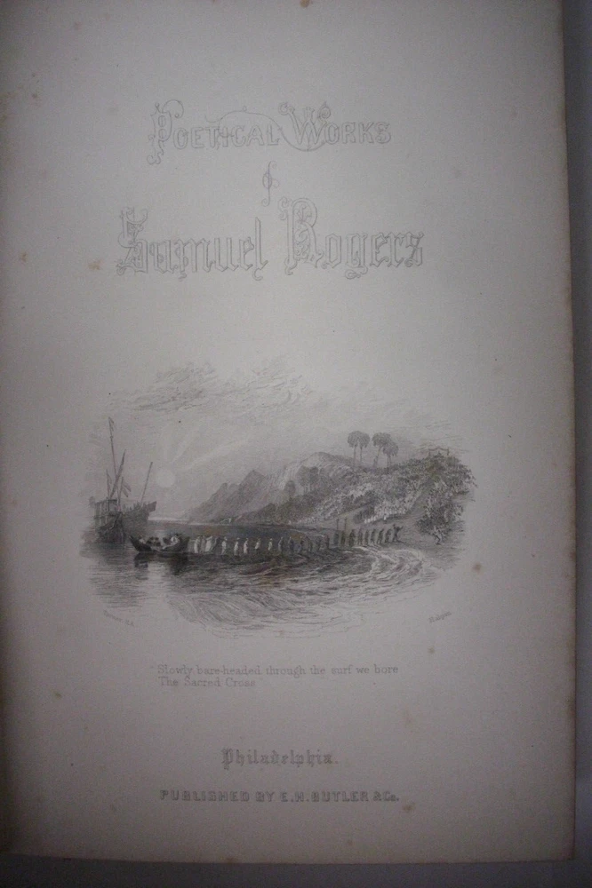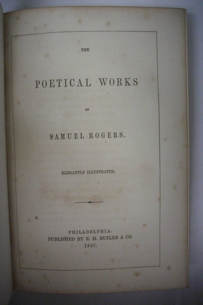 You are bidding on a splendid antique hardcover book titled The Poetical Works of Samuel Rogers. The book is Elegantly Illustrated with steel plate engravings. Published by E. H. Butler & Co., 1857. This is a magnificent volume bound in blue full leather with ornate gilt designs. The book is illustrated, including fabulous steel-plate plates! Samuel Rogers (30 July 1763 – 18 December 1855) was an English poet, during his lifetime one of the most celebrated, although his fame has long since been eclipsed by his Romantic colleagues and friends Wordsworth, Coleridge and Byron. His recollections of these and other friends such as Charles James Fox are key sources for information about London artistic and literary life, with which he was intimate, and which he used his wealth to support. He made his money as a banker and was also a discriminating art collector. The book features full leather binding with profuse use of gold designs. The spine has five raised bands with gold lettering and ornate gold compartmentalised designs. There is gold ornamentation on the outside edge of covers and even has a lovely gilt perimeter on inside of covers! The covers are securely attached with no cracking or splitting of hinges. The corners and edges show some wear and scuffing. The pages tightly bound with some foxing to some pages, although most pages have none. The outside edges of pages have gilt edge. Book even has a bound-in silk ribbon bookmarker. Book shows some wear but remains in overall near-very good condition. It's a beauty! Would make a nice addition to a collection. Great gift idea! (Inventory: 106) Track Page Views With Auctiva's FREE Counter