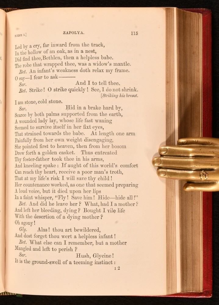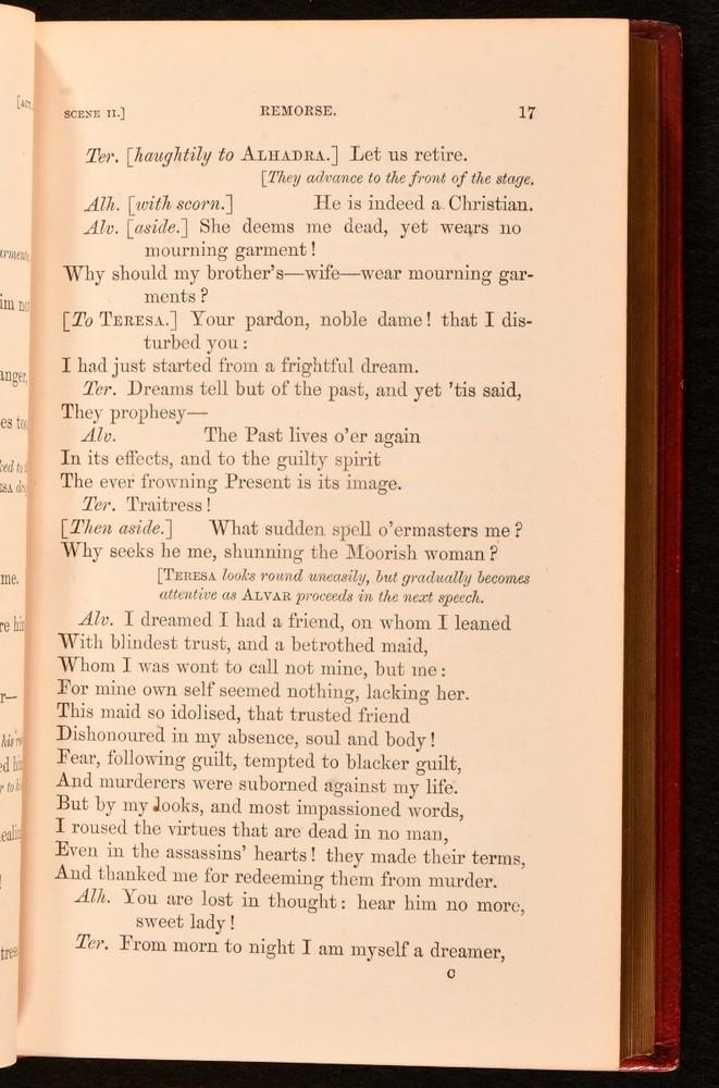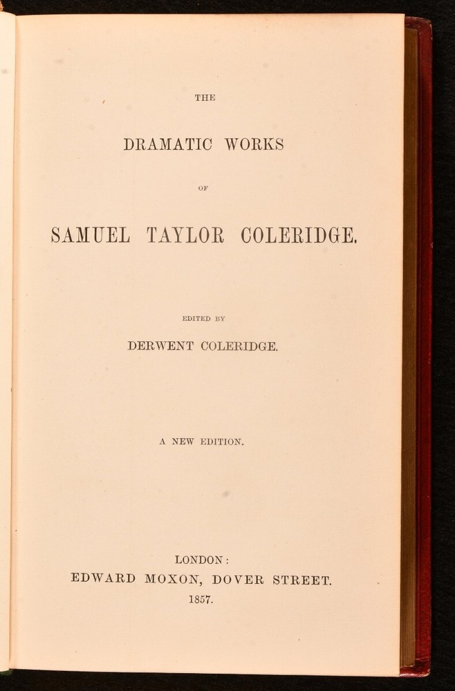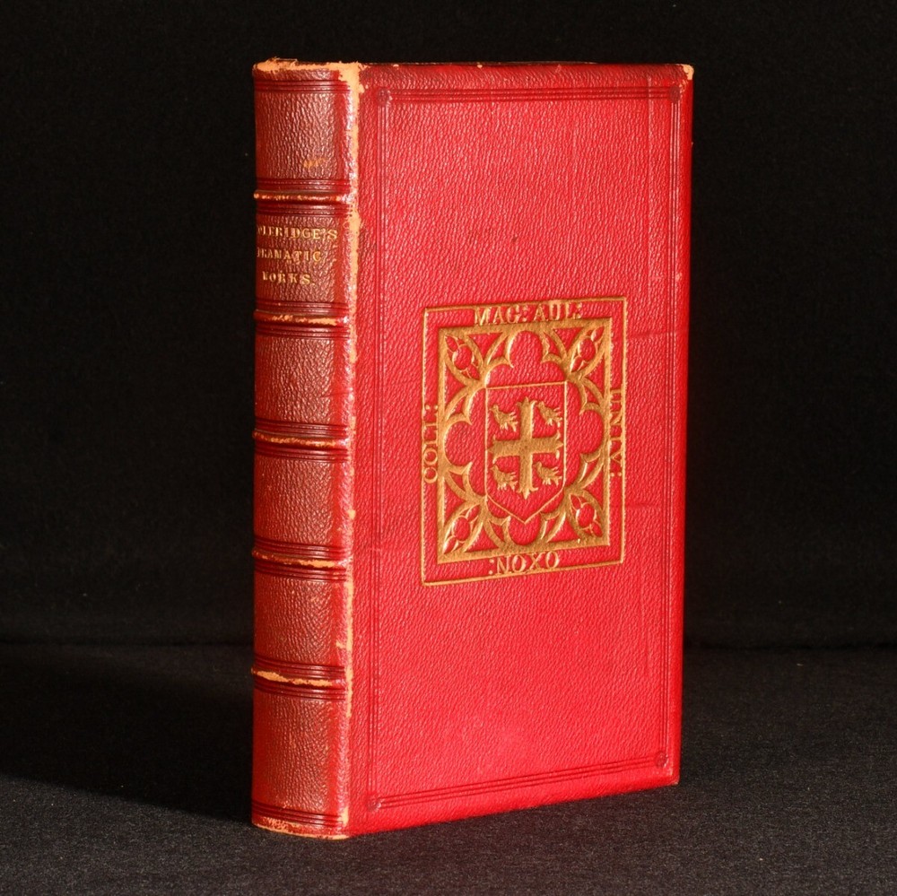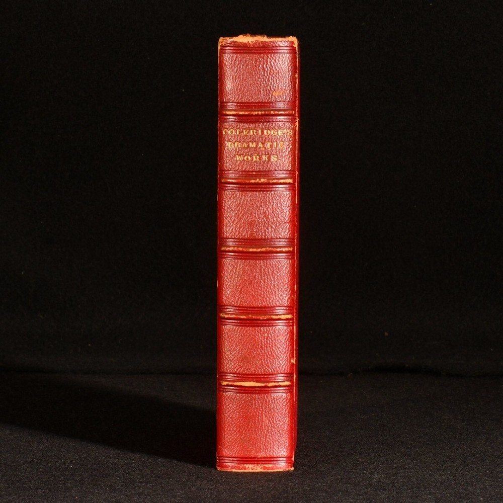 Click here to see our other books! The Dramatic Works of Samuel Taylor Coleridge Samuel Taylor Coleridge 1857 Edward Moxon : London 6.5" by 4.5" xiv, [2], 427pp SUMMARY The collected dramatic works of Samuel Taylor Coleridge, a volume of five plays bound for Magdalene College, Oxford. Leather Binding,Prize Binding Overall Condition: Very Good This book weighs 0.75 KG when packed UK Postage: £ 3.99 US Postage: £ 19.99 EU Postage : £ 15.99 European Postage: £ 16.99 Asia Postage: £ 21.99 Worldwide Postage: £ 25.99 DESCRIPTION A new edition. In a prize binding for Magdalene College, Oxford. The dramatic works of Samuel Taylor Coleridge, this volume including 'Remorse', 'Zapolya' Parts I and II, 'The Piccolomini', and 'The Death of Wallenstein'. Samuel Taylor Coleridge was an English poet, literary critic and philosopher. He founded the Romantic movement along with his friend William Wordsworth. He is best known for his poems 'The Rime of the Ancient Mariner' and 'Kubla Kahn' as well as his influential critical works. Edited by Derwent Coleridge, the son of the author. CONDITION In a full morocco binding, bound for Magdalene College, Oxford. Externally, a little rubbed, mostly to the spine and extremities. Spine is discoloured. A few small marks to the boards. Faint tide mark to the front endpapers. Internally, firmly bound. Pages are bright and clean with only the occasional spot. Overall Condition: Very Good GLOSSARY OF TERMS Overall Condition (Dustwrapper condition rating is shown after that for the book itself, where a dustwrapper is present) Fine - Very well preserved copy showing very little wear Very Good Indeed - Only one or two minor faults, really a very attractive copy Very Good - Quite a wide term meaning no major faults but probably several smaller ones often expected given the age of the book, but still a respectable copy Good - Meaning not very good. Some more serious faults as will be described in the condition report under 'condition' Good Only - Meaning one or more faults that could really do with repair Fair - As with good only above but with other faults leaving a compromised copy even after repair Poor - Really bad and possibly seriously incomplete. We only sell books in this condition where their rarity or value makes them attractive none the less. Major defects will be described. GUARANTEE We offer a full money back guarantee on our descriptions. Please ask for details and conditions. We prefer PAYPAL. If you pay via PAYPAL we will post the item off the same or the next working day with the postage you have selected. Please note we cannot accept USD cheques