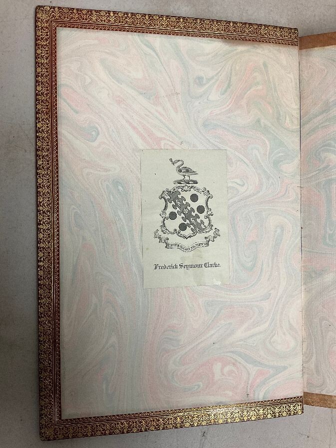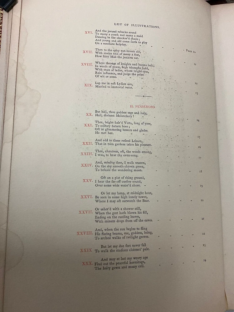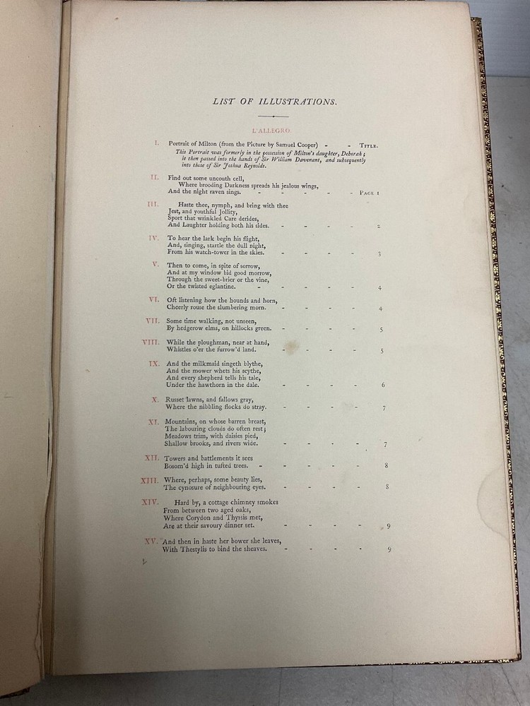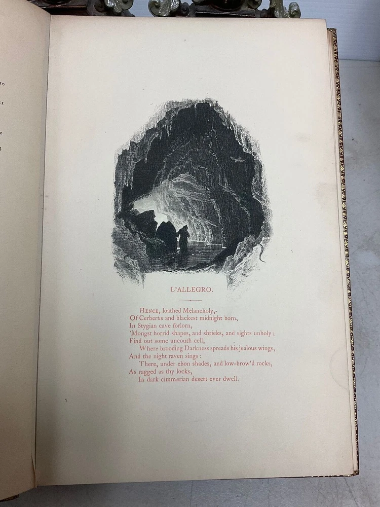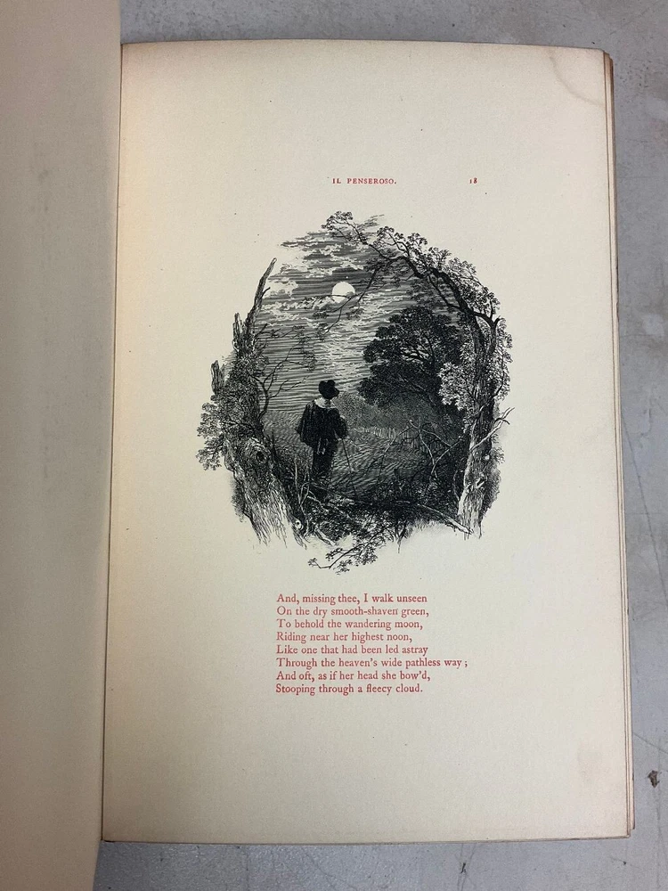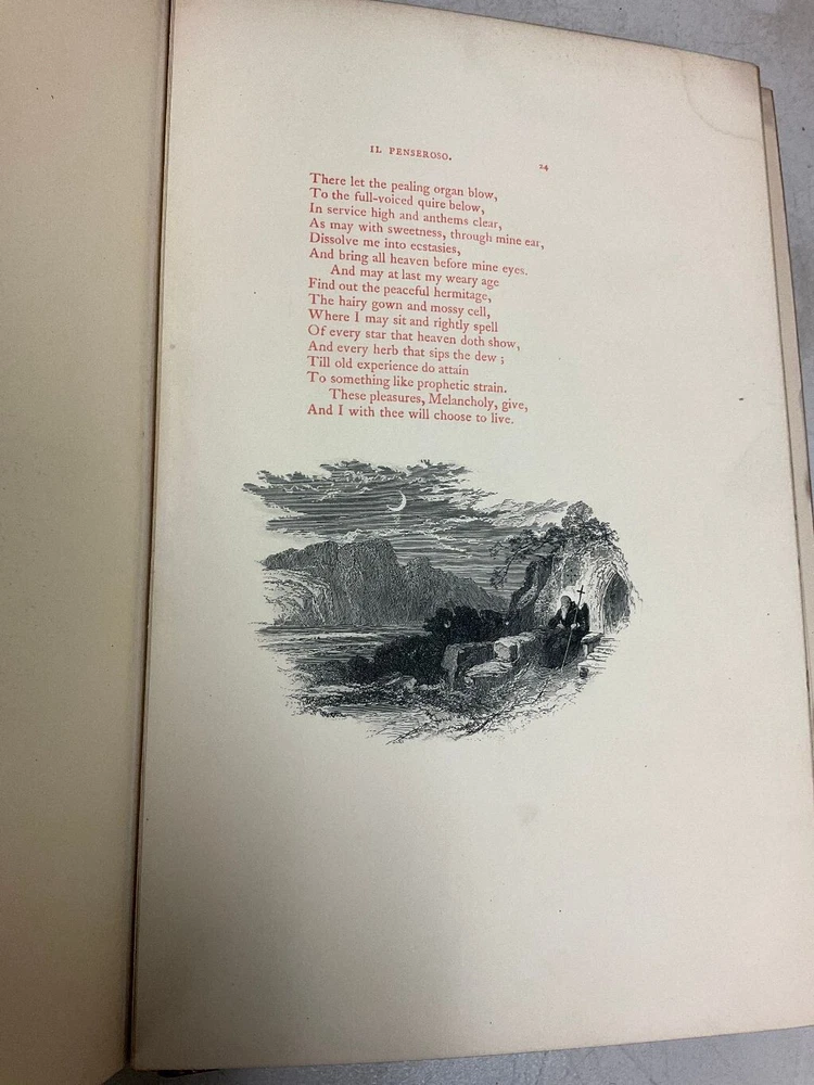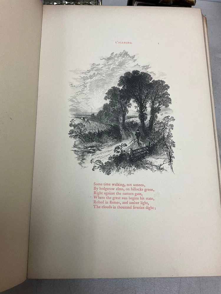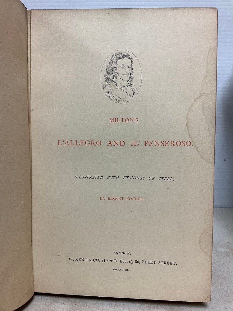 Attention Collectors and Poetry Lovers!!! You are bidding on a very rare and hardcover book titled Milton's L'Allegro And Il Penseroso. Magnificently Illustrated with Etchings on Steel by Birket Foster. Published in London by W. Kent & Co., 1858. This is the collectible First Edition. Book is fully bound in red leather with gold titling on spine. Spine has five raised bands. Title page in red and black. 24 numbered stiff-card engraved leaves. Each leaf features an etching accompanied with lines of verse in red text . This is a very rare book. The book is bound in full leather. It measures approximately 11" high and 7 1/2" wide. The leather binding is in very good condition. Covers are tightly bound with no cracking or splitting of hinges or gutters. Has intricate gold design on the inside perimeter of covers. All pages are tightly bound. Most of the pages have a soil mark at the top corner. It does not affect any text or engraved art. The title page has the most soiling with it being on right side of page. The first blank page has some scribbling from a ball point pen. Book has a tasteful previous owner bookplate belonging to Frederick Seymour Clarke. I have lowered the price of this book because of the soiling to the pages, otherwise this book would retail for hundreds of dollars. Would make a terrific addition to a collection. (Inventory: 334-A-1) Track Page Views With Auctiva's FREE Counter