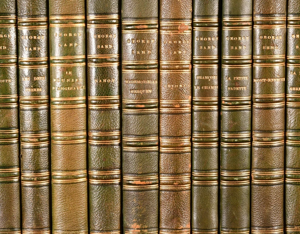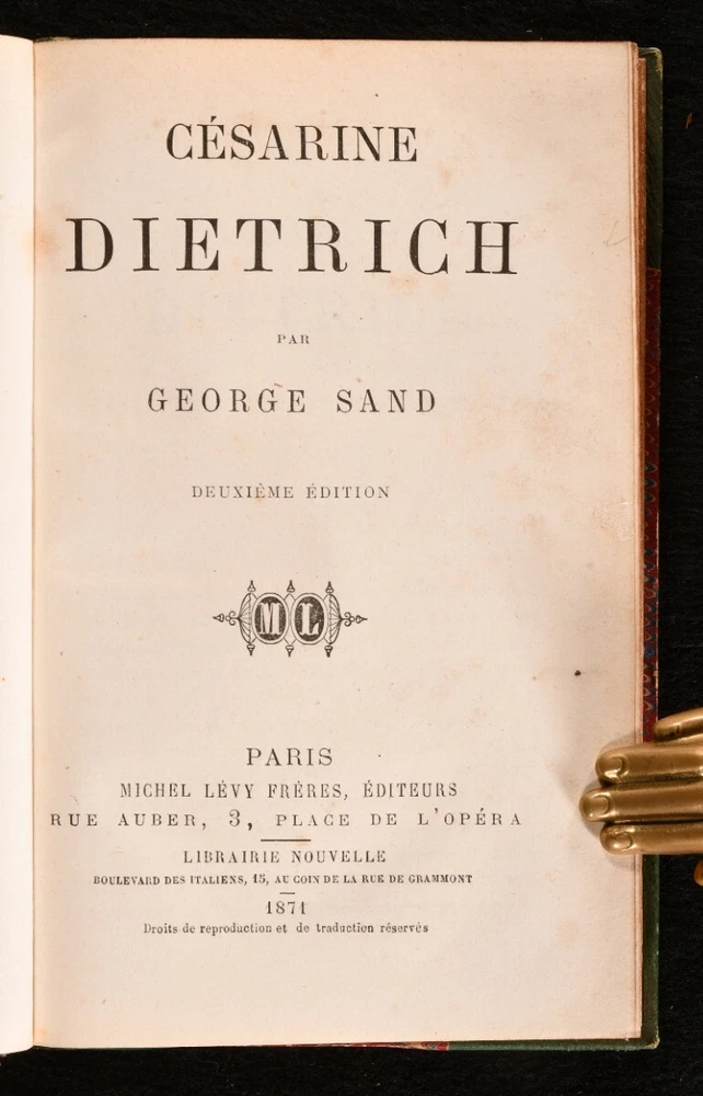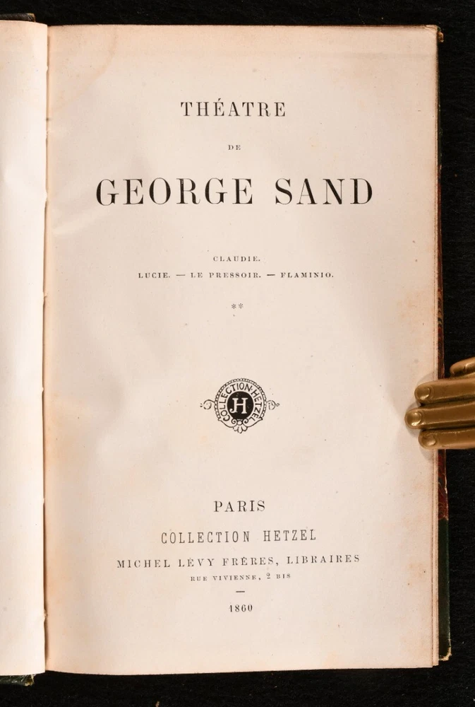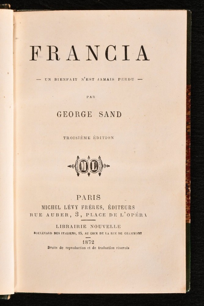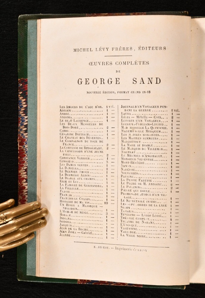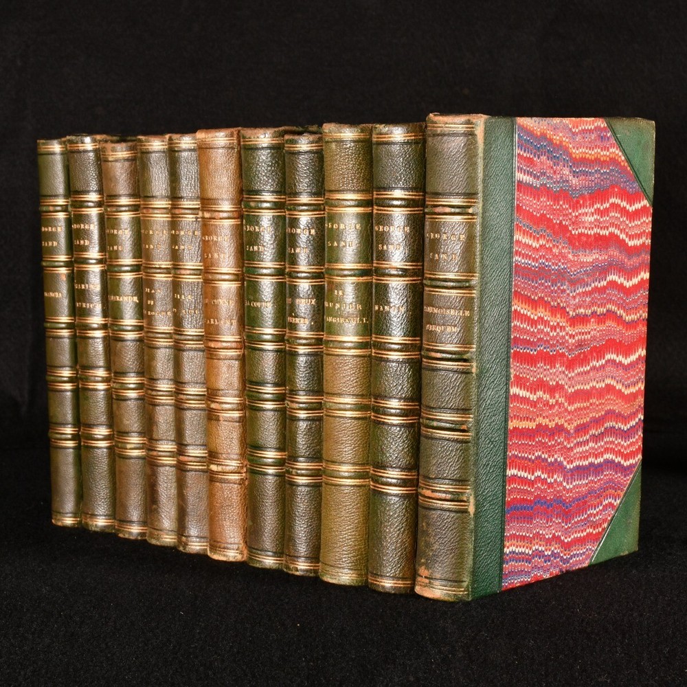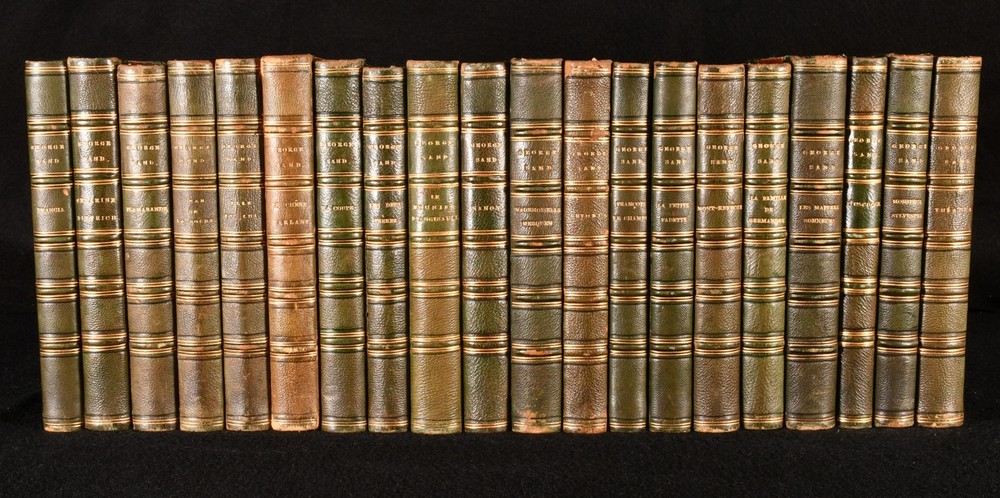 Click here to see our other books! Oeuvres Completes de George Sand George Sand 1860-78 Michel Levy Freres : Paris 7" by 4.5" SUMMARY A collection of the complete works of George Sand in uniform bindings from the Librairie Nouvelle series, twenty volumes in the original French. Leather Binding,Rebound Overall Condition: Very Good This book weighs 10 KG when packed UK Postage: £ 4.49 US Postage: £ 68.99 EU Postage : £ 36.99 European Postage: £ 65.99 Asia Postage: £ 129.99 Worldwide Postage: £ 229.99 DESCRIPTION Twenty volumes containing the complete works of George Sand, from the 'Oeuvres Completes' series of the Librairie Nouvelle edition, early printings of the new edition except ;Theatre de George Sand' which is from the Collection Hetzel. In the original French. Uniform half morocco bindings, complete with half titles. George Sand was Amantine Lucile Aurore Dupin's pen-name, extremely popular and influential French author in the nineteenth century, she is renowned as one of the most notable writers of the European Romantic movement, more popular than Victor Hugo and Honoré de Balzac in England. Her novels were particularly influential for Russian and English literature, and her writings and political views also informed numerous Spanish and Latin American authors. The present collection is comprised of the following titles: Francia; Antonia; Francois le Champi; La Petite Fadette; Mont-Reveche; La Famille de Germandre; Flamarande; Jean de la Roche; Elle et Lui; Le Chene Parlant; La Coupe; Cesarine Dietrich; Les Deux Freres; Le Meunier d'Angibault; Nanon; Mademoiselle Merquem; Les Maitres Sonneurs; L'Uscoque; Monsieur Sylvestre; Theatre de George Sand. Elle et Lui was bound in without a half title or title page. Most volumes feature John Clarke Hawkshaw's (1841-1921) bookplate to the front pastedowns, British civil engineer. CONDITION In uniform half morocco bindings over marbled boards, green endpapers, sprinkled edges. Externally generally very smart with minor shelf wear only, minor rubbing to the head and tail of spines and extremities of the boards, light scuffing to the leather of the odd volume, particularly to that of 'Le Chen Parlant'. Some rubbing to the joints of 'Mont-Reveche.' The spine of 'Le Chene Parlant' is particularly sunned. John Clarke Hawkshaw's bookplate to the front pastedowns of most volumes. Internally, firmly bound. Minor loss to the lower margin p. 109 of 'Francia', no loss of text. Light spotting generally scattered to the leaves, although some volumes present clean pages. Light minor damp marking to the lower margin of the first few leaves of 'La Coupe,' and to the margins of the first few leaves of 'Nanon,' not affecting any of the text. Overall Condition: Very Good GLOSSARY OF TERMS Overall Condition (Dustwrapper condition rating is shown after that for the book itself, where a dustwrapper is present) Fine - Very well preserved copy showing very little wear Very Good Indeed - Only one or two minor faults, really a very attractive copy Very Good - Quite a wide term meaning no major faults but probably several smaller ones often expected given the age of the book, but still a respectable copy Good - Meaning not very good. Some more serious faults as will be described in the condition report under 'condition' Good Only - Meaning one or more faults that could really do with repair Fair - As with good only above but with other faults leaving a compromised copy even after repair Poor - Really bad and possibly seriously incomplete. We only sell books in this condition where their rarity or value makes them attractive none the less. Major defects will be described. GUARANTEE We offer a full money back guarantee on our descriptions. Please ask for details and conditions. We prefer PAYPAL. If you pay via PAYPAL we will post the item off the same or the next working day with the postage you have selected. Please note we cannot accept USD cheques