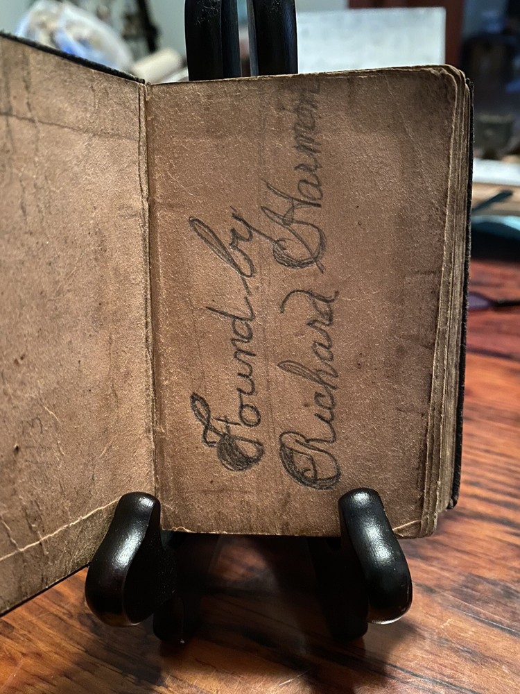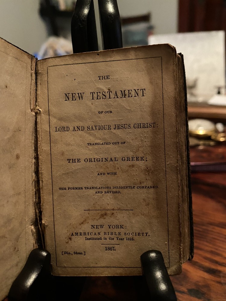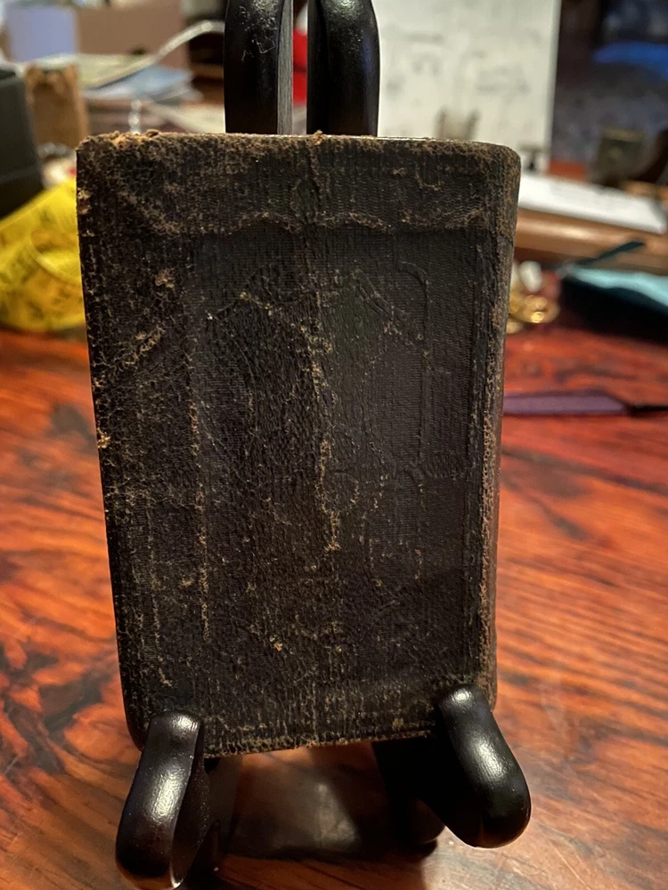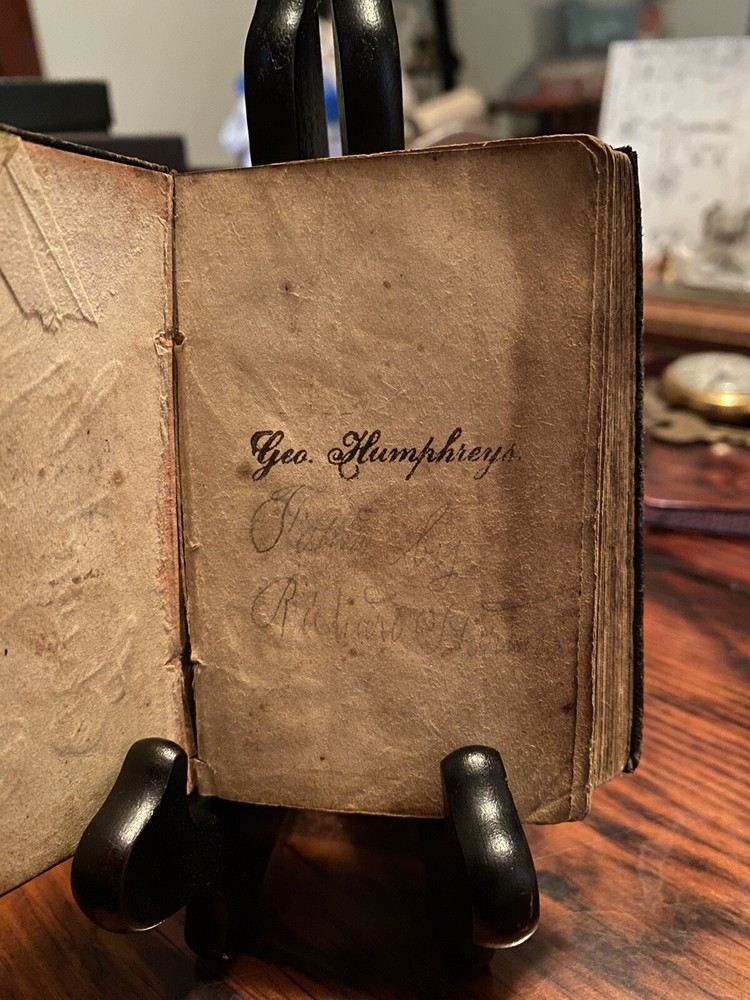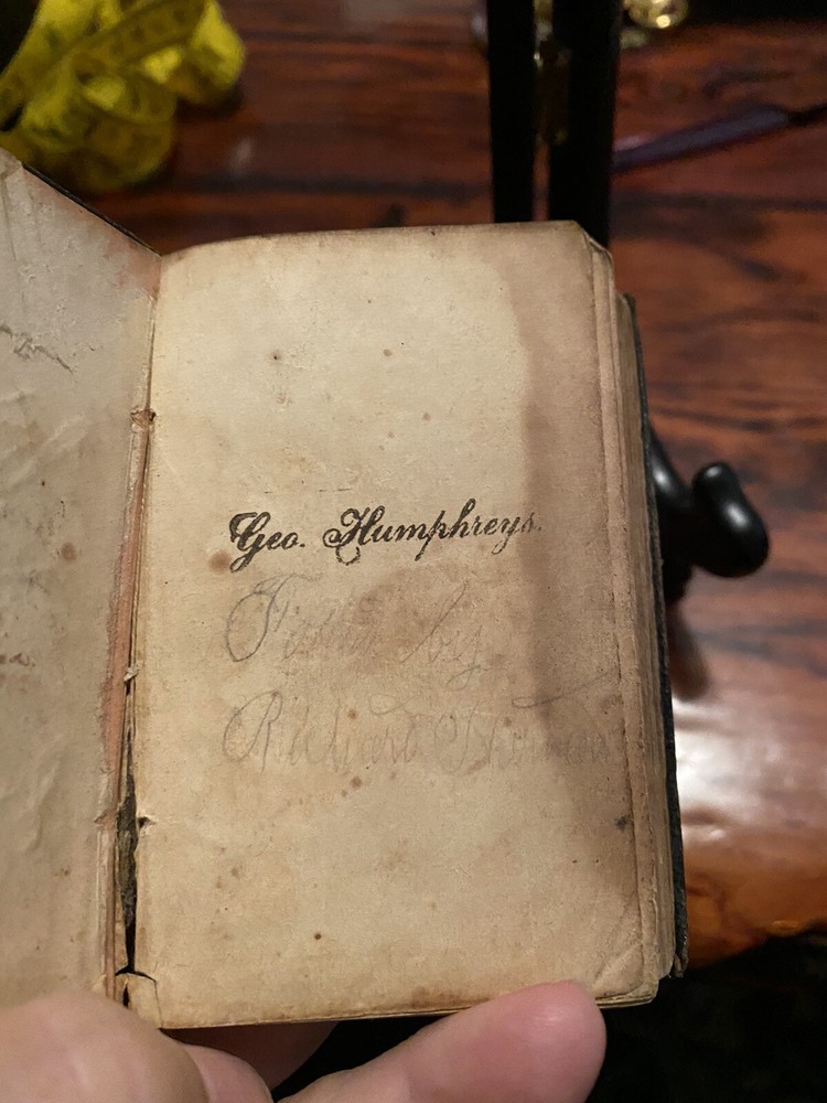 1867 New Testament. Shipped with USPS Media Mail. Has the name Geo Humphries printed or stamped in Bible. Also has hand written ‘Found by Richard Harmon” twice. Has some water damage at back see photos I found this Richmond, Va as far as I can remember. Measures 3 3/4 inches tall.