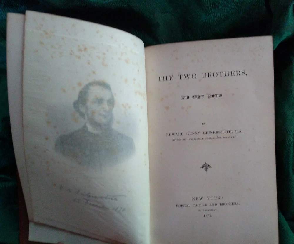 1871 - TWO BROTHERS and Other Poems by Edward Henry Bickersteth Top Edge Gilt First Edition Hardcover volume is tight and intact with previous owners name in ink on frontice page. Partial separation from spine (please check photos for details), and foxing to pages. Hard to find first edition.
