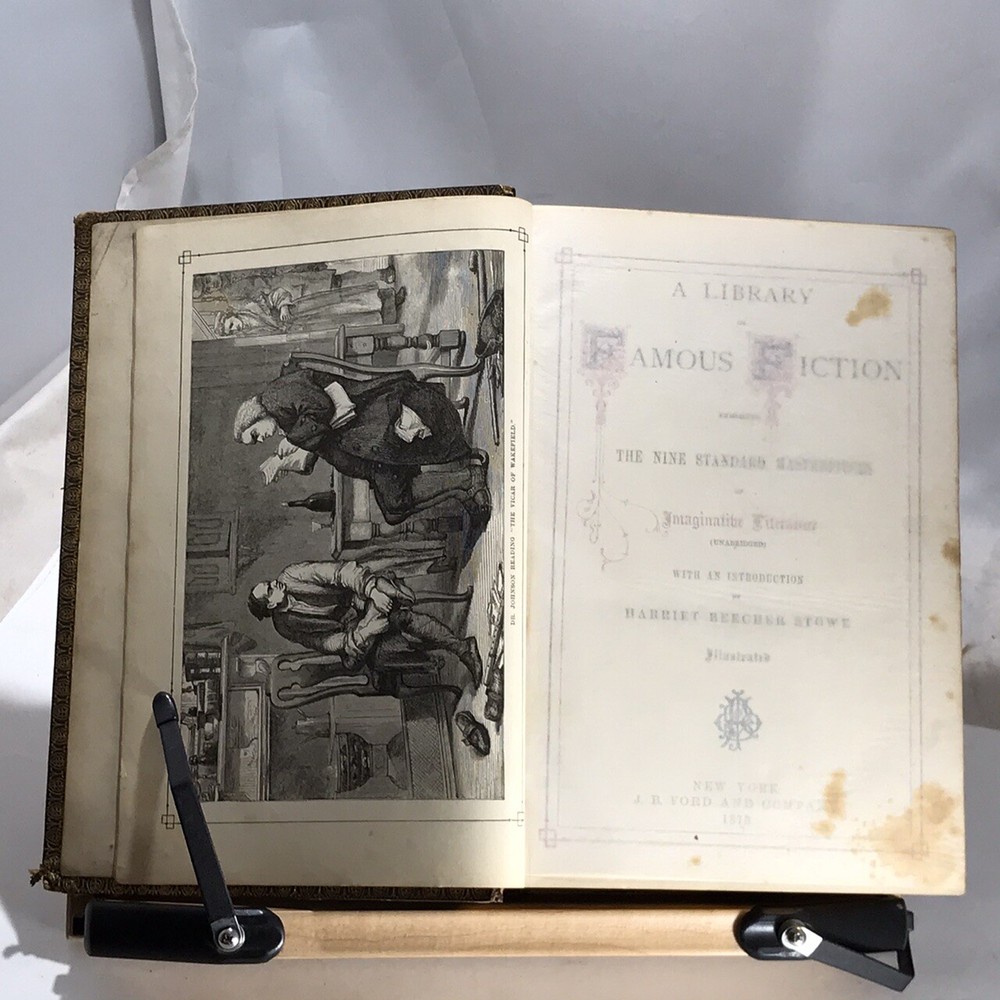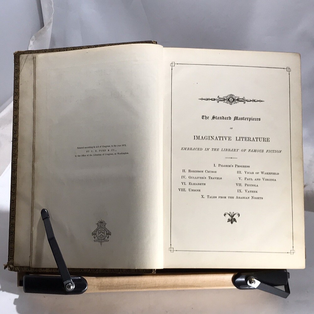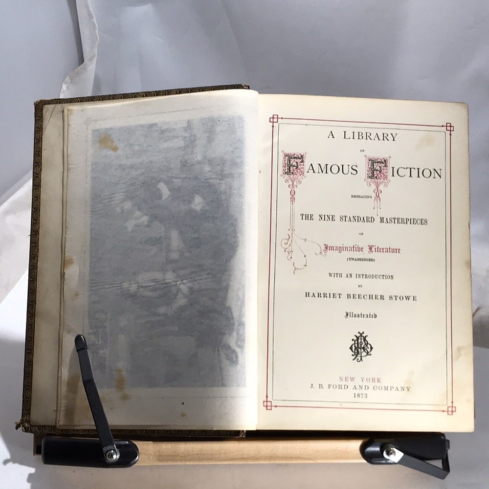 A Library of Famous Fiction Embracing The Nine Standard Masterpieces of Imaginative Literature with an Introduction by Harriet Beecher Stowe, Illustrated, J.B. Ford and Company, New York, 1873, leather, 1065 pages, small 4to. In good condition. Boards show corner and edge wear. Spine has light scuffing. Nicely marbled end papers. Text block is lightly toned, but unmarked. Some foxing on frontispiece guard. Last page is loose from binding, however binding is still tight and intact. Please see photos. Still-sound and tight bound example includes such classics as Pilgrim’s Progress, Gulliver’s Travels, Robinson Crusoe, The Vicar of Wakefield and five others. A nice copy. COLL1873ABCB-variant