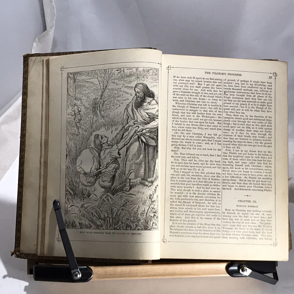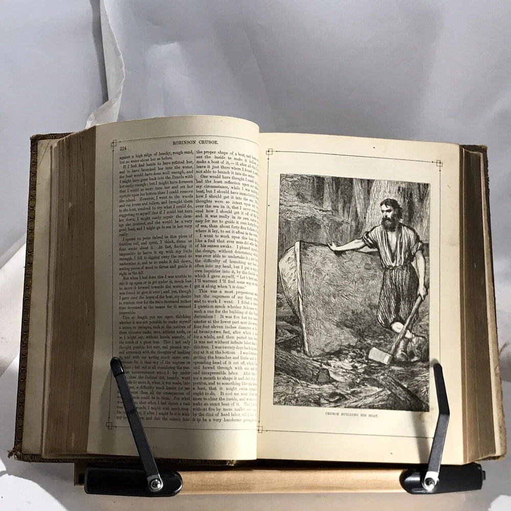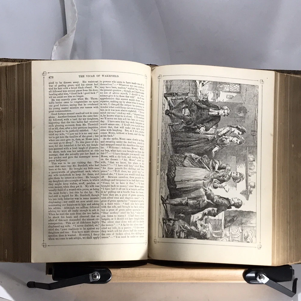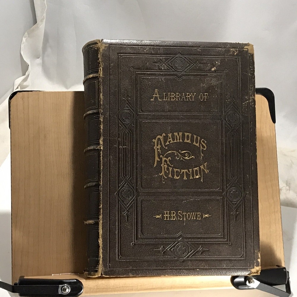 A Library of Famous Fiction Embracing The Nine Standard Masterpieces of Imaginative Literature with an Introduction by Harriet Beecher Stowe, Illustrated, J.B. Ford and Company, New York, 1873, leather, 1065 pages, small 4to. In good condition. Boards show corner and edge wear. Spine has light scuffing. Nicely marbled end papers. Text block is lightly toned, but unmarked. Some foxing on frontispiece guard. Last page is loose from binding, however binding is still tight and intact. Please see photos. Still-sound and tight bound example includes such classics as Pilgrim’s Progress, Gulliver’s Travels, Robinson Crusoe, The Vicar of Wakefield and five others. A nice copy. COLL1873ABCB-variant