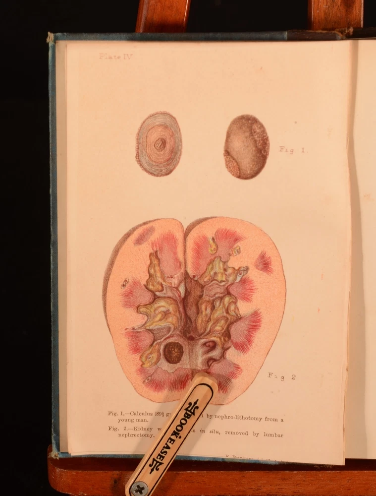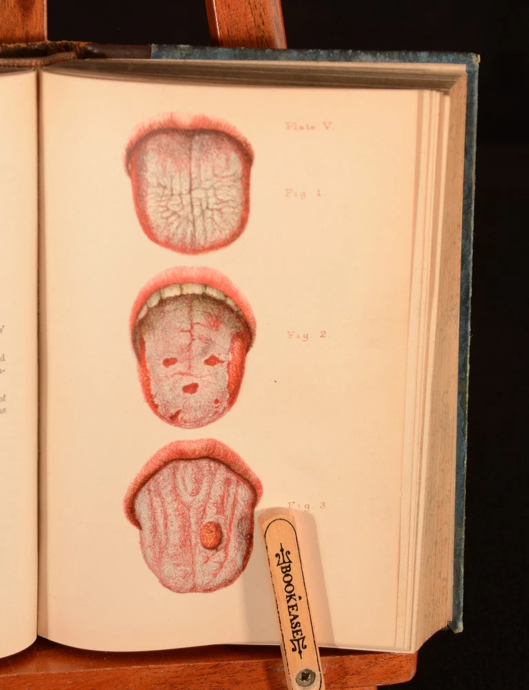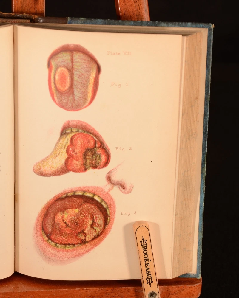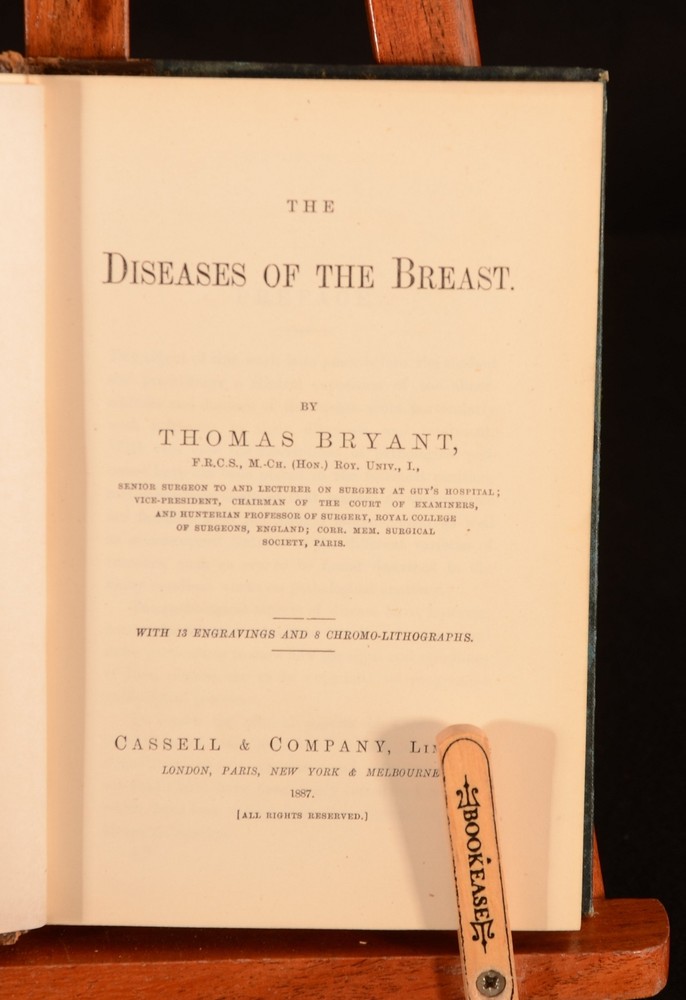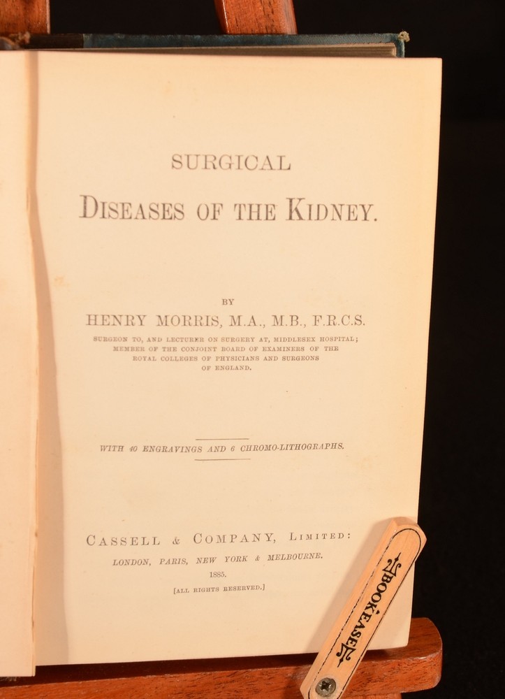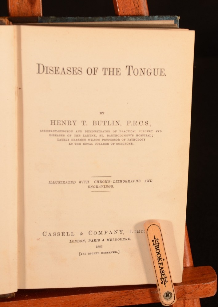 Click here to see our other books! Diseases of the Tongue by Henry T. Butlin Surgical Diseases of the Kidney by Henry Morris The Diseases of the Breast by Thomas Bryant Henry T. Butlin; Henry Morris; Thomas Bryant 1885-1887 Cassell and Company : London 7" by 4.5" [viii] 451; [viii] 548; [viii] 358pp. SUMMARY A highly illustrated collection of detailed medical works written by three renowned doctors in their specified fields. Colour Plates,First Edition,Illustrated Overall Condition: Good This book weighs 2 KG when packed UK Postage: £ 3.99 US Postage: £ 29.99 EU Postage : £ 21.99 European Postage: £ 23.99 Asia Postage: £ 37.99 Worldwide Postage: £ 38.99 DESCRIPTION First editions. Part of the Clinical Manuals For Practitioners And Students Of Medicine series. Collated complete as follows: Diseases of the Tongue contains eight coloured plates and numerous other vignette illustrations. Surgical Diseases of the Kidney contains six coloured plates and numerous other vignette illustrations. Plate IV has been bound as a frontispiece. The Diseases of the Breast contains eight coloured plates and numerous other vignette illustrations. All half-titles are present. This quarter leather first edition of the work was published without publisher's advertisements. Sir Henry Butlin was a British surgeon who was considered the father of British head and neck surgery. This work, entitled 'Diseases of the Tongue' is a highly informative instructional work for medical students and includes discussion regarding a number of diseases and infections relating to the tongue with many demonstrative pictures. Henry Morris was a lecturer and surgeon perhaps best known for his work The Anatomy of the Joints of Man. Morris was also the first surgeon to successfully remove a kidney stone from a patient, with the stone itself now preserved in the Hospital Museum. Morris a prolific author writing many highly detailed medical works including this one relating to surgical diseases of the kidney. Thomas Bryant was a senior surgeon and lecturer at Guy's Hospital. This work 'Diseases of the Breast' is unusual as it contains almost wholly evidence and information based upon Bryant's personal medical experience and does not rely on secondary medical evidence or cases. A fascinating three volume set of medical works, meant to educate, written by leaders in their respective fields and highly illustrated. CONDITION In uniform quarter straight grain morocco with gilt detail to the spine. Externally generally smart with rubbing to the extremities, joints and spine resulting in some slight loss to the leather. Loss to spine label of 'Diseases of the Tongue'. Damp staining to boards of each volume. Hinges are slightly strained to each volume with frontispiece of 'Diseases of the Kidney' loosening. Internally firmly bound. Pages generally bright and clean with the odd spot and marginal age toning. Overall Condition: Good GLOSSARY OF TERMS Overall Condition (Dustwrapper condition rating is shown after that for the book itself, where a dustwrapper is present) Fine - Very well preserved copy showing very little wear Very Good Indeed - Only one or two minor faults, really a very attractive copy Very Good - Quite a wide term meaning no major faults but probably several smaller ones often expected given the age of the book, but still a respectable copy Good - Meaning not very good. Some more serious faults as will be described in the condition report under 'condition' Good Only - Meaning one or more faults that could really do with repair Fair - As with good only above but with other faults leaving a compromised copy even after repair Poor - Really bad and possibly seriously incomplete. We only sell books in this condition where their rarity or value makes them attractive none the less. Major defects will be described. GUARANTEE We offer a full money back guarantee on our descriptions. Please ask for details and conditions. We prefer PAYPAL. If you pay via PAYPAL we will post the item off the same or the next working day with the postage you have selected. Please note we cannot accept USD cheques