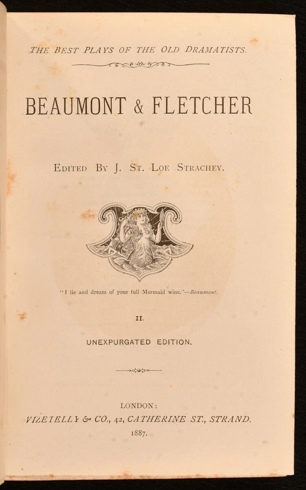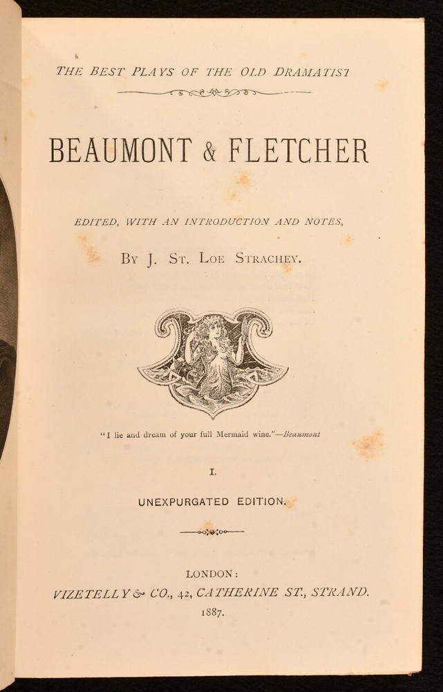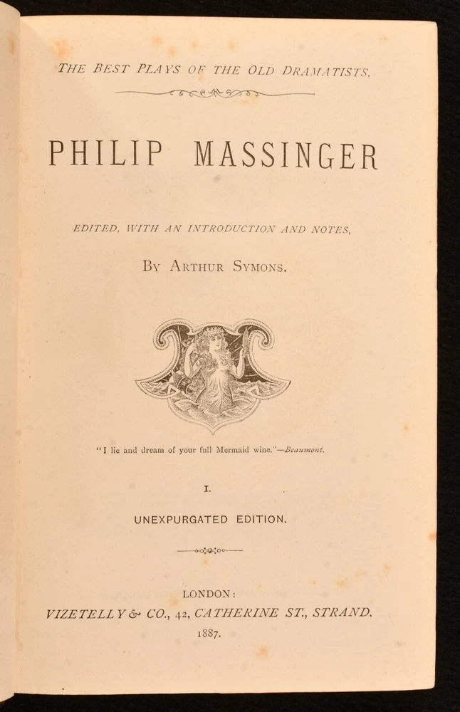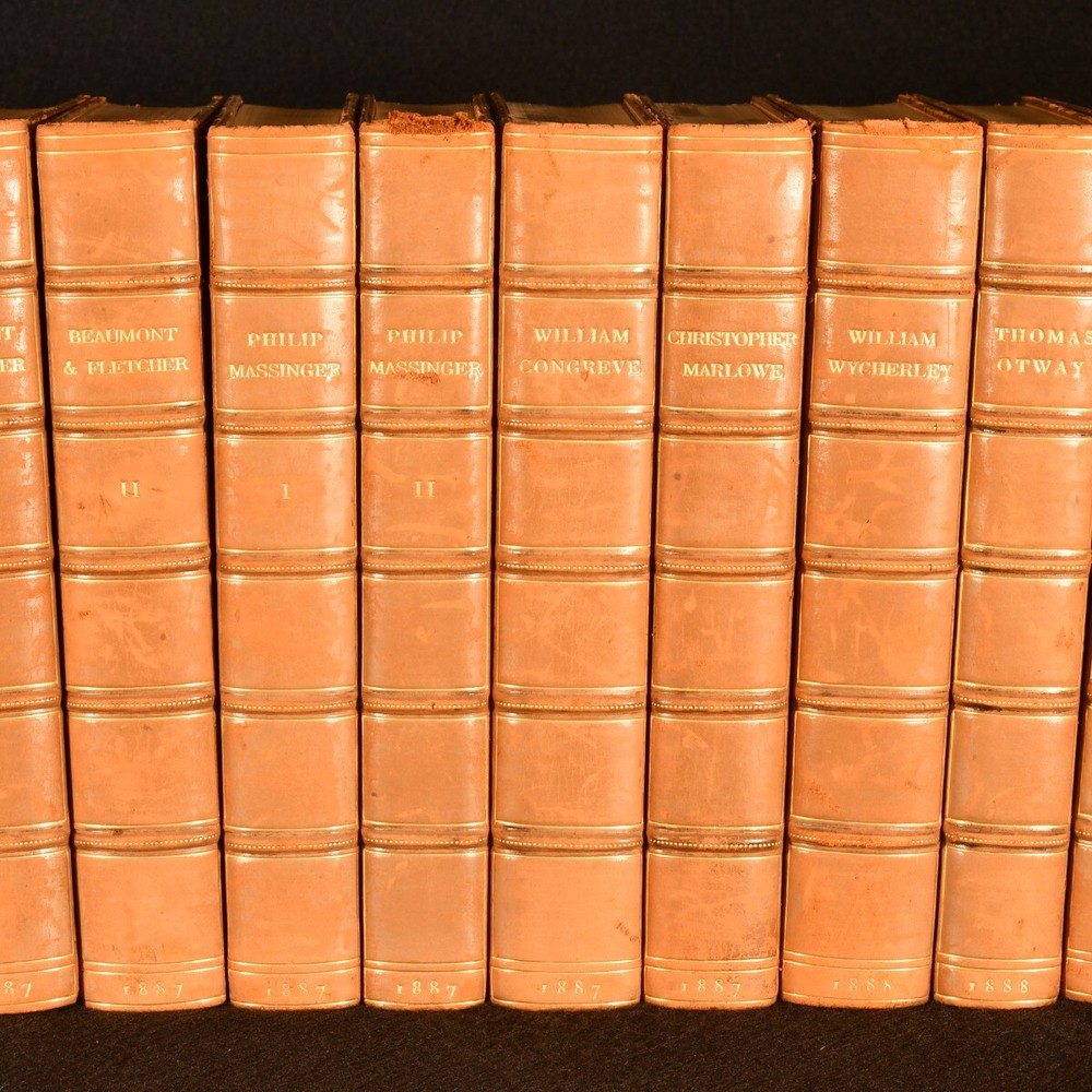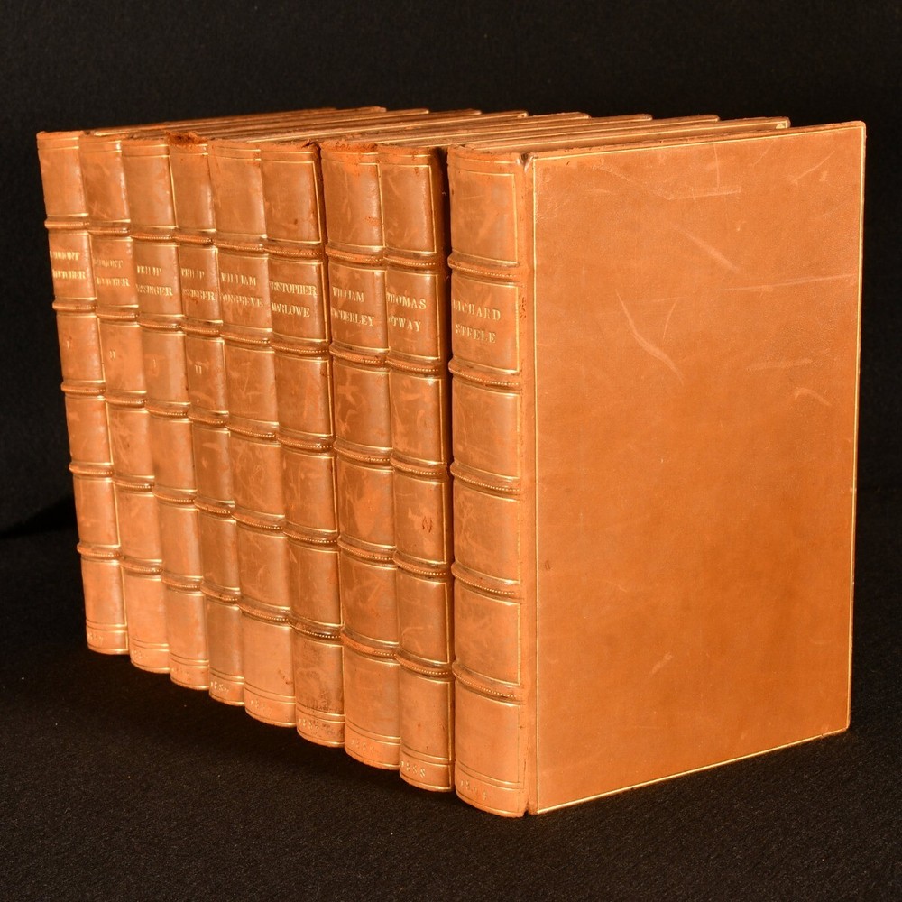Click here to see our other books! From The Mermaid Series: The Best Plays of the Old Dramatists Various 1887-1894 Vizetelly & Co. : London 7.5" by 5" xxxv, 471; viii, 520; xxxii, 496; 469; xli, 486; xlviii, 431; xlviii, 508; l, 392; lxxi, 452pp. SUMMARY A smartly bound collection of volumes from the Mermaid Series: The Best Plays of the Old Dramatists. Leather Binding Overall Condition: Very Good This book weighs 3 KG when packed UK Postage: £ 3.99 US Postage: £ 36.99 EU Postage : £ 25.99 European Postage: £ 27.99 Asia Postage: £ 47.99 Worldwide Postage: £ 69.99 DESCRIPTION Nine volumes. From The Mermaid Series: The Best Plays of the Old Dramatists. With a frontispiece to each volume. This set includes: Beaumont & Fletcher, 1887. Volume I and II. A collection containing The Maid's Tragedy, Philaster, The Wild-Goose Chase, and more. Edited with an introduction and notes by John St Loe Strachey, a British journalist and newspaper proprietor. Philip Massinger, 1887. Volume I and II. A collection containing The Duke of Milan, The Maid of Honour, The City Madam, and more. Edited with an introduction and notes by Arthur William Symons, a British poet, critic, translator and magazine editor. William Congreve, 1887. A collection containing The Old Bachelor, Love for Love, The Mourning Pride, and more. Edited with an introduction and notes by Alexander Charles Ewald, an English civil servant, known as a historical writer. Christopher Marlowe, 1887. A collection containing Tamburlaine the Great, The Jew of Malta, Edward the Second, and more. Edited by Havelock Ellis, an English-French physician, eugenicist, writer, progressive intellectual and social reformer. With an introduction by John Addington Symonds Jr was an English poet and literary critic. William Wycherley, 1888. A collection containing Love in a Wood, The Country Wife, The Plain Dealer, and more. Edited with an introduction and notes by W. C. Ward, a British literary critic. Thomas Otway, 1888. A collection containing Don Carlos, The Orphan, Venice Preserved, and more. With an introduction and notes by the Honourable Roden Noel, an English poet and biographer. Richard Stele, 1894. A collection containing The Funeral, The Lying Lover, The Tender Husband, and more. Edited with an introduction and notes by G. A. Aitken, a British author and critic. Bound by Wallis. CONDITION Bound in full tan calf. Externally, smart with light rubbing to the extremities and minor loss to the head of the spine to the odd volume. Light fading to the spine with the odd small mark to the boards. Internally, firmly bound. Pages are very bright with light scattered spotting. Further spotting to the first and last few pages. Bound by Wallis. Overall Condition: Very Good GLOSSARY OF TERMS Overall Condition (Dustwrapper condition rating is shown after that for the book itself, where a dustwrapper is present) Fine - Very well preserved copy showing very little wear Very Good Indeed - Only one or two minor faults, really a very attractive copy Very Good - Quite a wide term meaning no major faults but probably several smaller ones often expected given the age of the book, but still a respectable copy Good - Meaning not very good. Some more serious faults as will be described in the condition report under 'condition' Good Only - Meaning one or more faults that could really do with repair Fair - As with good only above but with other faults leaving a compromised copy even after repair Poor - Really bad and possibly seriously incomplete. We only sell books in this condition where their rarity or value makes them attractive none the less. Major defects will be described. GUARANTEE We offer a full money back guarantee on our descriptions. Please ask for details and conditions. We prefer PAYPAL. If you pay via PAYPAL we will post the item off the same or the next working day with the postage you have selected. Please note we cannot accept USD cheques