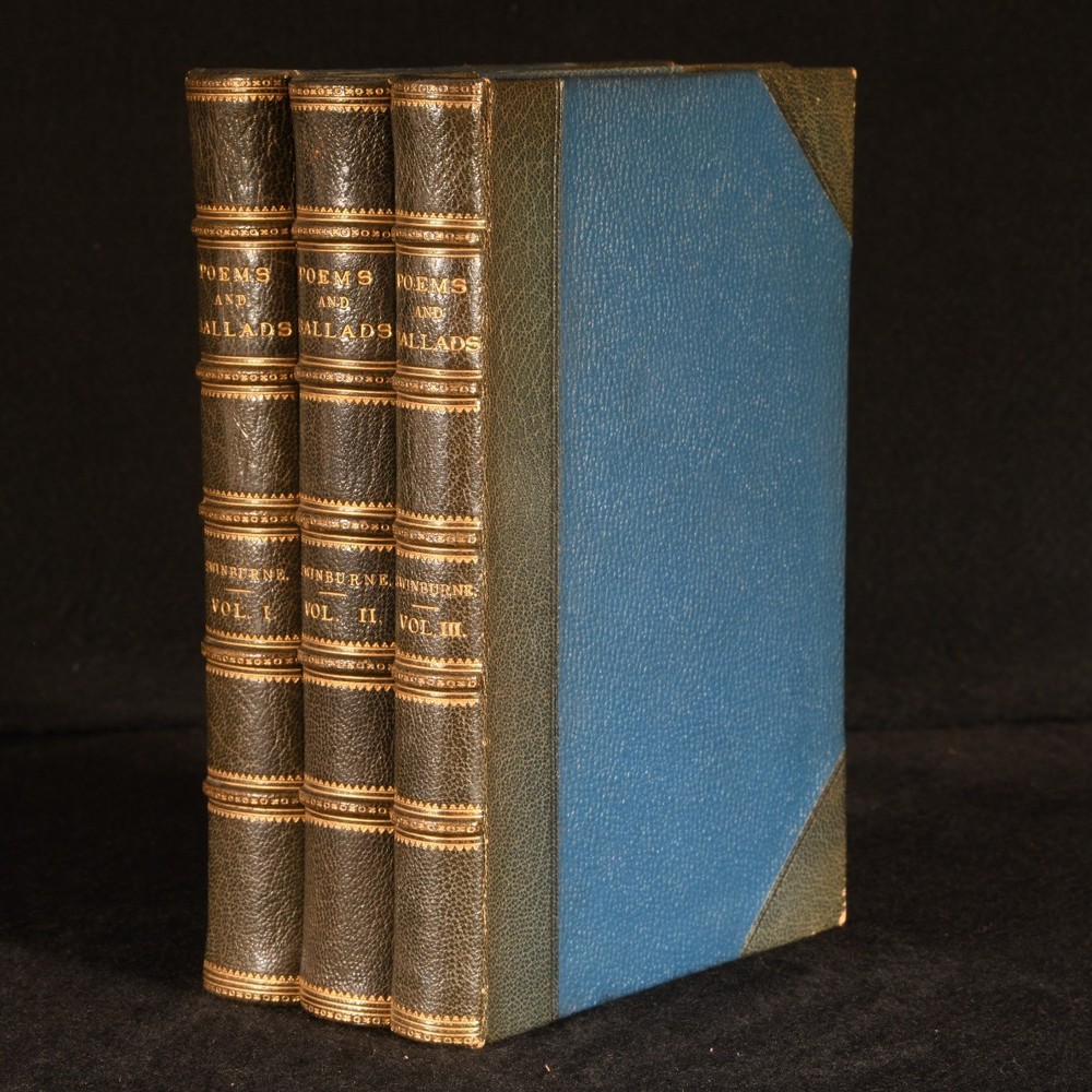 Click here to see our other books! Poems and Ballads Algernon Charles Swinburne 1889-1891 Chatto and Windus : London 7.5" by 5" ix, 338; ix, 240; viii, 181pp SUMMARY A handsome complete set of the poetry and ballads of Algernon Charles Swinburne. Leather Binding Overall Condition: Near Fine This book weighs 1 KG when packed UK Postage: £ 3.99 US Postage: £ 22.99 EU Postage : £ 16.99 European Postage: £ 17.99 Asia Postage: £ 22.99 Worldwide Postage: £ 28.99 DESCRIPTION A complete three-volume set containing the works of English poet, playwright and novelist, Algernon Charles Swinburne. Uniformly bound in half crushed morocco, with cloth boards and marbled endpapers. Swinburne's writing often touched on many taboo topics, such as sado-masochism and anti-theism, with common motifs including time, the ocean, and death mentioned. This set comprises the following editions: First Series (1891) - Stated as a "new edition" Second Series (1889) - Sixth edition Third Series (1889) - Second edition CONDITION Uniformly bound in half crushed morocco, with cloth boards and marbled endpapers. Externally, very smart, with slight rubbing to the extremities. With the bookplate of one Stephen G. Holland to the front pastedowns. Internally, with the front free endpaper detached but present to Vol III, otherwise firmly bound. With bright and clean pages. Overall Condition: Near Fine GLOSSARY OF TERMS Overall Condition (Dustwrapper condition rating is shown after that for the book itself, where a dustwrapper is present) Fine - Very well preserved copy showing very little wear Very Good Indeed - Only one or two minor faults, really a very attractive copy Very Good - Quite a wide term meaning no major faults but probably several smaller ones often expected given the age of the book, but still a respectable copy Good - Meaning not very good. Some more serious faults as will be described in the condition report under 'condition' Good Only - Meaning one or more faults that could really do with repair Fair - As with good only above but with other faults leaving a compromised copy even after repair Poor - Really bad and possibly seriously incomplete. We only sell books in this condition where their rarity or value makes them attractive none the less. Major defects will be described. GUARANTEE We offer a full money back guarantee on our descriptions. Please ask for details and conditions. We prefer PAYPAL. If you pay via PAYPAL we will post the item off the same or the next working day with the postage you have selected. Please note we cannot accept USD cheques