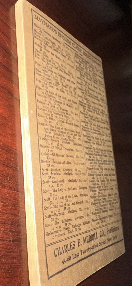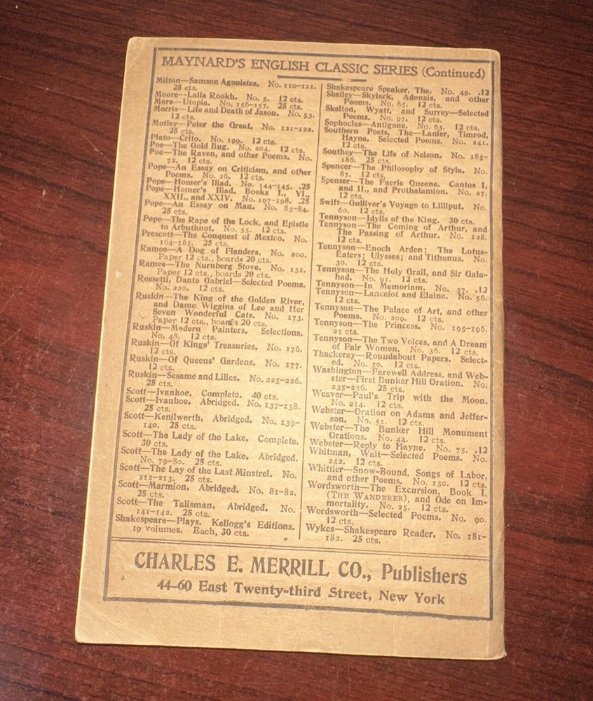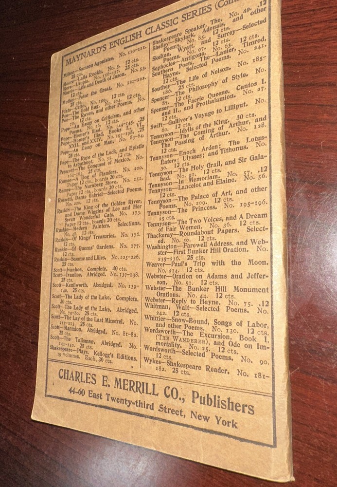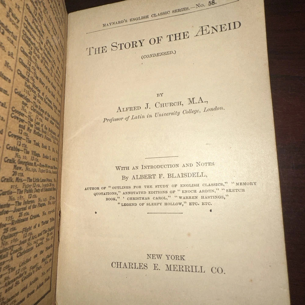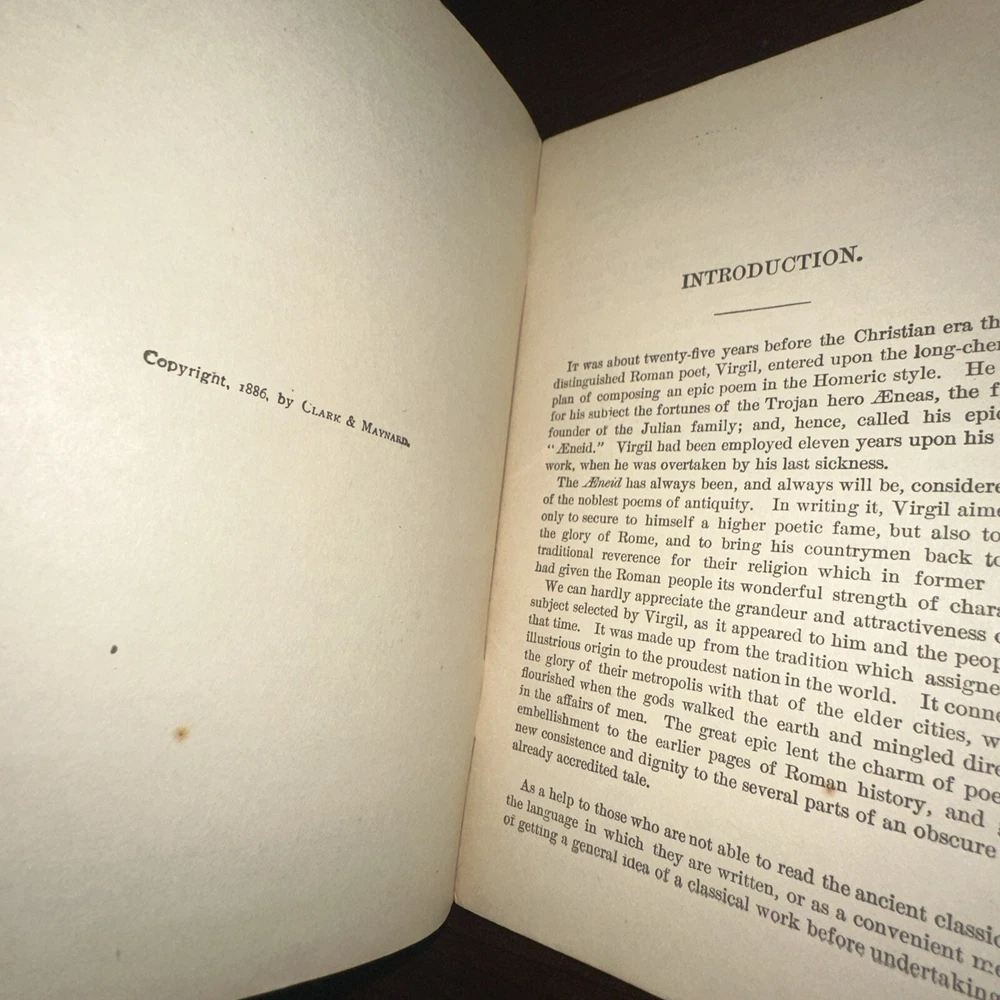 This vintage book from the Maynard's English Classic Series is a must-have for any collector or enthusiast of English literature. With its leather binding, the book exudes an air of elegance and sophistication. The book contains the classic story of Aeneid by Lord Macaulay and was published in 1886. This edition bears the number 58 and was published by Maynard, Merrill & Co. in 1886. The book is in great shape, with normal signs of wear and tear. Its pages are crisp and clean, making it a perfect addition to any collection. This book is a great find for collectors of antiquarian and collectible books and those interested in classics. Add this vintage book to your collection today!