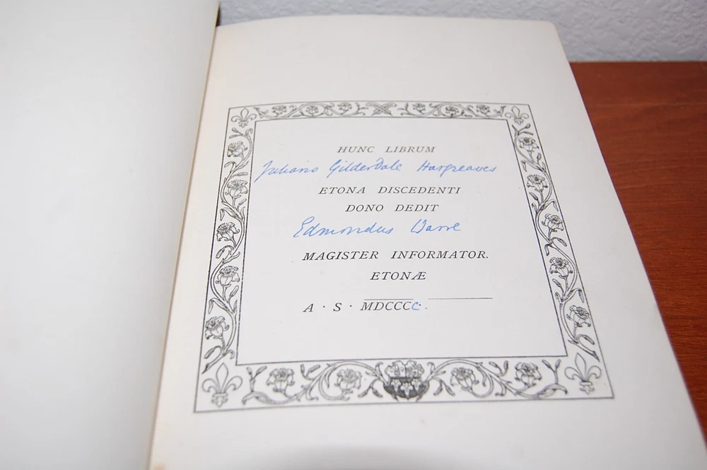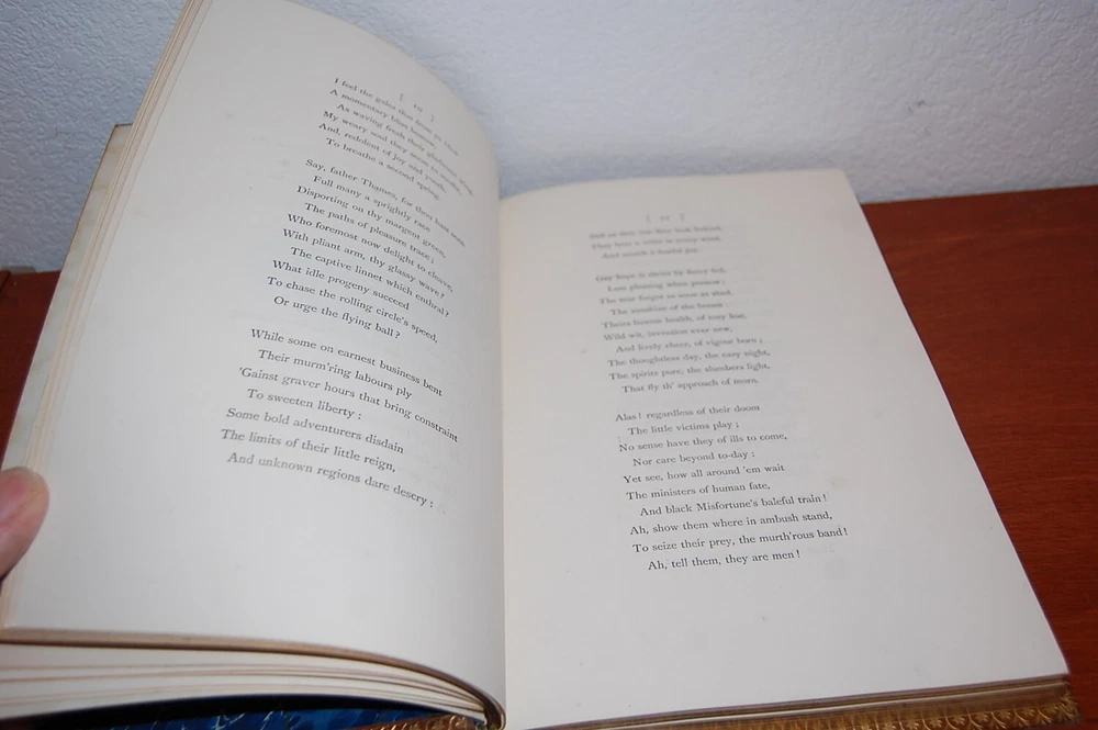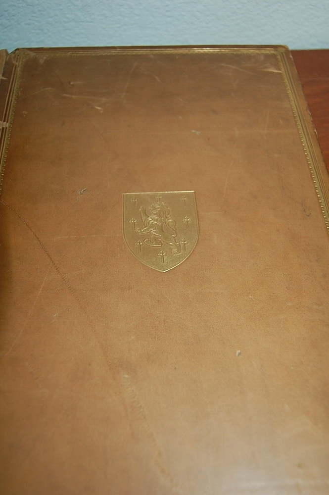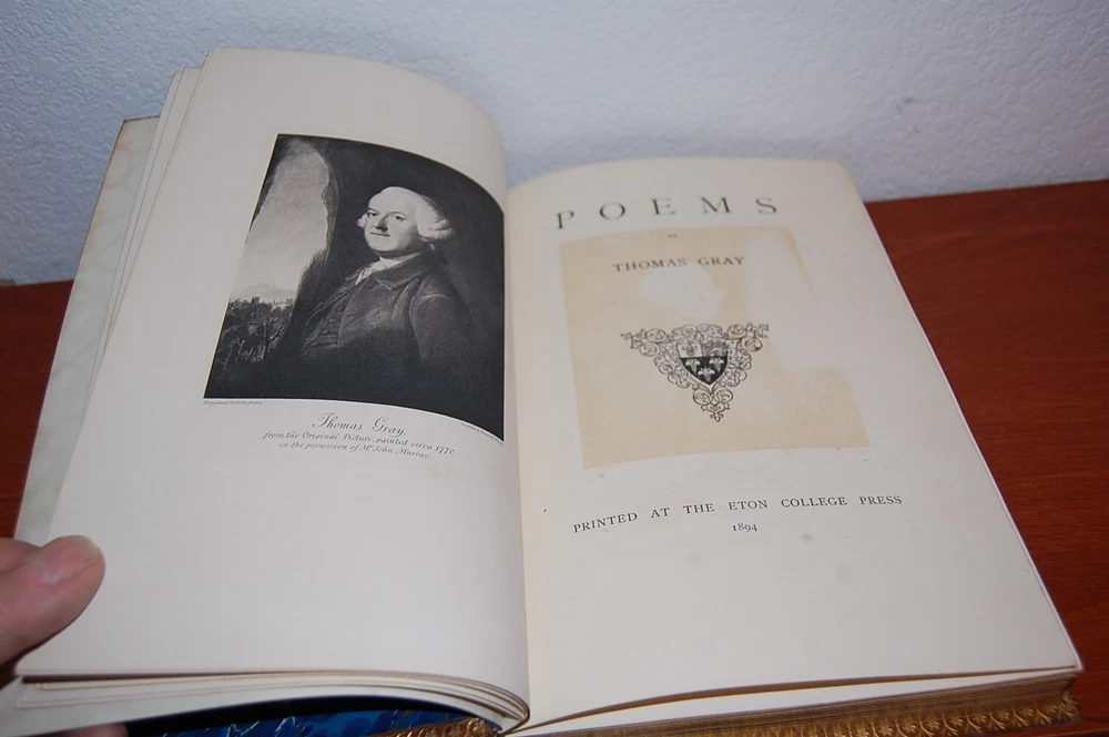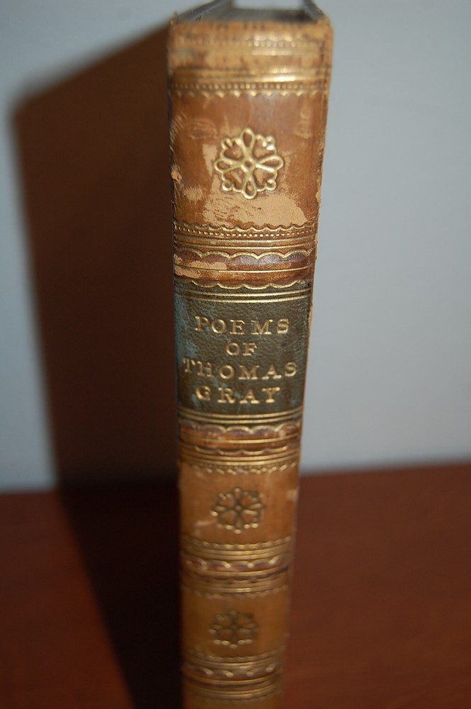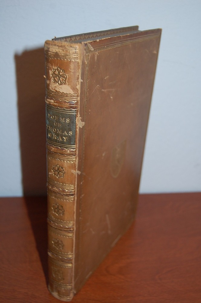 See pics! Gray, Thomas. Poems. Frontispiece portrait; 3 plates. 4to, gilt-decorated Eton College Press, calf binding with the occasional scuffs, spine gilt-in 6 compartments, gilt turn-ins, all edges gilt; rubbed, no foxing. Good endpapers. Previous owners name in Latin dedication on ne of the blank front pages Binding sound.. Overall, very good. Gilt edging is nice with a bump in the center. 164 pages.
