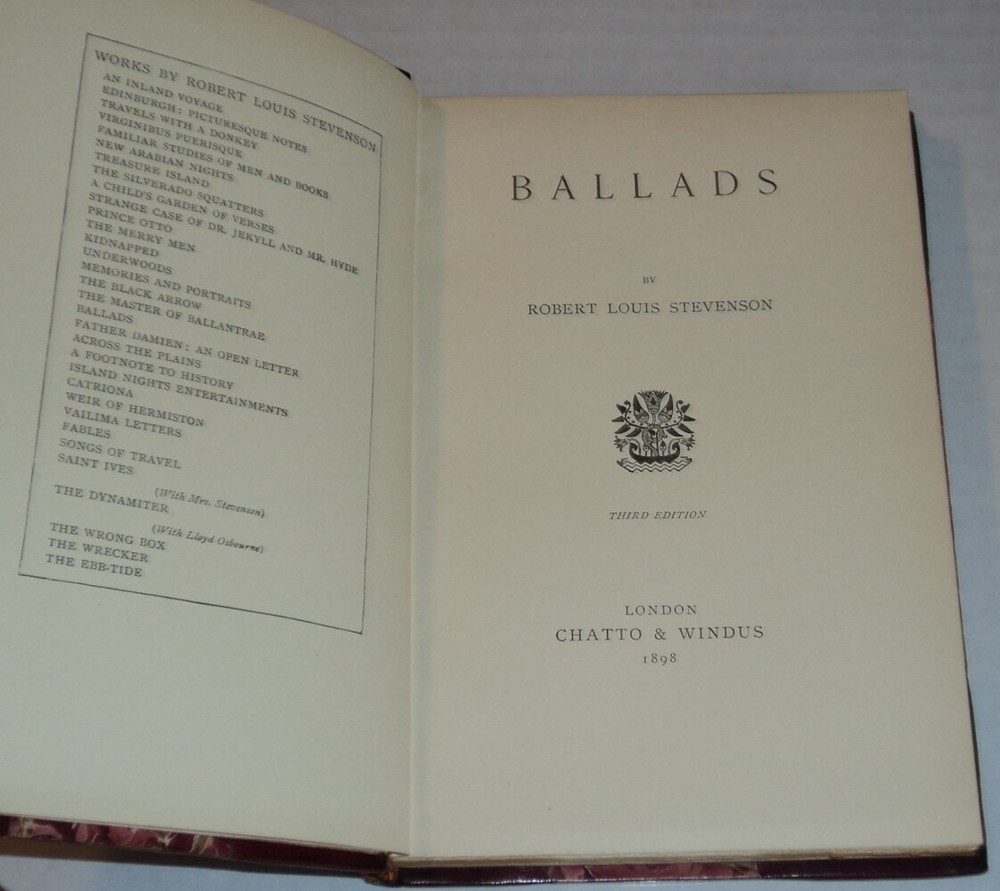 Stevenson, Robert Louis. BALLADS. London: Chatto & Windus, 1898. Octavo, three quarter maroon leather and marbled boards titled in gilt between gilt-ruled raised bands & decorations in gilt on the spine. The top edge is gilt; marbled endpapers. The spine is darkened with its tail chipped. The joints are rubbed. [vi], [1] leaf & 137 pages. Very good. Third edition. From the library of sportsman and medieval arms and armor collector Edward Hubbard Litchfield who owned the 50,000 acre country estate Litchfield Park in the Adirondacks near Tupper Lake. Litchfield's book label is mounted on the front pastedown. TERMS: Shipping charges are calculated based on the total packed weight of this item. New York State residents will be assessed and charged the relevant sales tax. Postage on foreign orders will be assessed and billed at full value. You may request Express Mail or Air Mail service at additional charge. All items are guaranteed authentic and as described. PLEASE E-MAIL FOR EXACT EXPRESS MAIL OR FOREIGN SHIPPING CHARGES! We accept PayPal. Be sure to add me to your favorites list ! Check out my other items !