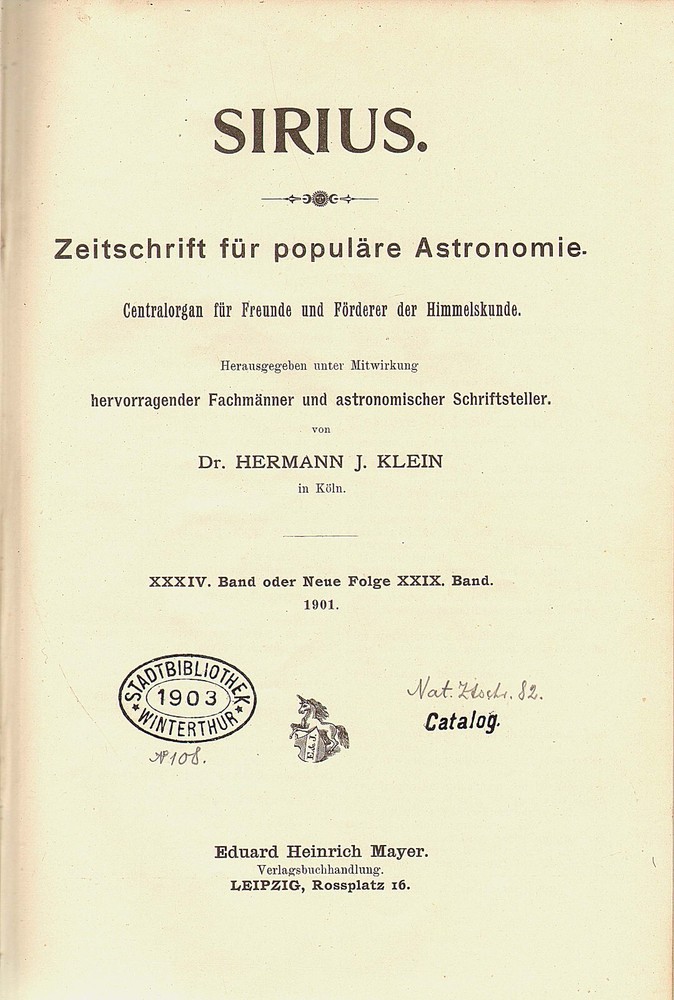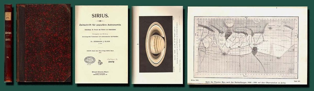 SCARCE 100+ YEAR-OLD GERMAN AMATEUR ASTRONOMY MAGAZINE WITH ILLUSTRATIONS A BOUND YEAR OF SIRIUS MAGAZINE 1901 Includes 16 Plates including drawings of Mars and Saturn, Photos of the Lunar Surface , Spectra of Nova Persei, Drawings of Observatories, etc. Description: Dr. Hermann Klein, editor: SIRIUS: Zeitschrift für Populäre Astronomie, V 29 (New Series, V 34 old series), 12 monthly issues, Leipzig. 1901; 6.5 x 9 in; Pages numbered from 1-288. 16 full page plates . A few charts, mostly of positions of the Jovian or Saturnian Moons. Condition: Hardbound in quarter leather over marbled boards. There is a library stamp on the title page, and a library number on the spine, but otherwise no library marks. Only slight wear at extremities of cover. Interior is clean, tightly bound, and unmarked throughout with crisp page edges and all the 13 plates (several foldout) are in good condition. Overall VG++. Information: An informative and unusual old compilation of popular astronomy articles from Germany, in German, with some seldom-seen illustrations. Articles about: observations of Mars including a drawing as seen by Juvisy observatory(See photos); Drawings of Saturn; Observations of Nova Persei, including a finding chart and spectra (this nova turned out to be one of the first observations of an expanding "light echo"), the rotation of Venus, the death of Lick Observatory's James Keeler, cosmology, astrophotography from Yerkes Observatory, meteor and fireball observations, the rotation of Saturn's rings, comets, etc. etc. A nice addition to any library on astronomy, stars, galaxies, astrophotography, amateur astronomy, history of astronomy, planets, astronomical instruments, telescopes, etc. etc. I have other volumes of this magazine available—please inquire if interested. VISIT MY EBAY STORE FOR OTHER ITEMS OF INTEREST(Click This Link) Please inquire about discounts for purchases of multiple items. Shipping: Free media rate shipping in US. Higher international postage as appropriate (See shipping and payments tab on this listing page for details). We make every attempt to describe items clearly and completely. Please read our listings carefully, inspect posted images of the item, and let us know if you have any questions before you bid. All buyers must pay according to Ebay policies. If you have any questions about this, please email me. International bidders should contact me for a quote on shipping before bidding. Whenever possible, international shipping will be in Priority flat rate envelopes. Import duties, taxes and charges are not included in the item price or shipping charges. These charges are the buyer's responsibility. Please check with your country's customs office to determine what these additional costs will be prior to bidding/buying.