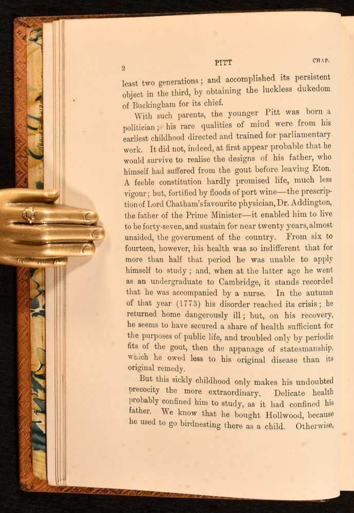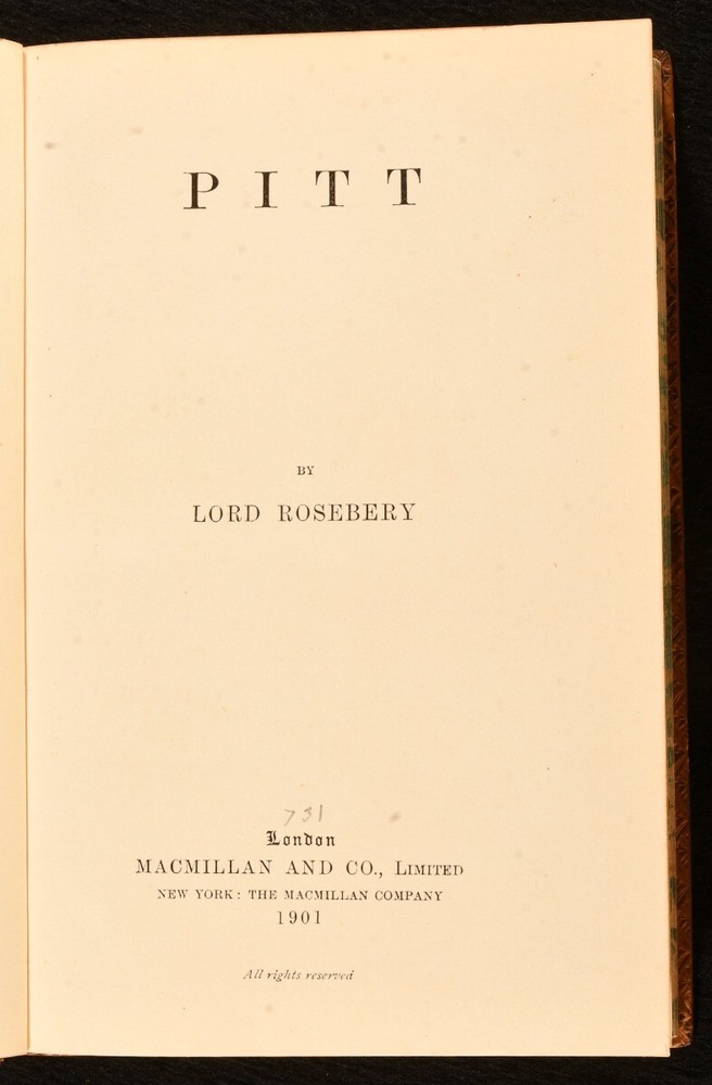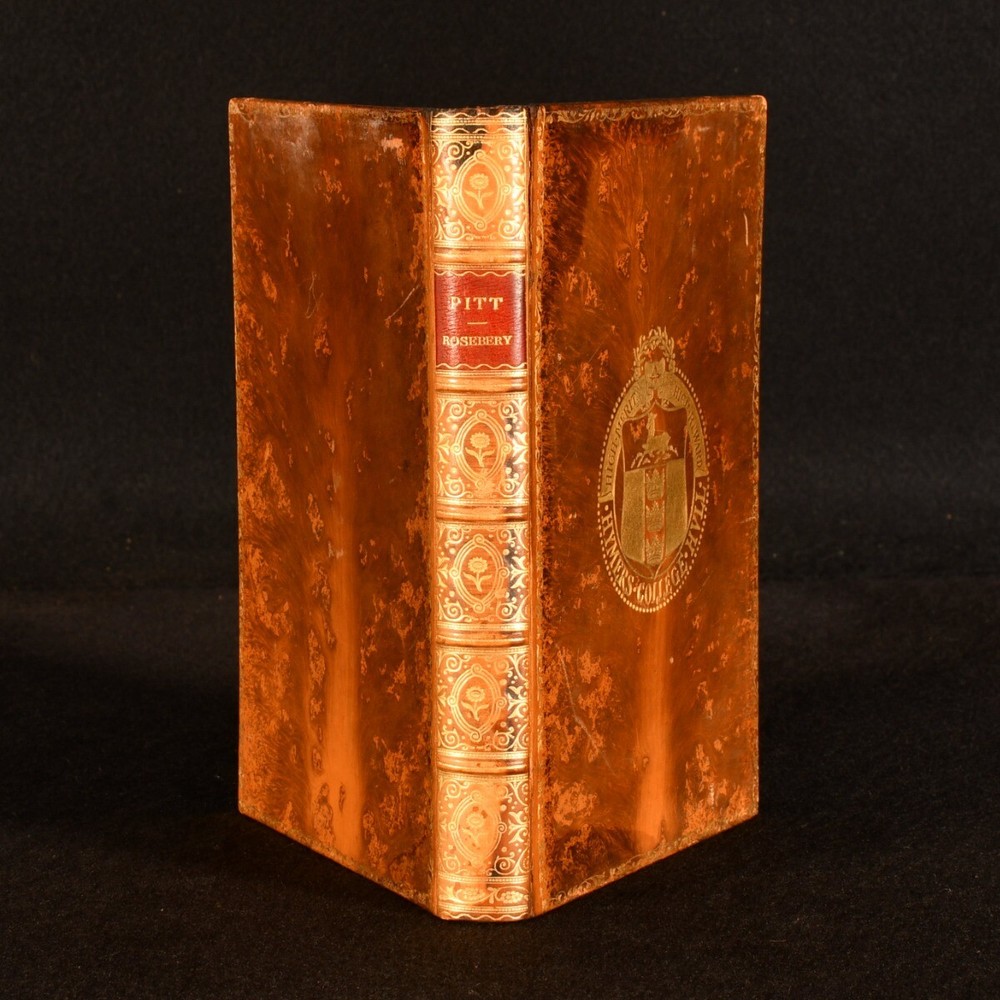 Click here to see our other books! Pitt Lord Rosebery 1901 Macmillan and Co., Limited : London 7.5" by 5" vii, 301pp. SUMMARY Lord Rosebery's biography on the English statesman William Pitt, in a prize tree calf binding. Leather Binding,Original Binding Overall Condition: Very Good This book weighs 0.75 KG when packed UK Postage: £ 3.99 US Postage: £ 19.99 EU Postage : £ 15.99 European Postage: £ 16.99 Asia Postage: £ 21.99 Worldwide Postage: £ 25.99 DESCRIPTION The eighth edition. First published in 1891. Part of the 'Twelve English Statesman' series. Bound in a full tree calf prize binding for 'Hymers College' with their crest to the front. This biography was written by Archibald Philip Primrose, the fifth Earl of Rosebery, a British liberal politician and Prime Minister of the United Kingdom between 1894-5. Rosebery wrote a few biographies in his time on noted figures such as Napoleon and Lord Randolph Churchill. The work provides details on the life of William Pitt the Younger, a British statesman and the youngest and last prime minister of Great Britain before the creation of the United Kingdom. Pitt went on to be Prime Minster again after the Acts of Union in 1800. CONDITION Bound in a full tree calf prize binding for 'Hymers College' with their crest to the front boards. Externally smart with slight marks to the boards, front joint starting to the head and fading to the spine. Bookseller's label to the front pastedown. Internally firmly bound with bright and generally clean pages with light spotting to the front blanks only. Overall Condition: Very Good GLOSSARY OF TERMS Overall Condition (Dustwrapper condition rating is shown after that for the book itself, where a dustwrapper is present) Fine - Very well preserved copy showing very little wear Very Good Indeed - Only one or two minor faults, really a very attractive copy Very Good - Quite a wide term meaning no major faults but probably several smaller ones often expected given the age of the book, but still a respectable copy Good - Meaning not very good. Some more serious faults as will be described in the condition report under 'condition' Good Only - Meaning one or more faults that could really do with repair Fair - As with good only above but with other faults leaving a compromised copy even after repair Poor - Really bad and possibly seriously incomplete. We only sell books in this condition where their rarity or value makes them attractive none the less. Major defects will be described. GUARANTEE We offer a full money back guarantee on our descriptions. Please ask for details and conditions. We prefer PAYPAL. If you pay via PAYPAL we will post the item off the same or the next working day with the postage you have selected. Please note we cannot accept USD cheques