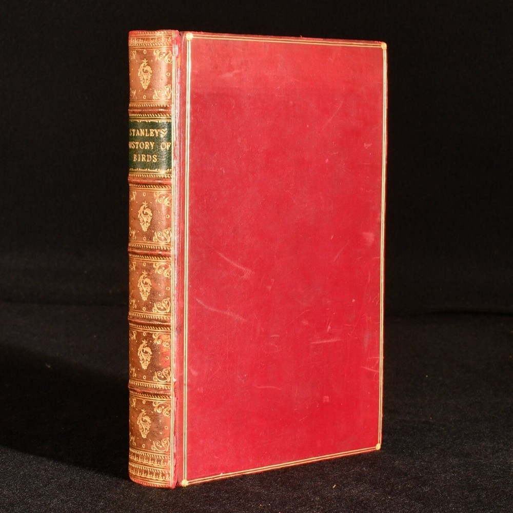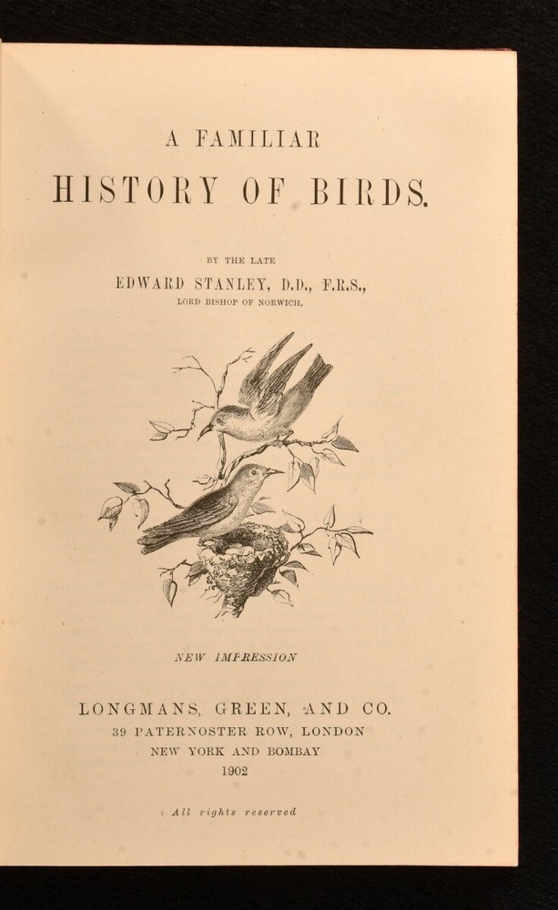 Click here to see our other books! A Familiar History of Birds Edward Stanley 1902 Longmans, Green, and Co. : London 7.5" by 5" xii, 420pp. SUMMARY A smart, leather bound new impression of Edward Stanley's work on the history of birds, with illustrations. Illustrated,Leather Binding,Scarce Overall Condition: Very Good Indeed This book weighs 0.75 KG when packed UK Postage: £ 3.99 US Postage: £ 19.99 EU Postage : £ 15.99 European Postage: £ 16.99 Asia Postage: £ 21.99 Worldwide Postage: £ 25.99 DESCRIPTION Bound in full calf, with gilt tooling to the spine. A new edition. Written by Edward Stanley, the Lord Bishop of Norwich. Stanley provides a comprehensive overview of the subject of birds, covering topics such as their internal structure, flight, their various species and their history. Profusely illustrated with charming vignettes throughout. With the bookplate of Henry Tempest-Hicks to the front paste down. CONDITION In a full calf binding, with gilt decoration. Externally, very smart, with light bumping and rubbing to the extremities and the odd mark to leather. Slight fading to the spine and to the head of the front board. Bookplate to the front paste down. Internally, firmly bound. Pages bright and clean. Overall Condition: Very Good Indeed GLOSSARY OF TERMS Overall Condition (Dustwrapper condition rating is shown after that for the book itself, where a dustwrapper is present) Fine - Very well preserved copy showing very little wear Very Good Indeed - Only one or two minor faults, really a very attractive copy Very Good - Quite a wide term meaning no major faults but probably several smaller ones often expected given the age of the book, but still a respectable copy Good - Meaning not very good. Some more serious faults as will be described in the condition report under 'condition' Good Only - Meaning one or more faults that could really do with repair Fair - As with good only above but with other faults leaving a compromised copy even after repair Poor - Really bad and possibly seriously incomplete. We only sell books in this condition where their rarity or value makes them attractive none the less. Major defects will be described. GUARANTEE We offer a full money back guarantee on our descriptions. Please ask for details and conditions. We prefer PAYPAL. If you pay via PAYPAL we will post the item off the same or the next working day with the postage you have selected. Please note we cannot accept USD cheques