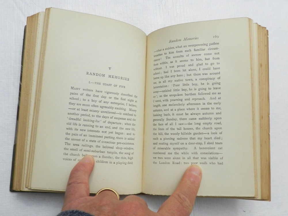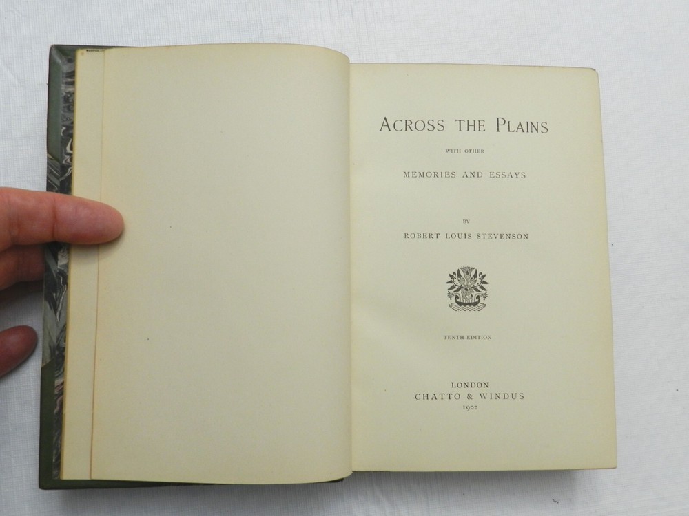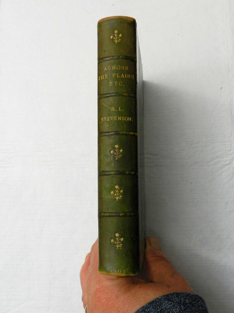 I have four of these uniformly bound 3/4 Leather books by Robert Louis Stevenson. They are all in VERY GOOD OR BETTER CONDITION, and are described similarly. They are privately bound in BEAUTIFUL green leather on spine and corners, with marble boards, matching marble endpapers, gilt page tops. They are very solidly bound with very light corner and edge wear, no interior marks or bookplates. This one is fully titled, Across the Plains With Other Essays and Memories. It is the stated 10th Edition (on title page), published in 1902 by Chatto and Windus. The First Edition was published by the same publishers in 1892, 317 clean and solidly bound pages. This volume consists largely of Stevenson's thoughts as he journeyed by train in 1879 from New York to San Francisco, in pursuit of the American woman he had recently met on the Continent (and who was to become his wife). Also included are his subsequent impressions of the city of Monterey. B141