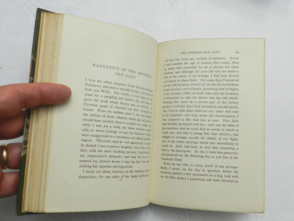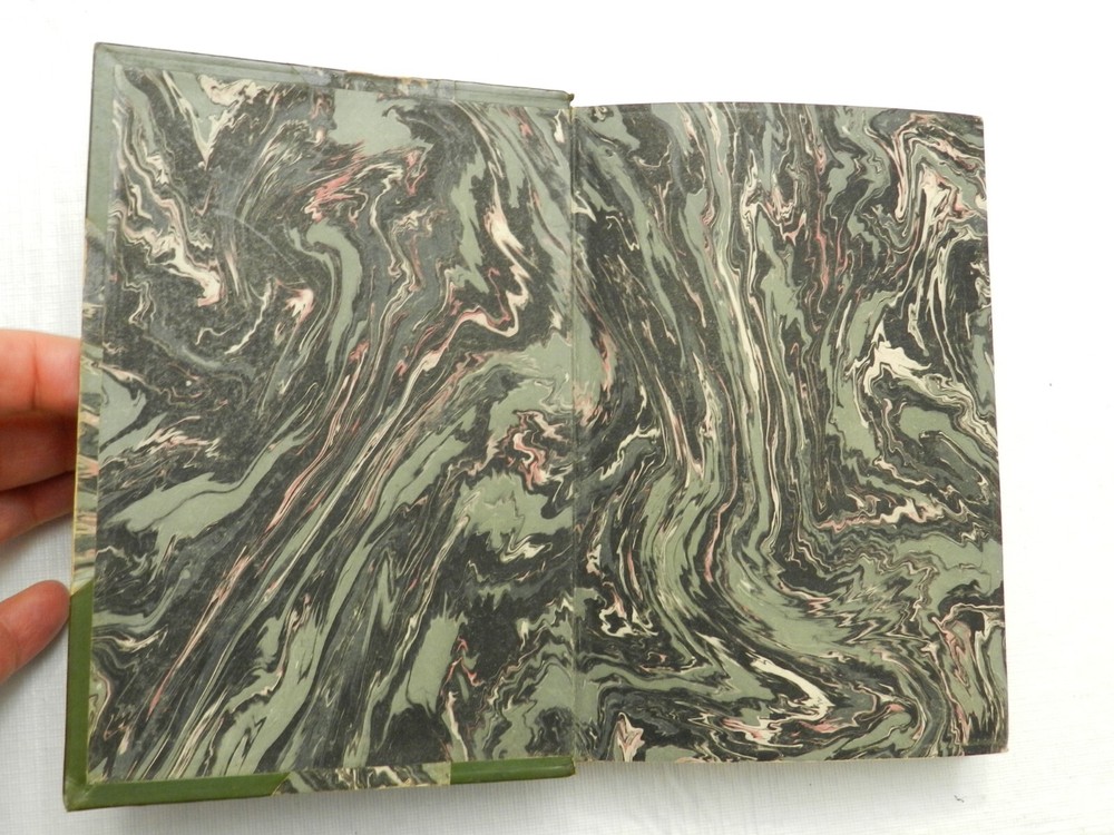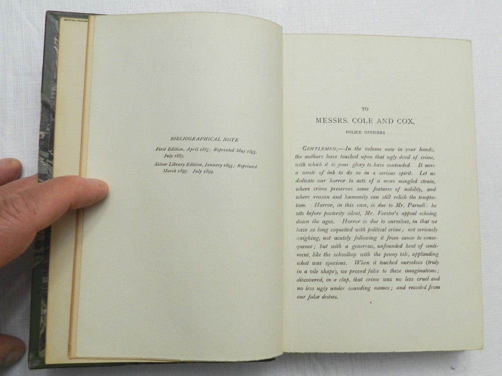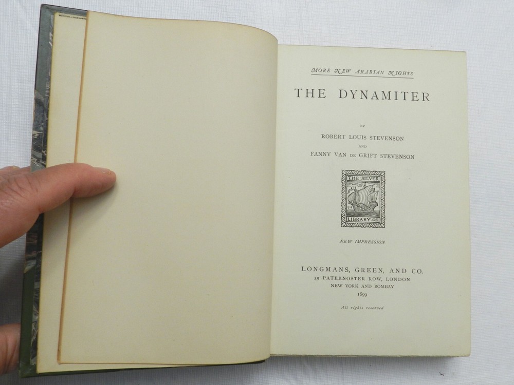 I have four of these uniformly bound 3/4 Leather books by Robert Louis Stevenson. They are all in VERY GOOD OR BETTER CONDITION, and are described similarly. They are privately bound in BEAUTIFUL green leather on spine and corners, with marble boards, matching marble endpapers, gilt page tops. They are very solidly bound with very light corner and edge wear, no interior marks or bookplates. This one is fully titled, More New Arabian Nights : The Dynamiter and it was authored by Robert Louis Stevenson and his wife, Fanny Van de Grift Stevenson. It is a later printing in 1899 - a "New Impression" as stated on the title page. The First Printing by the same publisher, Longmans Green & Co, was published in 1885 (unclear which number publication this is, as there were two formats identified on the copyright page; see listing photo). 312 clean and solidly bound pages. This volume consists of crime short stories by RL Stevenson and his wife. B141