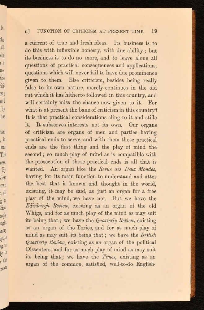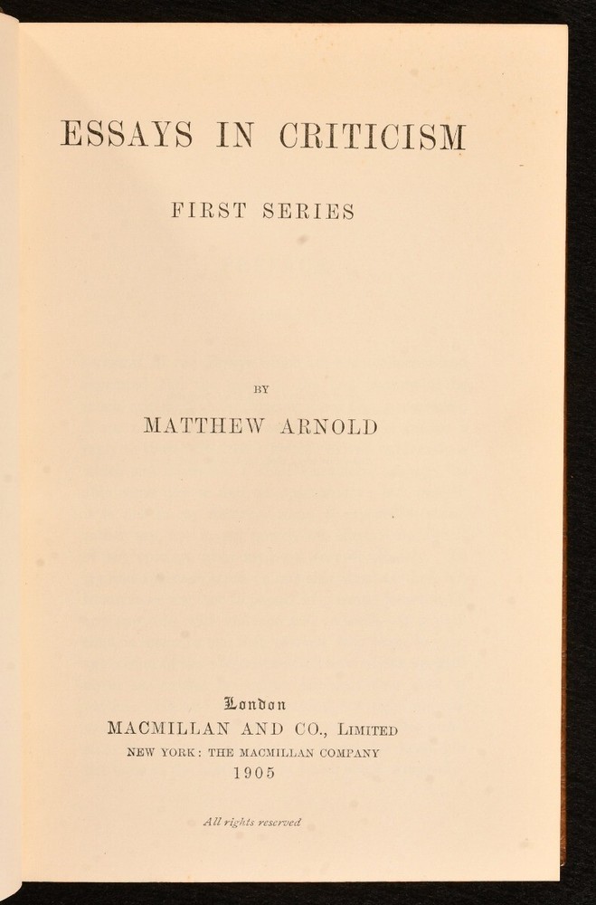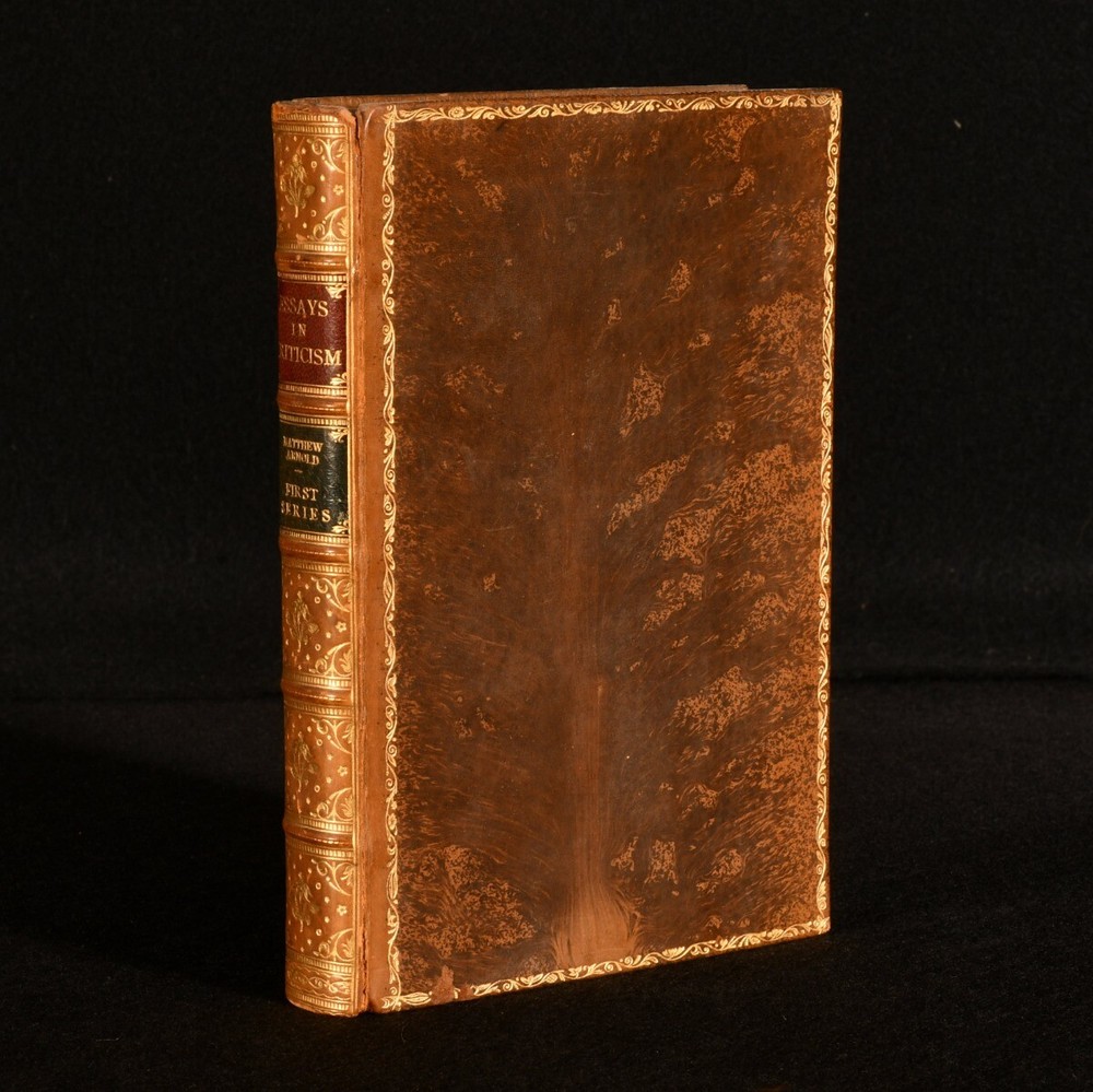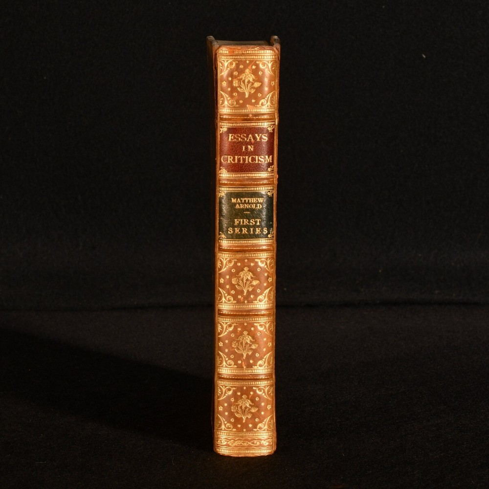 Click here to see our other books! Essays in Criticism: First Series Matthew Arnold 1905 Macmillan and Co., Limited : London 7" by 5" xi, 379pp. SUMMARY A finely bound copy of the first series of Essays in Criticism from English cultural critic Matthew Arnold, bound by Bickers & Son. Fine Binding,Leather Binding Overall Condition: Very Good This book weighs 0.75 KG when packed UK Postage: £ 3.99 US Postage: £ 19.99 EU Postage : £ 15.99 European Postage: £ 16.99 Asia Postage: £ 21.99 Worldwide Postage: £ 25.99 DESCRIPTION Later edition. A collection of essays on criticism which remains a significant authority on critics to this day. His prefatory essay, "The Function of Criticism at the Present Time", is one of the most influential essays written on the role of the critic in identifying and elevating literature. Written by Matthew Arnold, an English poet and cultural critic. Bound by Bickers & Son, Leicester. CONDITION Bound in full tree calf. Externally, very smart with minor wear to the extremities and light fading to the spine. Head and tail of the joints starting. Front hinge just starting but firm. Internally, firmly bound. Pages are very bright and clean with minor age toning to the endpapers. School prize bookplate to the front pastedown. Overall Condition: Very Good GLOSSARY OF TERMS Overall Condition (Dustwrapper condition rating is shown after that for the book itself, where a dustwrapper is present) Fine - Very well preserved copy showing very little wear Very Good Indeed - Only one or two minor faults, really a very attractive copy Very Good - Quite a wide term meaning no major faults but probably several smaller ones often expected given the age of the book, but still a respectable copy Good - Meaning not very good. Some more serious faults as will be described in the condition report under 'condition' Good Only - Meaning one or more faults that could really do with repair Fair - As with good only above but with other faults leaving a compromised copy even after repair Poor - Really bad and possibly seriously incomplete. We only sell books in this condition where their rarity or value makes them attractive none the less. Major defects will be described. GUARANTEE We offer a full money back guarantee on our descriptions. Please ask for details and conditions. We prefer PAYPAL. If you pay via PAYPAL we will post the item off the same or the next working day with the postage you have selected. Please note we cannot accept USD cheques