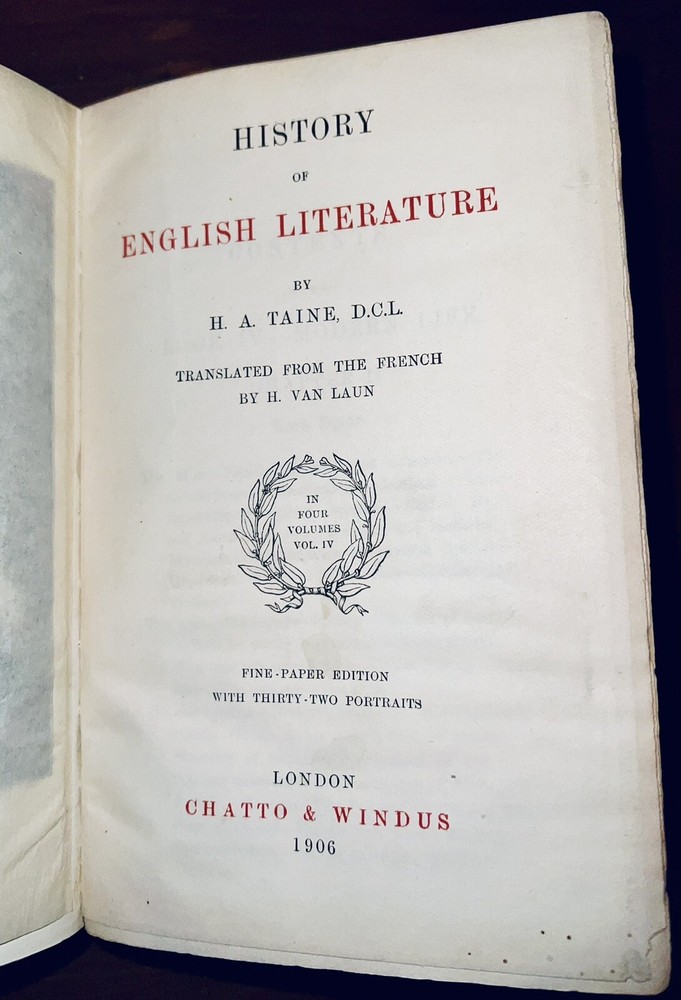 Even though there is some water damage on the outer cover, the inside of the book seems to be not harmed. The outer leather is super soft . Please look at all pictures and let me know if you have any questions. This 1906 book titled "History of English Literature" by H.A. Taine is a beautiful addition to any collection. The leather bound book was published by Chatto & Windus in London and features illustrations throughout. The book covers the history of English literature and is in its original form printed in 1906. The book has not been personalized or signed. It is a must-have for anyone interested in the history of literature and belongs to the books and magazines category. The unit quantity is one and the language is English. This book is a special gem for collectors and enthusiasts alike.