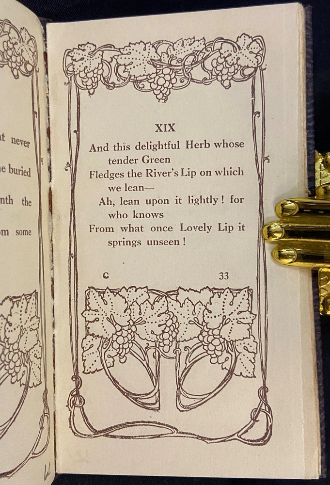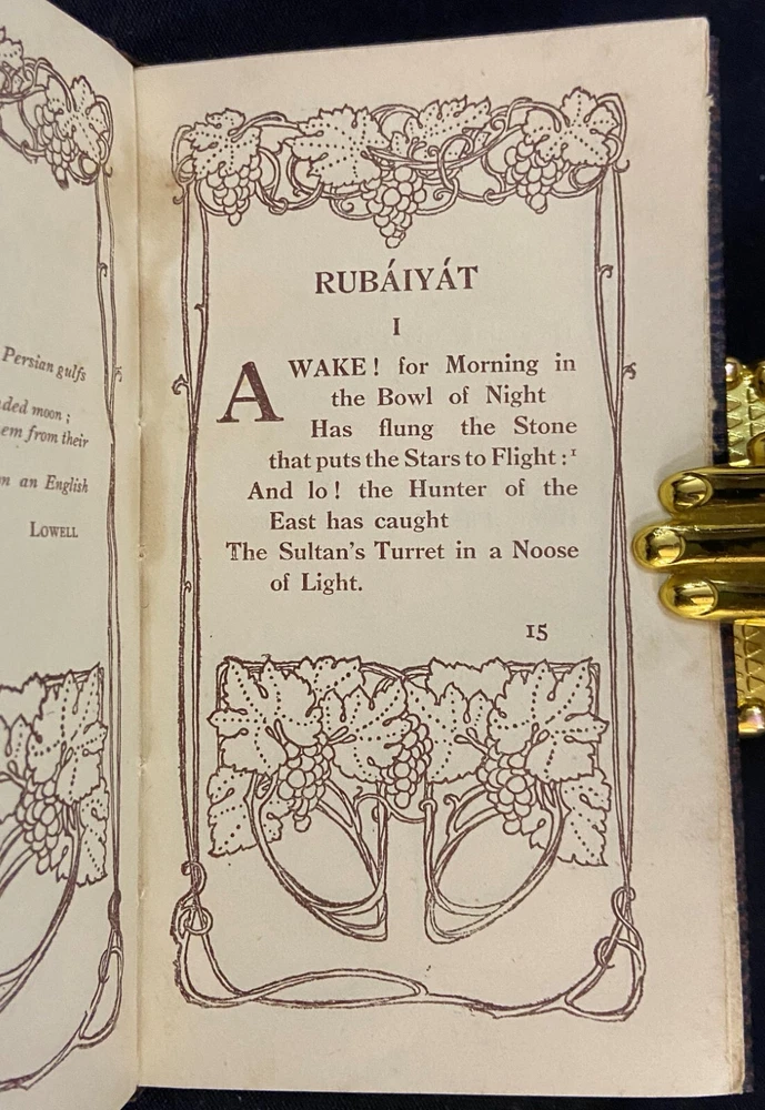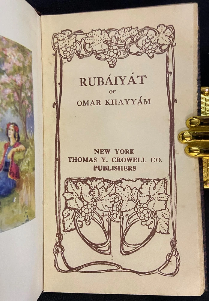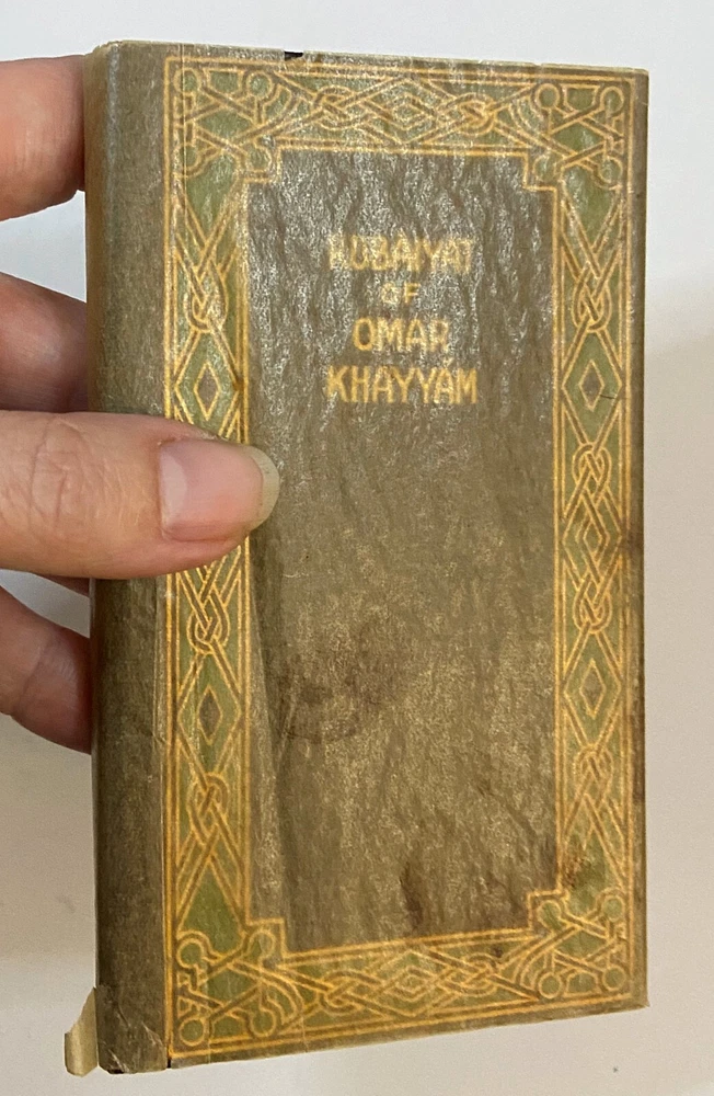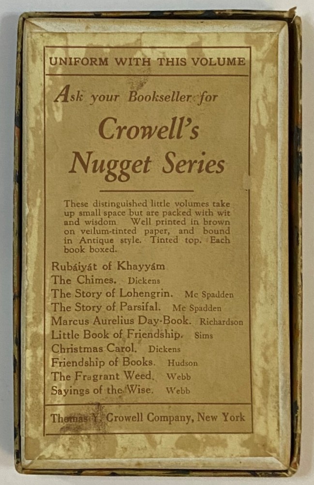 Lovely pocket-sized edition of The Rubaiyat of Omar Khayyam from Crowell's Nugget Series which comes with its original box . The book is overall in very good condition with just some minor signs of wear and age. There is no printed publishing date, but the book is circa sometime around the 1910's-1920's. The book still has its original glassine wrapper which has some mild soiling and some small chips and tears. The box also has some mild soiling and wear but is still in good condition. The interior of the book is lightly toned from age but is mostly nice and clean with just some occasional light foxing & grubbiness. The book measures approximately 5 1/4 inches by 3 inches and the box measures approximately 5 3/4 inches by 3 1/2 inches. Please look at all of the photos to further note the condition.