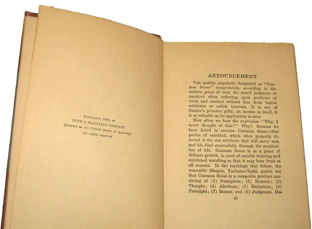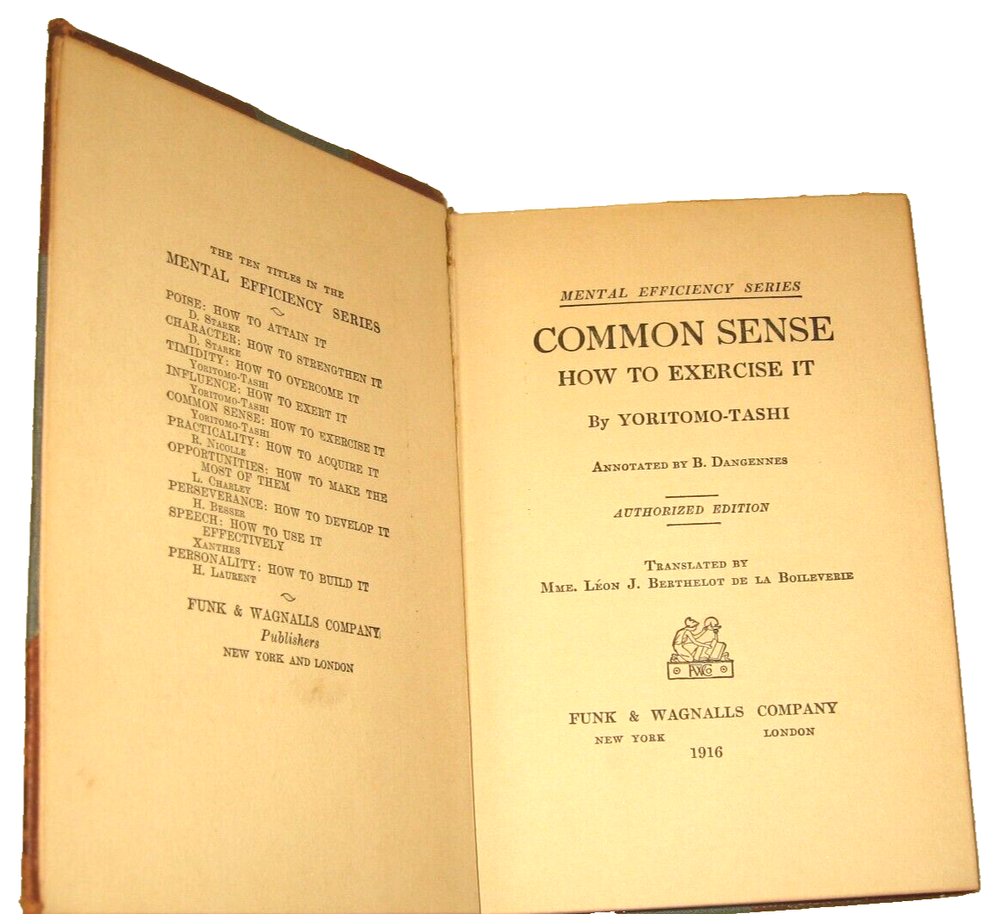 We do have a little French Bulldog-Louie-so while all attempts are taken to ensure no errant hairs have made their way onto this item-it is a possibility-so if you or someone in your home are highly allergic this may not be a good source for you. He also attends doggie daycare on a pretty regular basis-so while we do not own a cat-there is a very remote possibility that another dog may transfer their hair or fur or a cat's hair to our dog. WE DO NOT OWN A CAT! Please take a quick moment to read through the entire item description section below before placing your bid. I post measurements as a "courtesy" only-measurements are taken flat and un-stretched-but please do know your general size as I do not accept returns. If you are new to Ebay or have a feedback score of less than 10 please contact me before placing a bid.... Excellent authorized publication 1916 first edition with copyright 1915 by publishers Funk & Wagnalls Company New York/London 1916 ~ Mental Efficiency Common Sense How To Exercise It book number 5 by Japanese scholar Yoritomo-Tashi annotated by B. Dangennes ~ translated by Dora Knowlton Ranous and Herbert G. Wintersgill ~ 183 pages ~ book number 5 in the series ~ features are noted above Condition is excellent for the age/book was in a glass fronted bookcase with the expected minor wear to the edges and top/bottom of gilted leather spine with minor wear to the leather tips as expected-there is no writing on the interior pages ~ very small yellowed rectangular 3/4"x1/4" mark at front cover page...sticker or tag? ~ overall condition is excellent for the age....... Book measures approximately: 7 1/4" x 4.75" x 1 1/8"