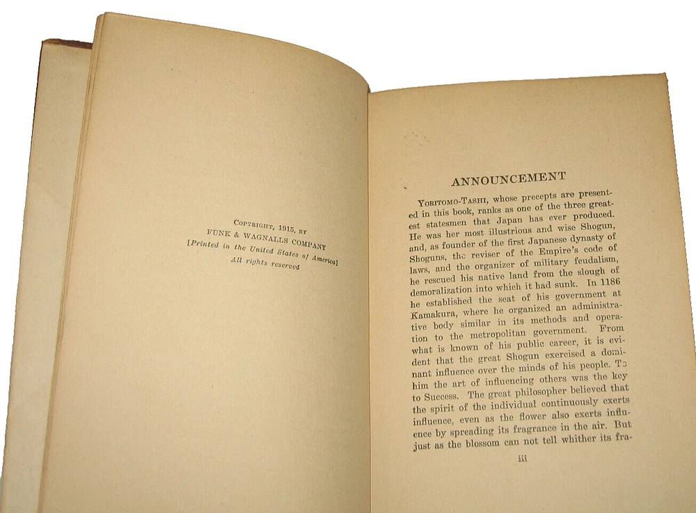 We do have a little French Bulldog-Louie-so while all attempts are taken to ensure no errant hairs have made their way onto this item-it is a possibility-so if you or someone in your home are highly allergic this may not be a good source for you. He also attends doggie daycare on a pretty regular basis-so while we do not own a cat-there is a very remote possibility that another dog may transfer their hair or fur or a cat's hair to our dog. WE DO NOT OWN A CAT! Please take a quick moment to read through the entire item description section below before placing your bid. I post measurements as a "courtesy" only-measurements are taken flat and un-stretched-but please do know your general size as I do not accept returns. If you are new to Ebay or have a feedback score of less than 10 please contact me before placing a bid.... Excellent authorized publication 1916 first edition with copyright 1915 by publishers Funk & Wagnalls Company New York/London 1916 ~ Influence How To Exert It by Japanese scholar Yoritomo-Tashi annotated by B. Dangennes ~ translated by Dora Knowlton Ranous and Herbert G. Wintersgill ~ 188 pages ~ book number 4 in the series ~ features are noted above Condition is excellent for the age/book was in a glass fronted bookcase with the expected minor wear to the edges and top/bottom of gilted leather spine with minor wear to the leather tips as expected-there is not writing on the interior pages with one teeny bend on one page only and a very small yellowed rectangular 3/4"x1/4" mark at front cover page...sticker or tag?...uncertain but overall condition is excellent for the age....... Book measures approximately: 7 1/4" x 4.75" x 1 1/8"