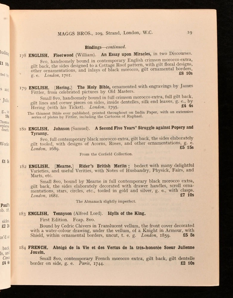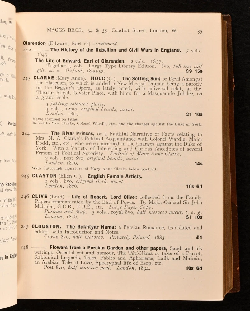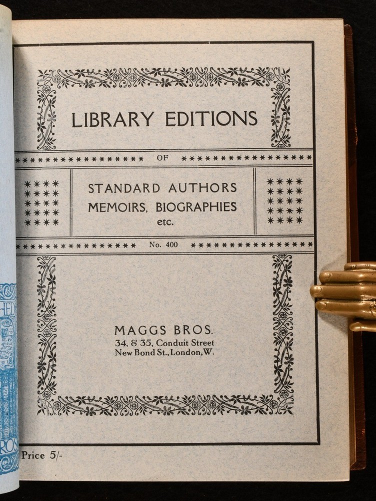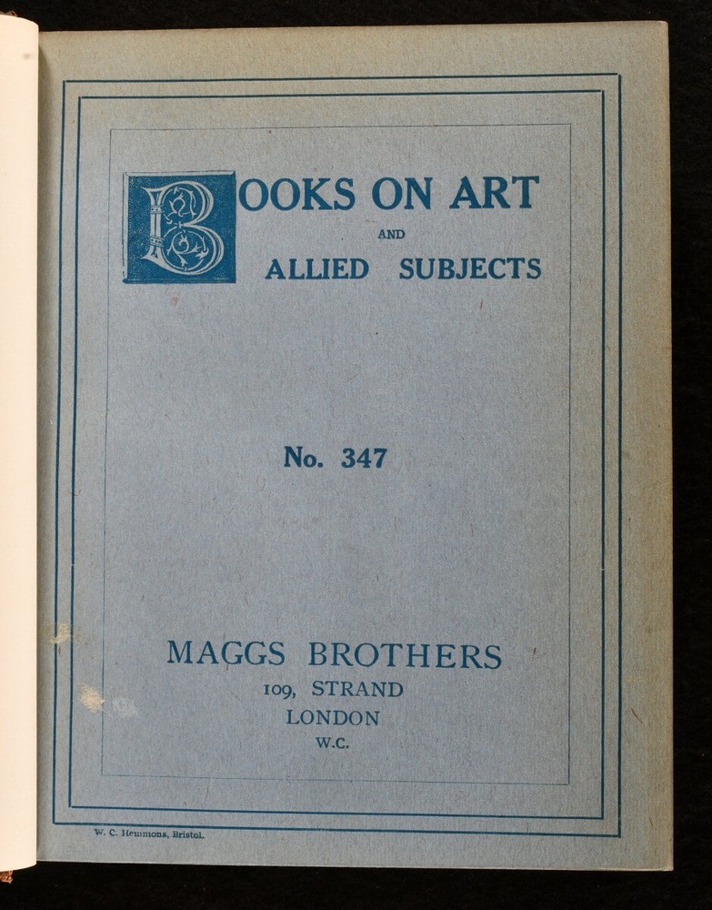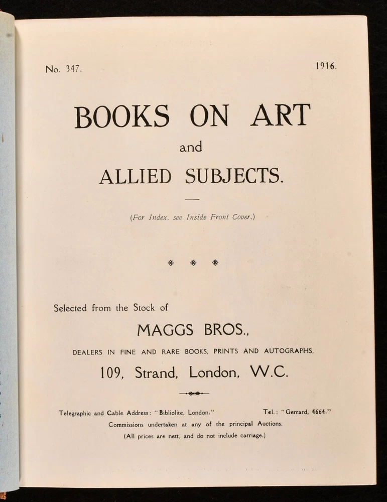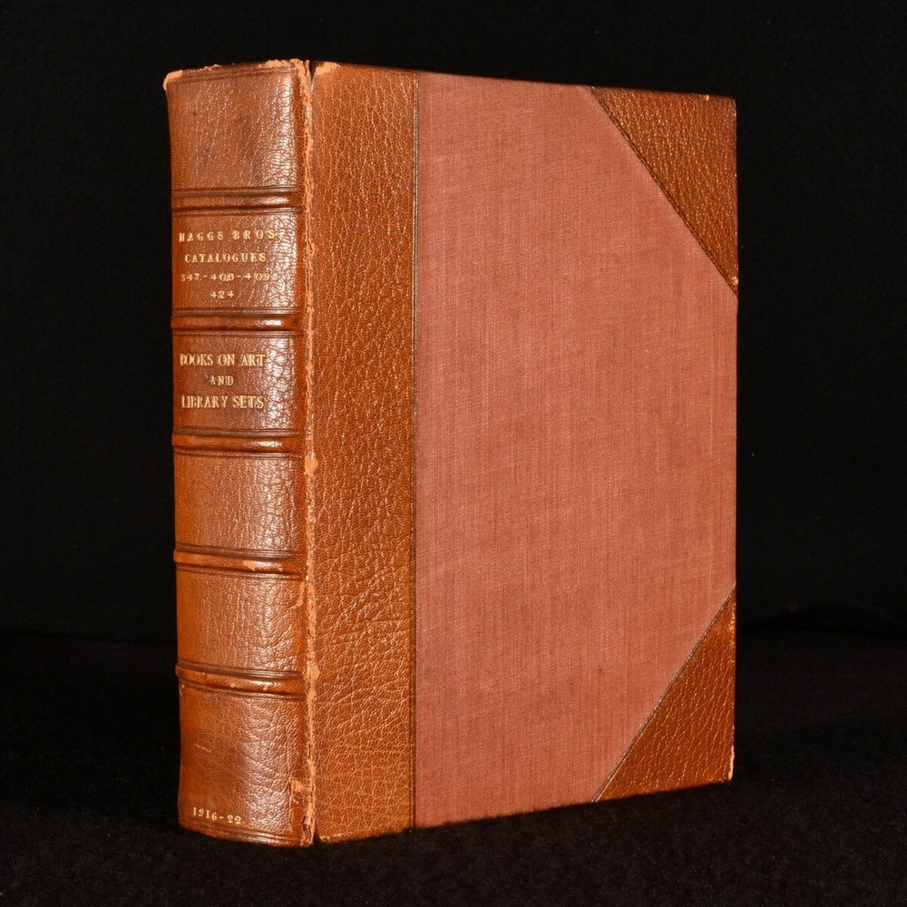Click here to see our other books! Books on Art and Allied Subjects Nos. 347, 400, 409, 424 Various 1916-22 Maggs Brothers : London 8" by 6.5" 152; 216; 288; 270pp. SUMMARY A catalogue from the stock of Maggs Bros, four volumes in one. Leather Binding,Pleasing Copy,Rebound Overall Condition: Very Good This book weighs 1.5 KG when packed UK Postage: £ 3.99 US Postage: £ 23.99 EU Postage : £ 18.99 European Postage: £ 19.99 Asia Postage: £ 31.99 Worldwide Postage: £ 32.99 DESCRIPTION A series of four catalogues from 'Books on Art and Allied Subjects' and 'Library Editions of Standard Authors, Memoirs, Bibliographies,' &c. selected from the stock of Maggs Bros., dealers in fine and rare books, prints, and autographs. Bound in one volume with original front and rear wraps of each volume bound in. Containing No. 347 for 1916 and No. 409 for 1921 of Books on Art and Allied Subjects ; and Library Editions of Standard Authors, Memoirs, Biographies, etc. No. 400 Christmas, 1920, and No. 424 for 1922. CONDITION Rebound in half crushed morocco binding over cloth covered boards, with five raised bands, gilt to edges, marbled endpapers, original wraps bound in. Externally sound with shelf wear, rubbing to extremities of spine, joints and boards. Internally, firmly bound. Pages bright and clean. Overall Condition: Very Good GLOSSARY OF TERMS Overall Condition (Dustwrapper condition rating is shown after that for the book itself, where a dustwrapper is present) Fine - Very well preserved copy showing very little wear Very Good Indeed - Only one or two minor faults, really a very attractive copy Very Good - Quite a wide term meaning no major faults but probably several smaller ones often expected given the age of the book, but still a respectable copy Good - Meaning not very good. Some more serious faults as will be described in the condition report under 'condition' Good Only - Meaning one or more faults that could really do with repair Fair - As with good only above but with other faults leaving a compromised copy even after repair Poor - Really bad and possibly seriously incomplete. We only sell books in this condition where their rarity or value makes them attractive none the less. Major defects will be described. GUARANTEE We offer a full money back guarantee on our descriptions. Please ask for details and conditions. We prefer PAYPAL. If you pay via PAYPAL we will post the item off the same or the next working day with the postage you have selected. Please note we cannot accept USD cheques