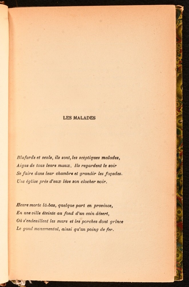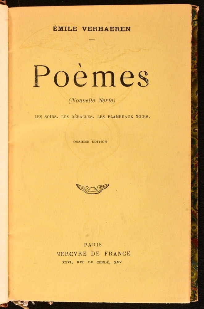 Click here to see our other books! Poemes Emile Verhaeren 1917 Mercure de France : Paris 7.5" by 5" 214pp. SUMMARY A scarce edition of this collection of poetry, in the original French language. Leather Binding,Original Binding,Publishers' Original Binding,Scarce Overall Condition: Very Good Indeed This book weighs 0.75 KG when packed UK Postage: £ 3.99 US Postage: £ 19.99 EU Postage : £ 15.99 European Postage: £ 16.99 Asia Postage: £ 21.99 Worldwide Postage: £ 25.99 DESCRIPTION French language. Scarce edition. A collection of poetry, including titles such as: Humanite, Illusion, Les Arbres, Le Glaive, Pieusement, Le Meurtre, and many others. Written by Emile Verhaeren, a Belgian poet and art critic who wrote in the French language. Remembered as one of the founders of the school of Symbolism, and a six-time nominee of the Nobel Prize in Literature. CONDITION Bound in quarter calf with patterned boards. Externally, very smart with light shelf wear and minor rubbing to the extremities. Original paper boards are bound in. Internally, firmly bound. Pages are very bright and clean with light age toning. Overall Condition: Very Good Indeed GLOSSARY OF TERMS Overall Condition (Dustwrapper condition rating is shown after that for the book itself, where a dustwrapper is present) Fine - Very well preserved copy showing very little wear Very Good Indeed - Only one or two minor faults, really a very attractive copy Very Good - Quite a wide term meaning no major faults but probably several smaller ones often expected given the age of the book, but still a respectable copy Good - Meaning not very good. Some more serious faults as will be described in the condition report under 'condition' Good Only - Meaning one or more faults that could really do with repair Fair - As with good only above but with other faults leaving a compromised copy even after repair Poor - Really bad and possibly seriously incomplete. We only sell books in this condition where their rarity or value makes them attractive none the less. Major defects will be described. GUARANTEE We offer a full money back guarantee on our descriptions. Please ask for details and conditions. We prefer PAYPAL. If you pay via PAYPAL we will post the item off the same or the next working day with the postage you have selected. Please note we cannot accept USD cheques