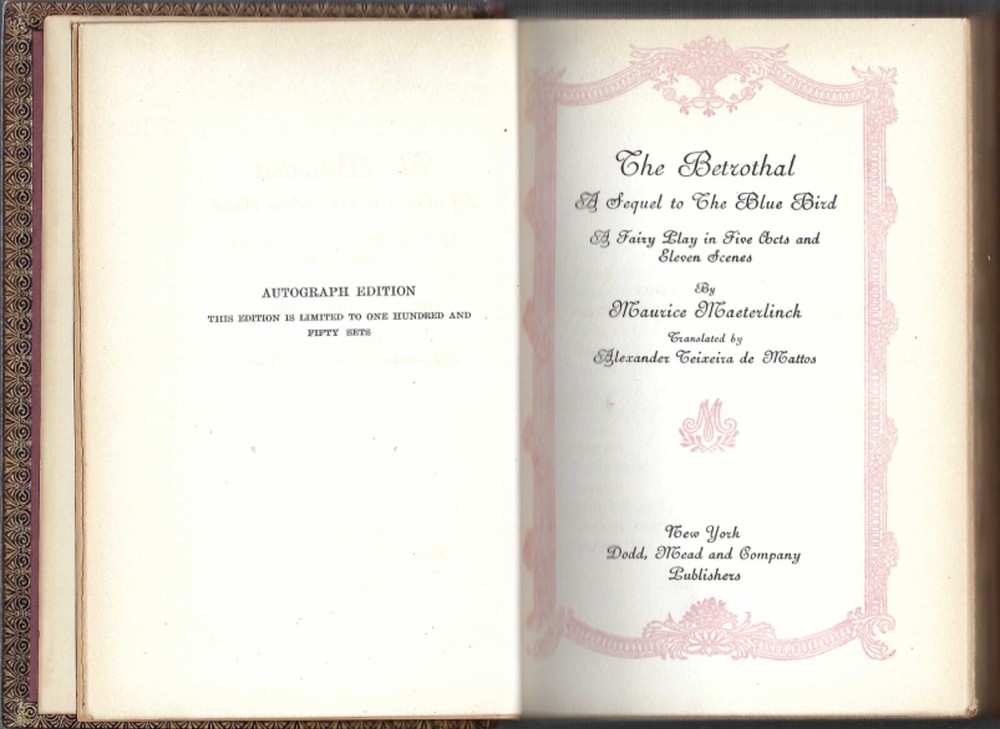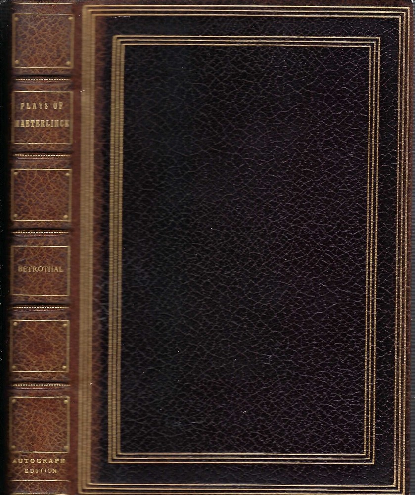 This autograph edition of " The Betrothal " by Maurice Maeterlinck is a rare find for collectors of literature and poetry. The book, published by Dodd, Mead and Company in 1918, features the original text in English and is bound in leather. The play, is a masterpiece of Maeterlinck's writing style and is sure to captivate any reader. This book is a must-have for anyone interested in the history of literature and the evolution of poetry. GOOD, some cover wear, pgs. tanned, some pages uncut, top edge gilt, felt tip inked number on back of title page, bookplate, NOT AUTOGRAPHED !! (only the first volume is signed). This would be volume 12.
