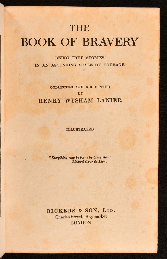Click here to see our other books! The Book of Bravery: Being True Stories in an Ascending Scale of Courage Henry Wysham Lanier 1918 Bickers & Son : London 8" by 5.5" xiv, 420pp. SUMMARY A smartly bound first edition of this scarce collection of stories on bravery, with illustrations. Bound by Bickers & Son. First Edition,Illustrated,Leather Binding,Scarce Overall Condition: Very Good Indeed This book weighs 0.75 KG when packed UK Postage: £ 3.99 US Postage: £ 19.99 EU Postage : £ 15.99 European Postage: £ 16.99 Asia Postage: £ 21.99 Worldwide Postage: £ 25.99 DESCRIPTION First edition. Scarce work. Illustrated with a frontispiece and fifteen plates. Collated complete. A collection of short stories on bravery, with tales of facing death, treasure-seekers, soldiers who knew no fear, exploits at sea, and famous deeds of discipline. Collected and recounted by Henry Wysham Lanier, an American author and professor. Bound by Bickers & Son, London. CONDITION Bound in full tree calf with gilt. Externally, very smart with light rubbing to the extremities and fading to the spine. Front hinge just starting but firm. Internally, firmly bound. Pages are very bright with the odd spot. Light spotting to the first and last few pages. Contemporary ink inscription to the front endpaper. Overall Condition: Very Good Indeed GLOSSARY OF TERMS Overall Condition (Dustwrapper condition rating is shown after that for the book itself, where a dustwrapper is present) Fine - Very well preserved copy showing very little wear Very Good Indeed - Only one or two minor faults, really a very attractive copy Very Good - Quite a wide term meaning no major faults but probably several smaller ones often expected given the age of the book, but still a respectable copy Good - Meaning not very good. Some more serious faults as will be described in the condition report under 'condition' Good Only - Meaning one or more faults that could really do with repair Fair - As with good only above but with other faults leaving a compromised copy even after repair Poor - Really bad and possibly seriously incomplete. We only sell books in this condition where their rarity or value makes them attractive none the less. Major defects will be described. GUARANTEE We offer a full money back guarantee on our descriptions. Please ask for details and conditions. We prefer PAYPAL. If you pay via PAYPAL we will post the item off the same or the next working day with the postage you have selected. Please note we cannot accept USD cheques